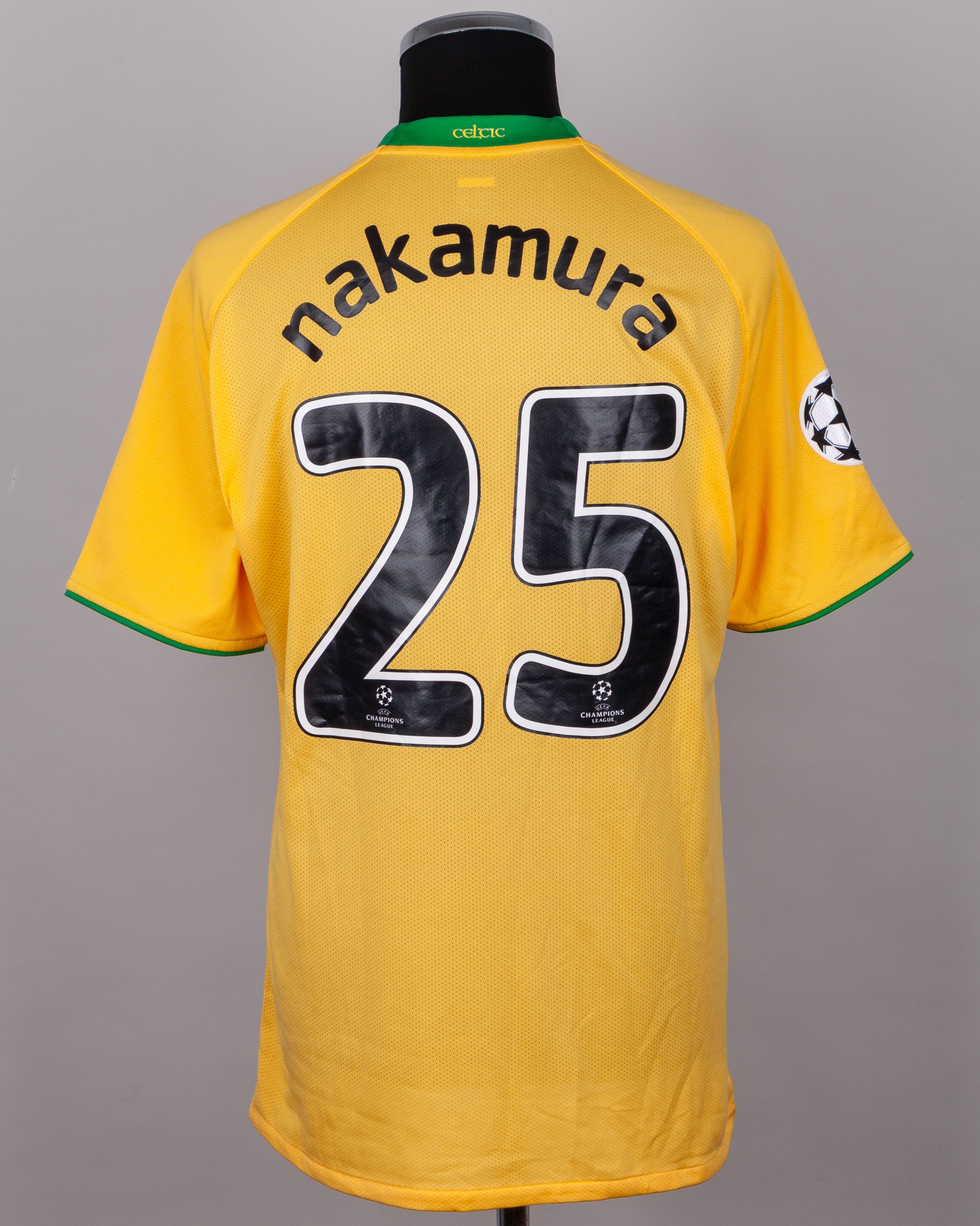 Shunsuke Nakamura yellow No.25 Celtic v. Manchester United short-sleeved shirt, 2008, Nike, XL, with crew-neck collar and embroidered cloth badge inscribed THE CELTIC FOOTBALL CLUB 1888, the reverse lettered nakamura, the right sleeve with Champions League flash