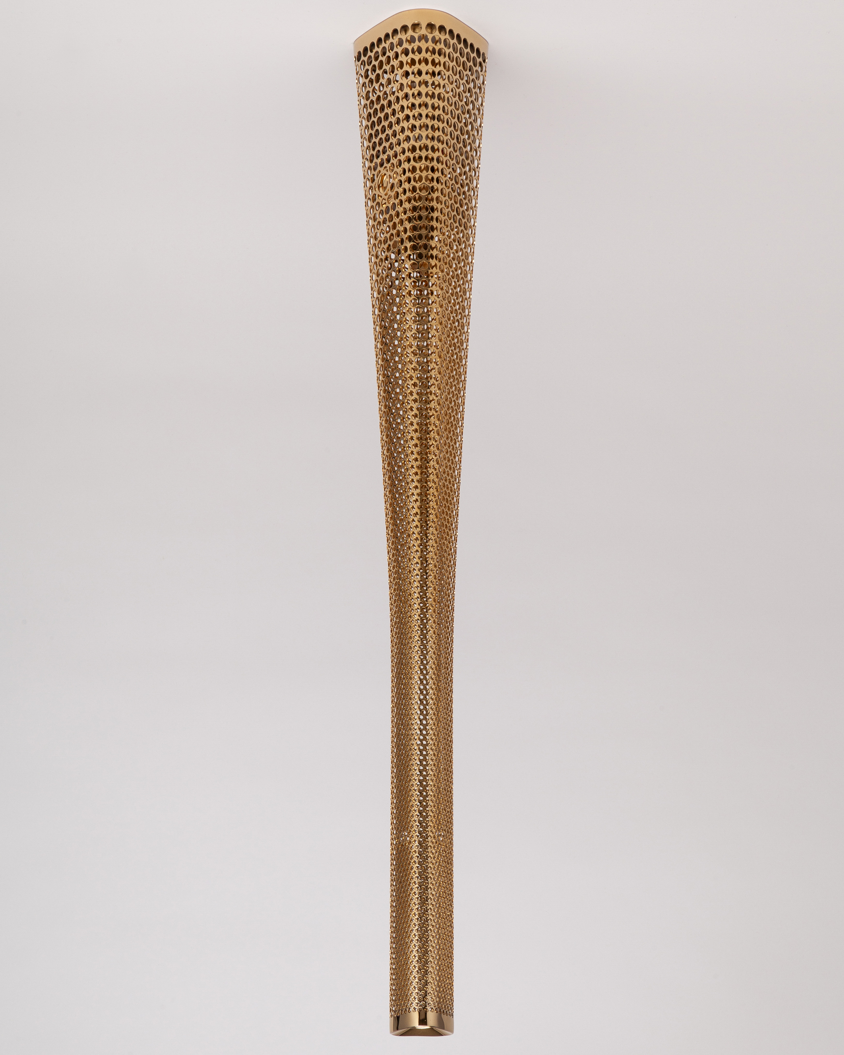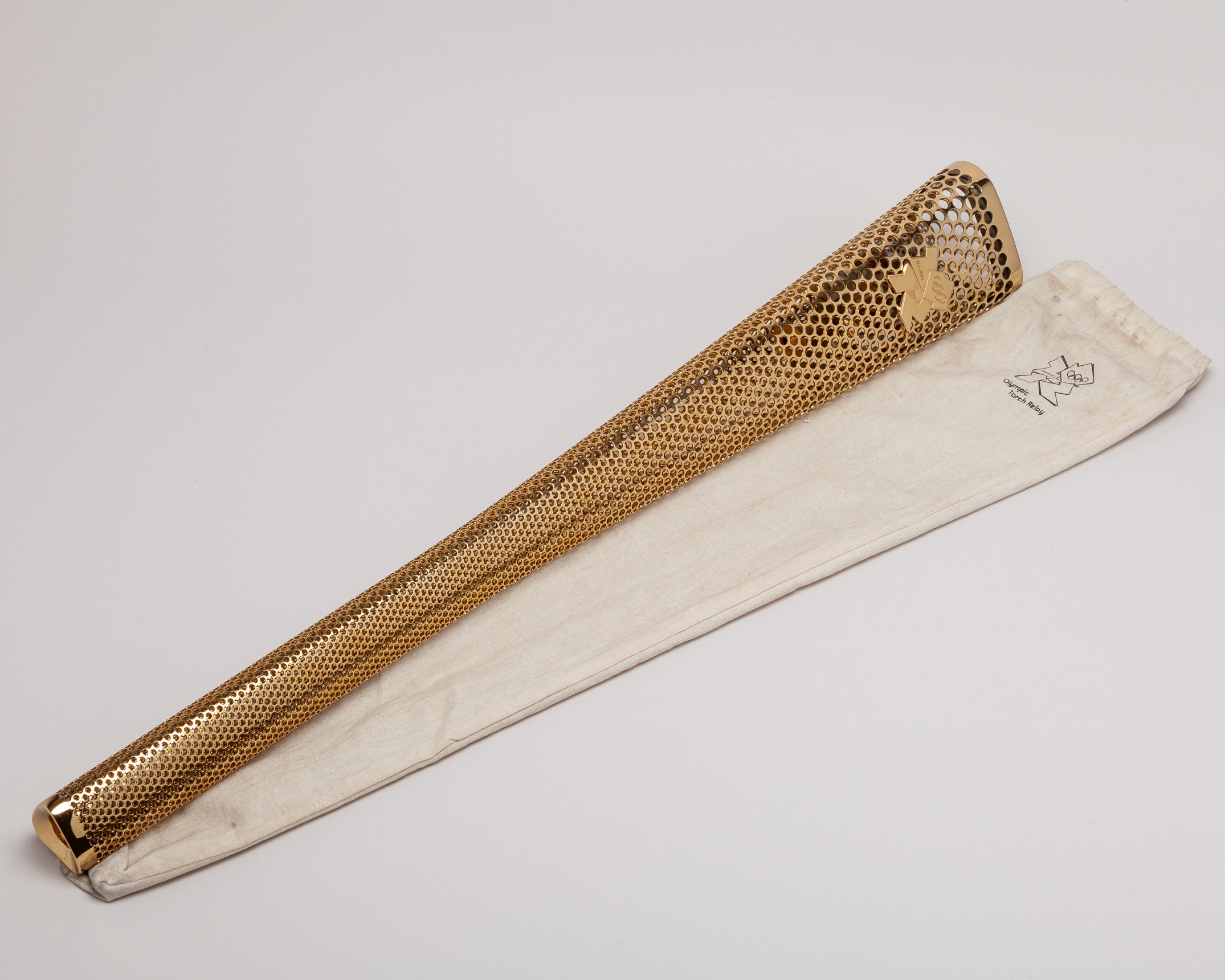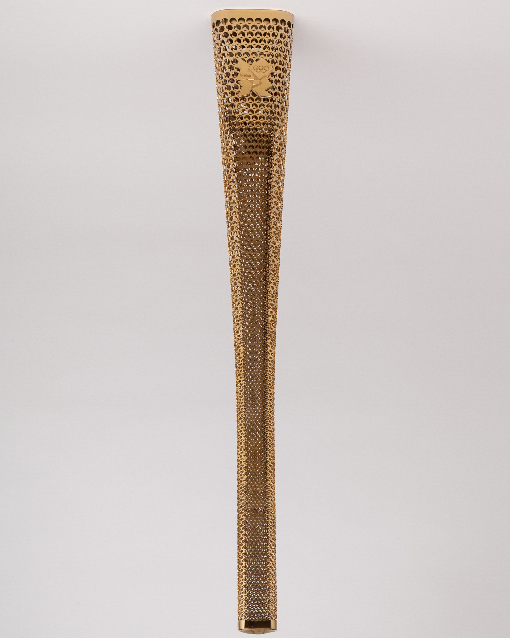 2012 London Olympic Games bearer's torch, of tapering, triangular form gold coloured, bearing the Official 2012 logo, designed by Edward Barber and Jay Osgerby, manufactured in collaboration by Tecosim, LPG Gas, Bullfinch and Premier Sheet Metal, inner and outer aluminium alloy skin, held in place by a cast top piece and base, perforated by 8,000 circles representing the total number of torch bearer's in the London 2012 Relay, 80cm. high, 31.5in., weight 800 gms., with original unused burner, in original bag
