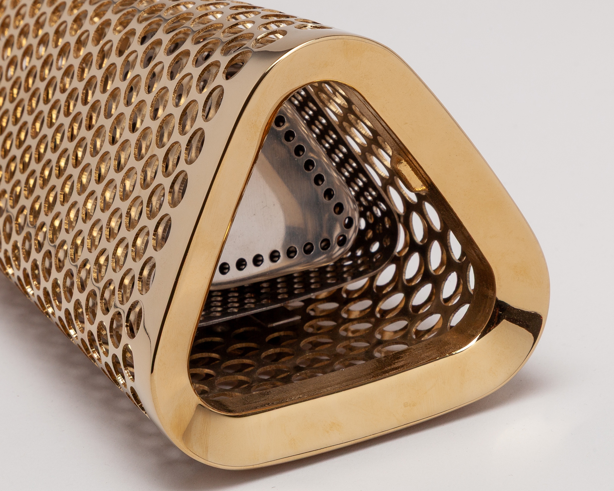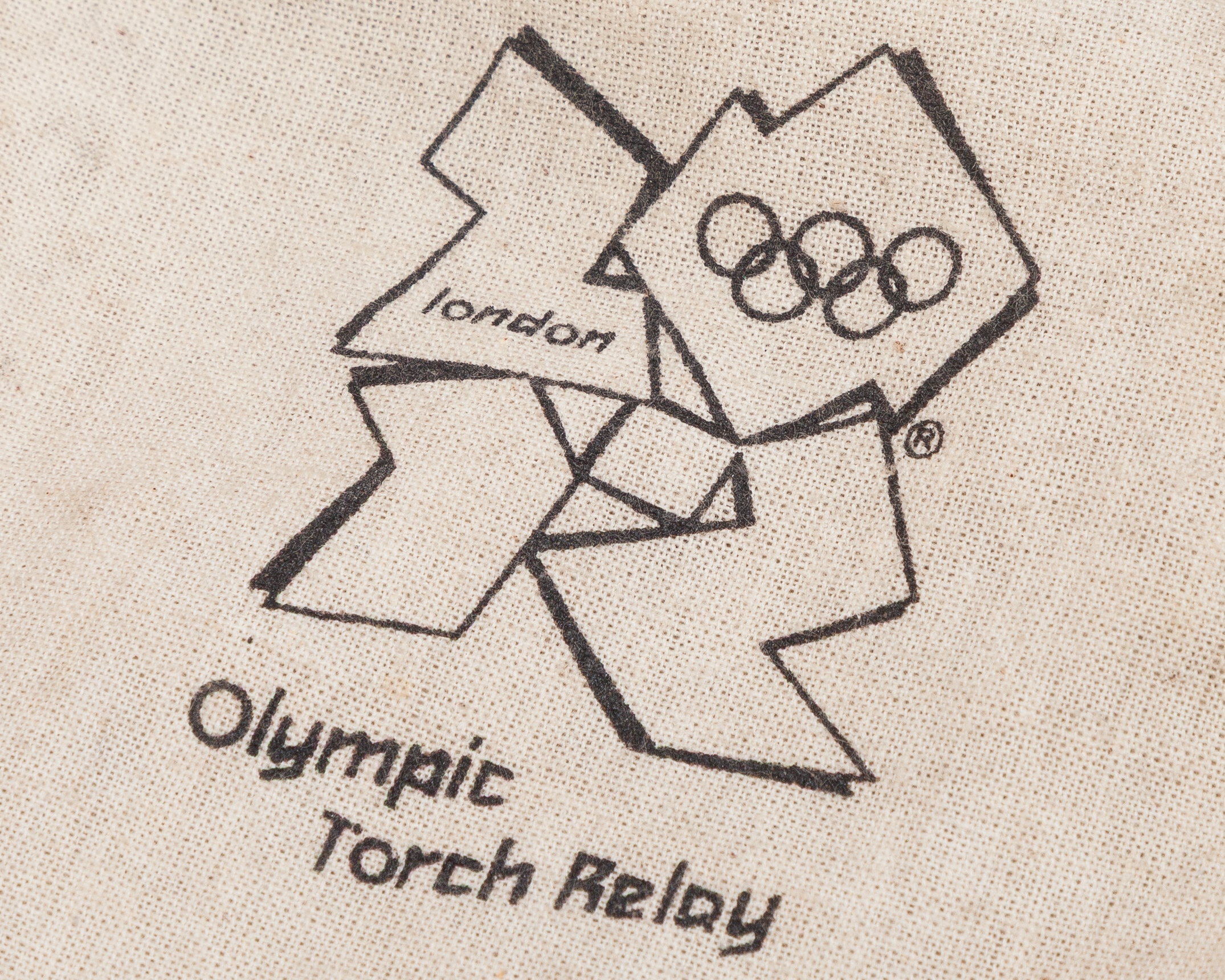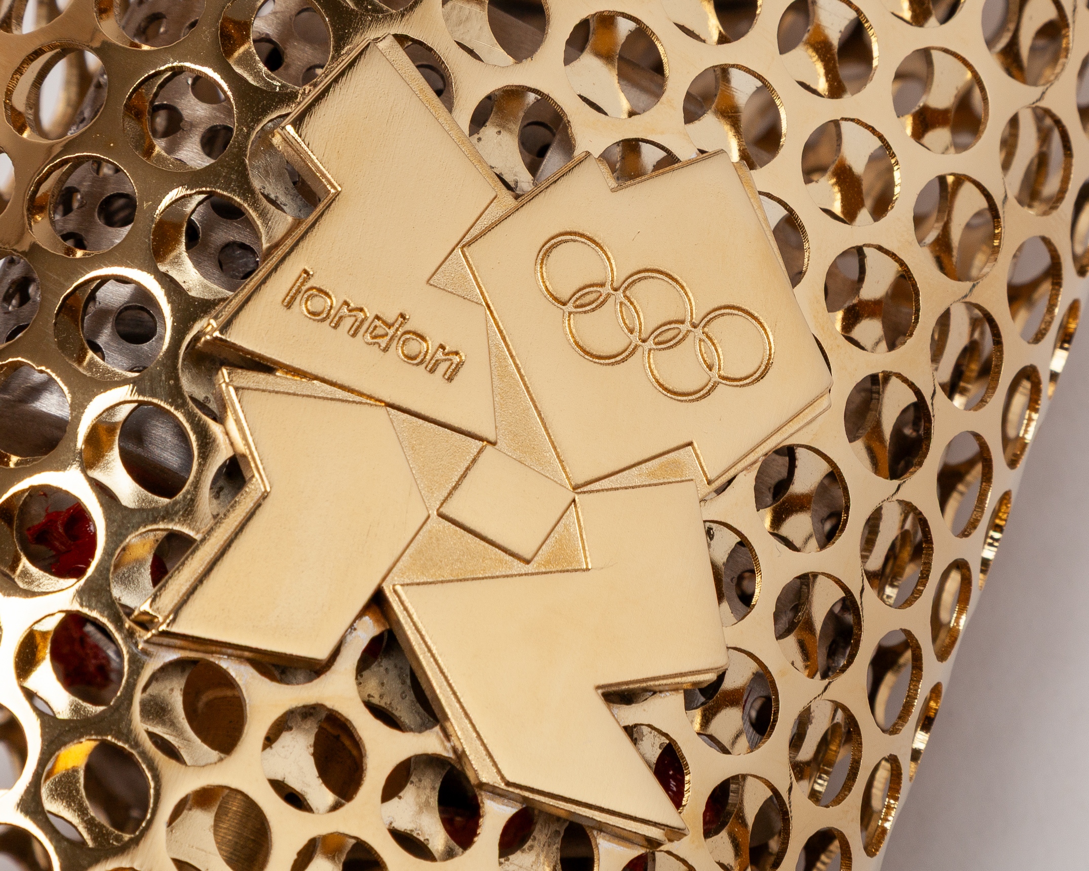 2012 London Olympic Games bearer's torch, of tapering, triangular form gold coloured, bearing the Official 2012 logo, designed by Edward Barber and Jay Osgerby, manufactured in collaboration by Tecosim, LPG Gas, Bullfinch and Premier Sheet Metal, inner and outer aluminium alloy skin, held in place by a cast top piece and base, perforated by 8,000 circles representing the total number of torch bearer's in the London 2012 Relay, 80cm. high, 31.5in., weight 800 gms., with original unused burner, in original bag