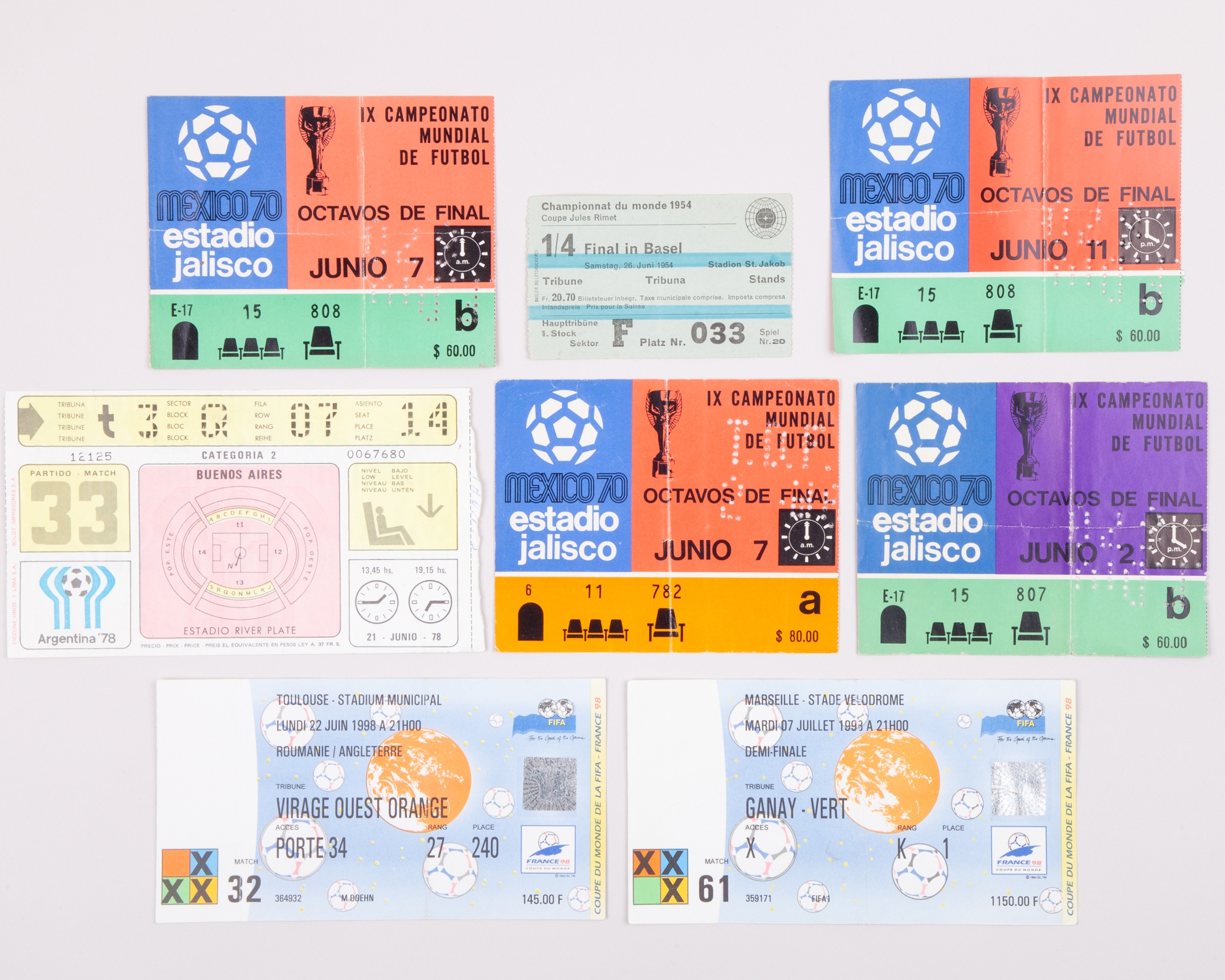 England v. Uruguay 1954 World Cup ticket, 26th June 1954, four 1970 World Cup final tickets, England v. Romania, 2nd June, Brazil v. England, 7th June (two copies), England v. Czechoslovakia, 11th June, 21st June 1978 and Brazil v. Holland, 7th July 1998 and Romania v. England, 22nd June 1998 (8)