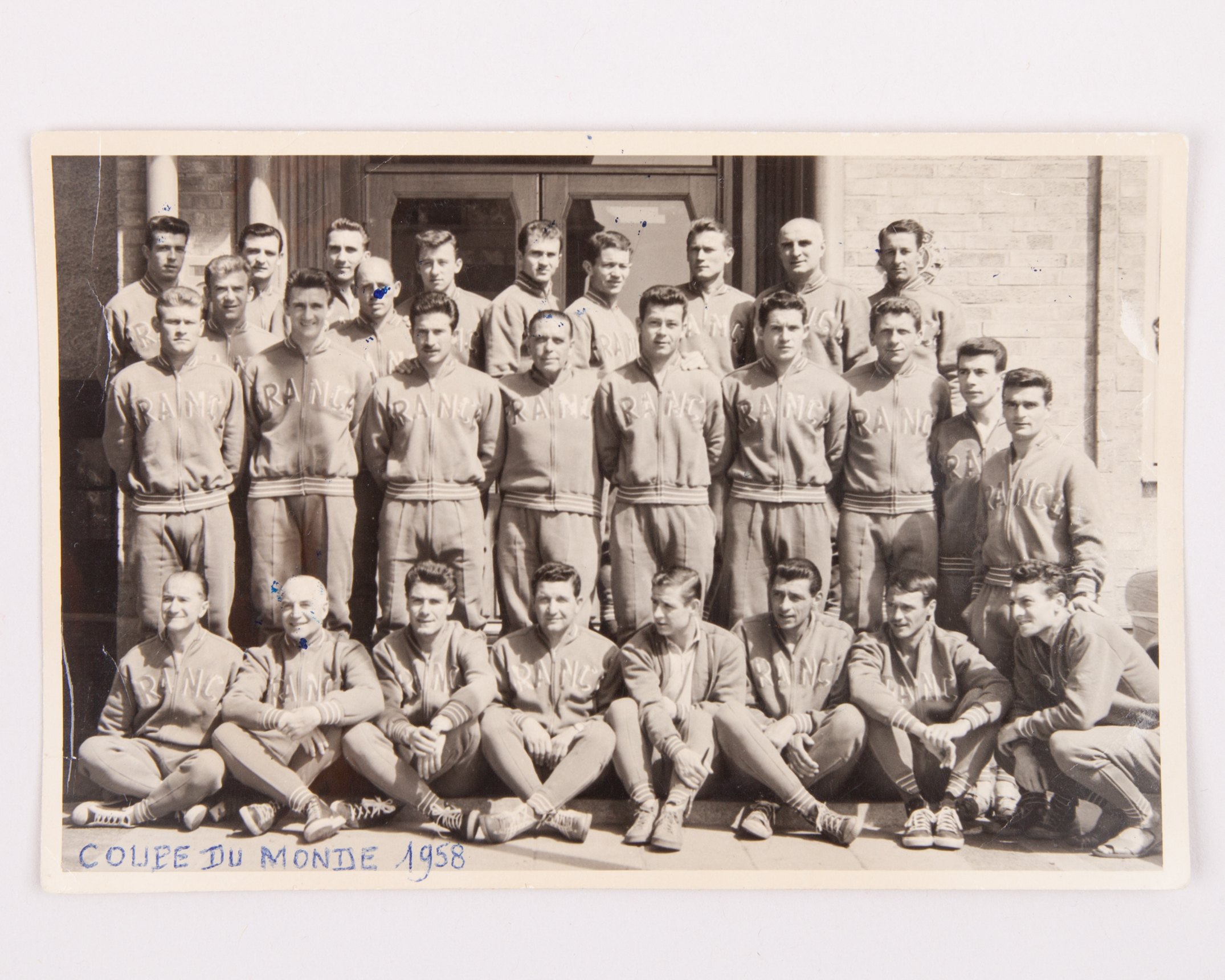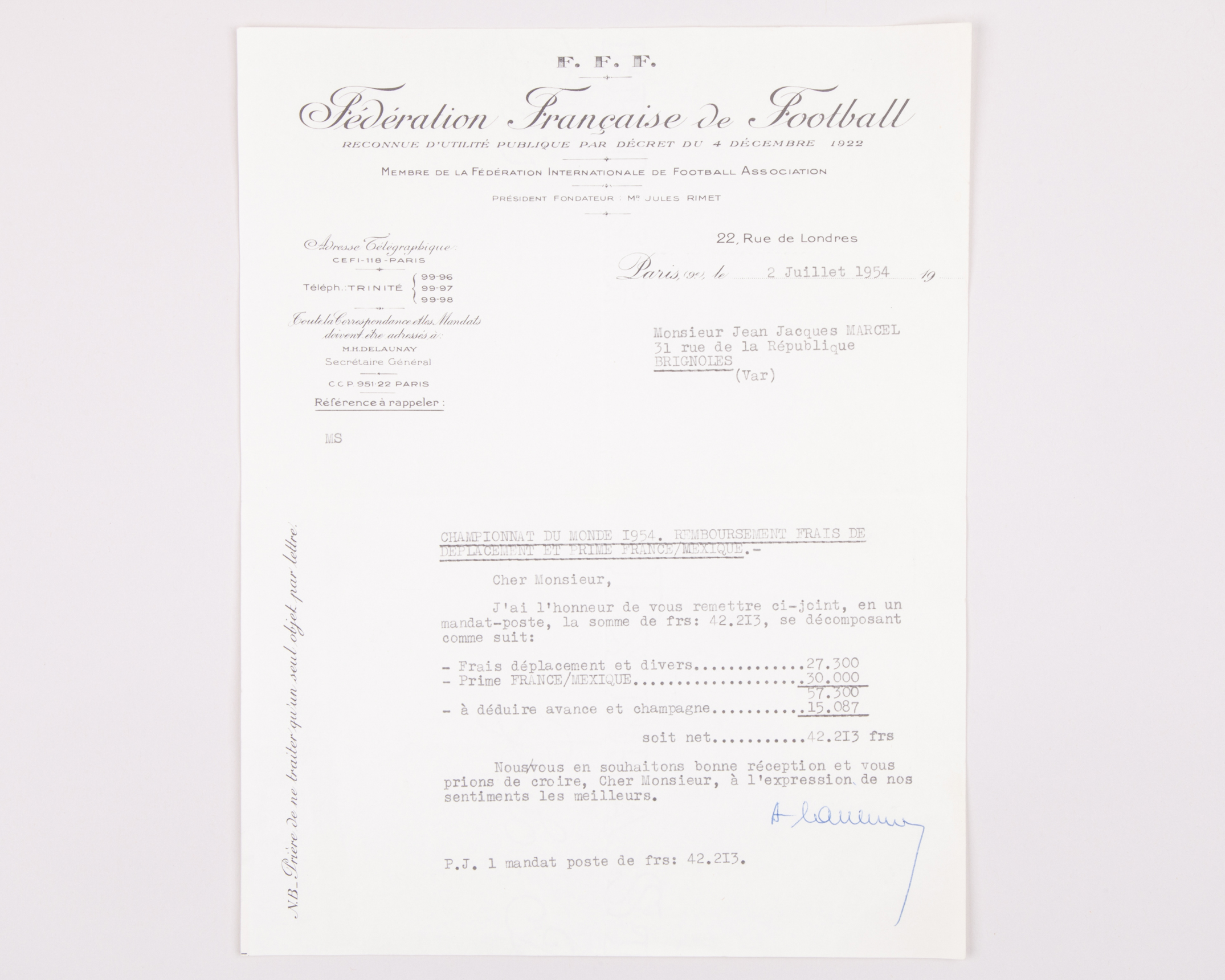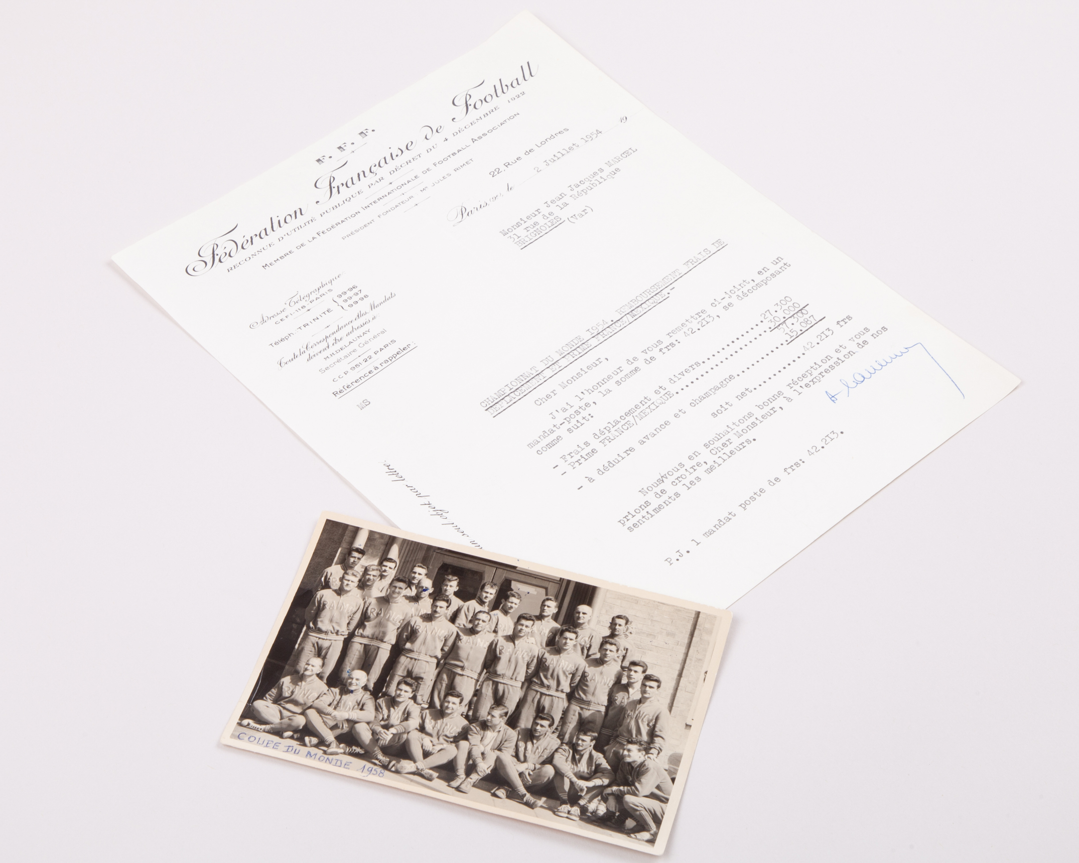 France 1958 World Cup squad line-up autographed photograph, the back of the image bearing twenty-four autographs and a 1954 World Cup French Federation expenses document, 2nd July 1954 (2)