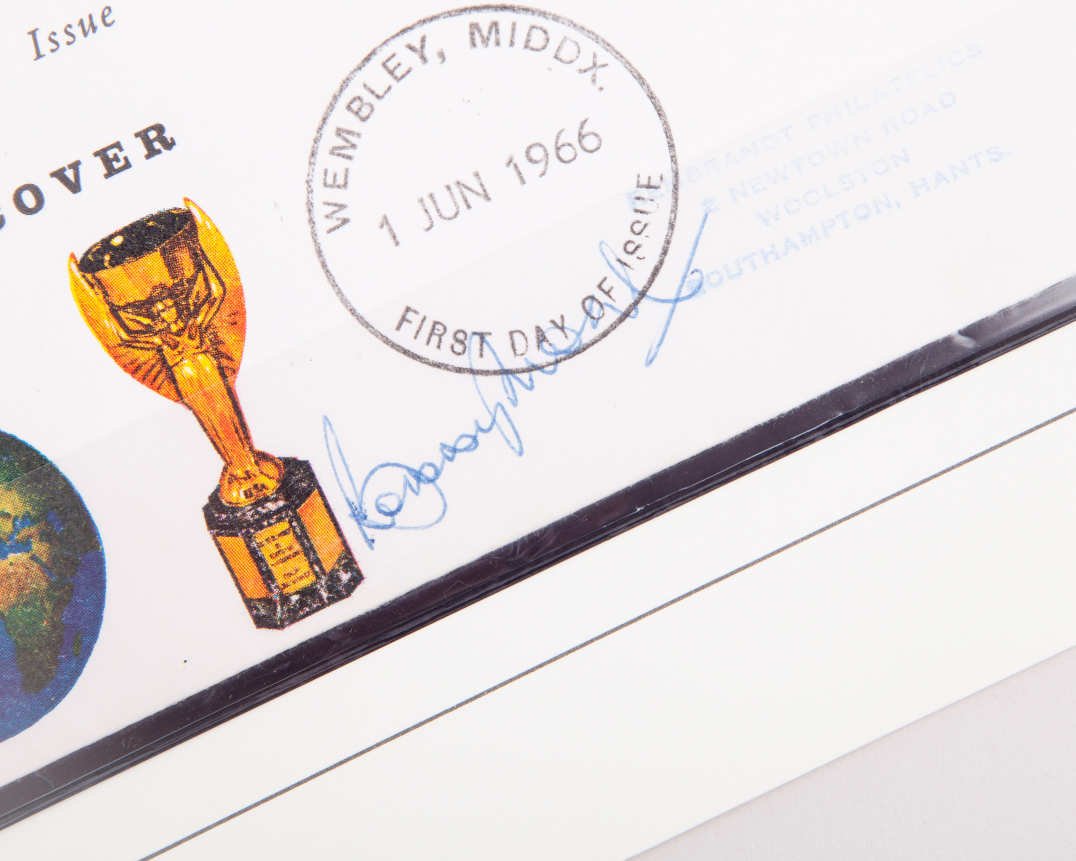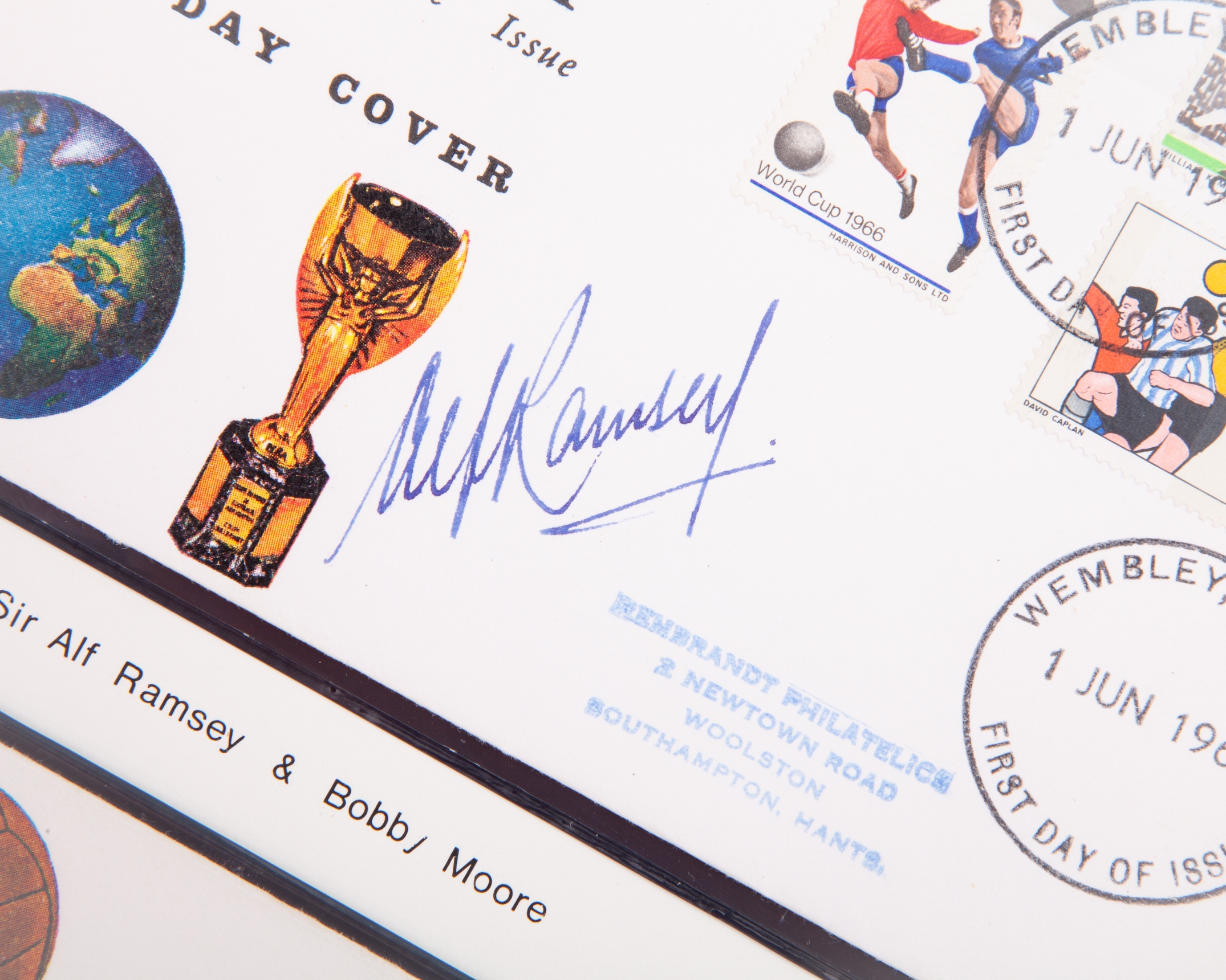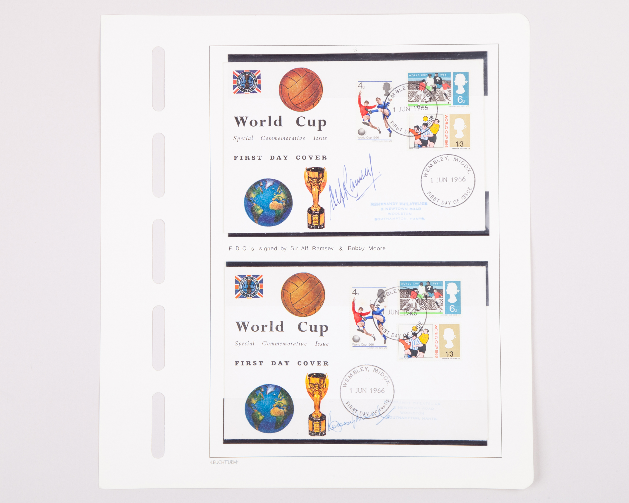 Two 1966 World Cup First Day Covers autographed by Bobby Moore and Alf Ramsey