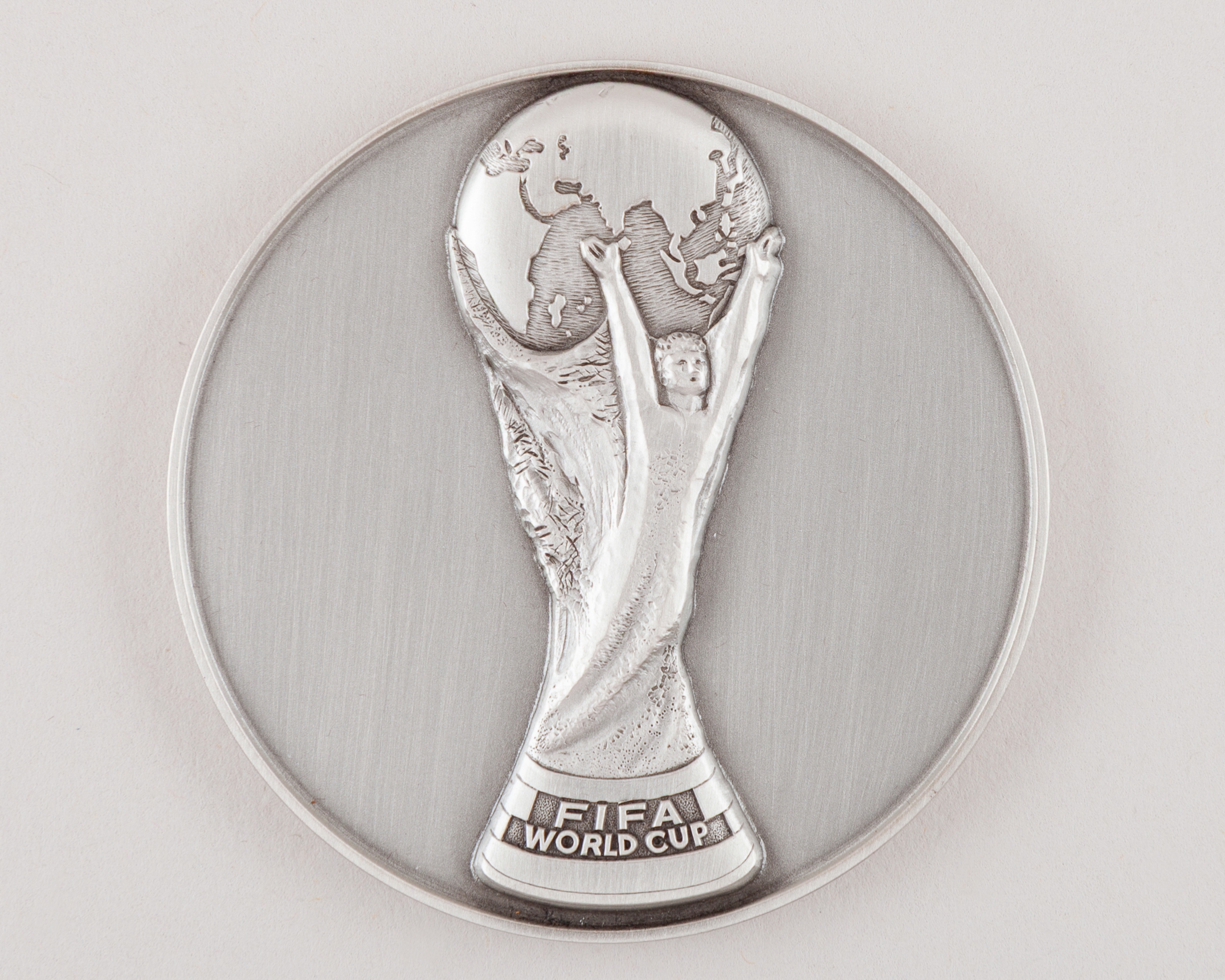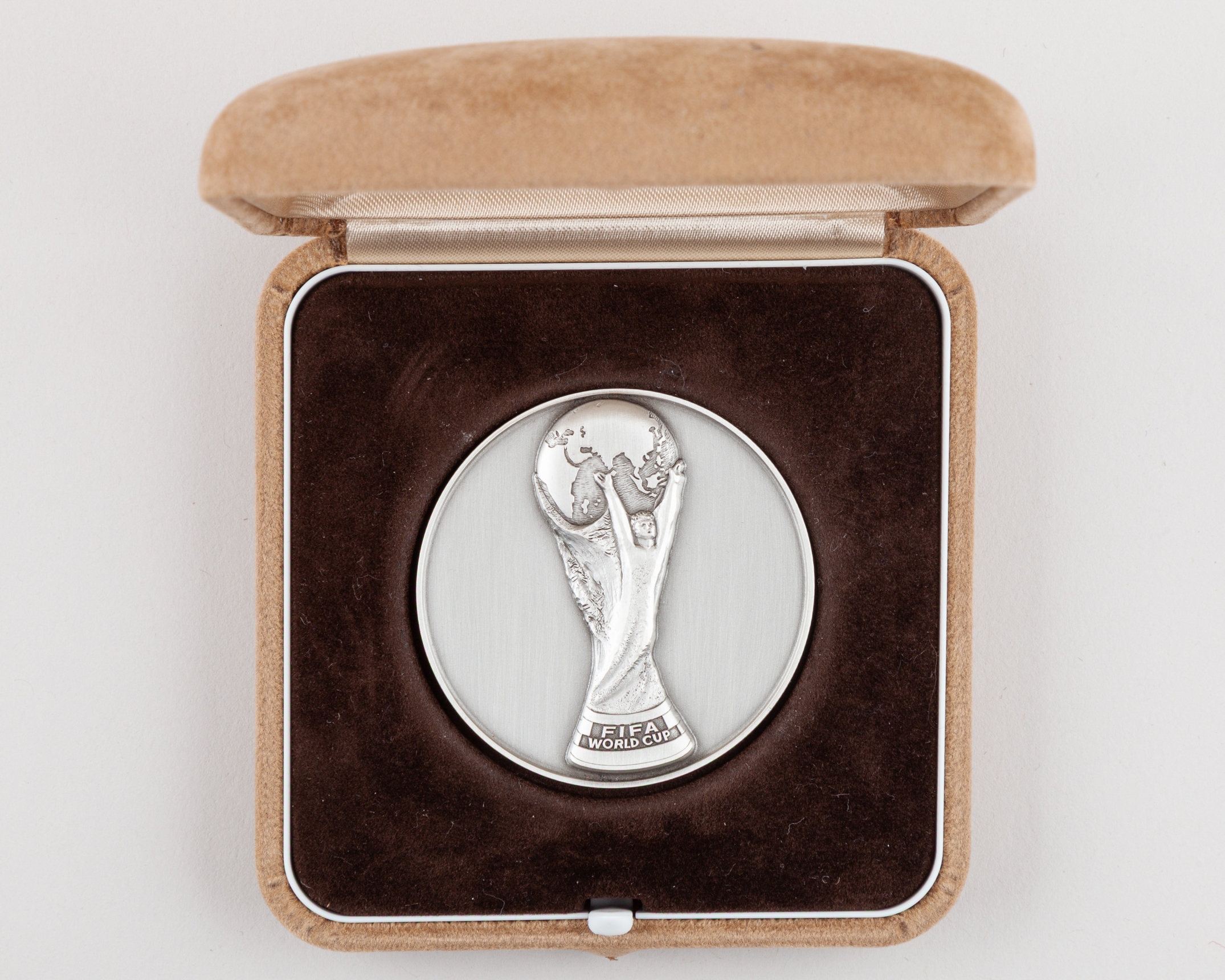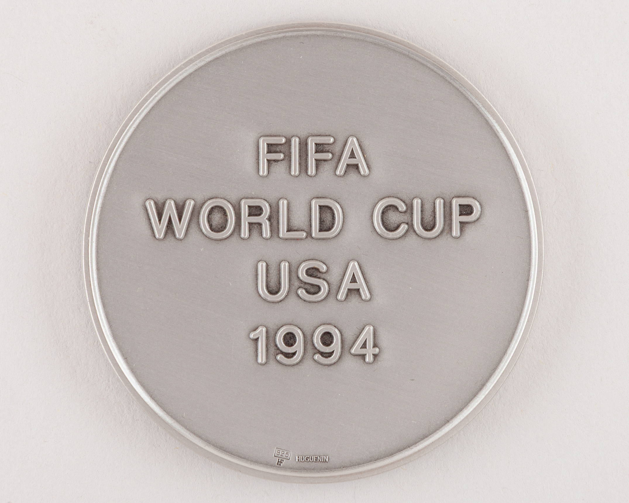 1994 USA World Cup Commemorative medal, designed by Huguenin, obverse with Jules Rimet trophy in relief and lettered FIFA WORLD CUP, reverse with FIFA WORLD CUP USA 1994, stamped 925, diameter 50mm., in original fitted case stamped USA 1994