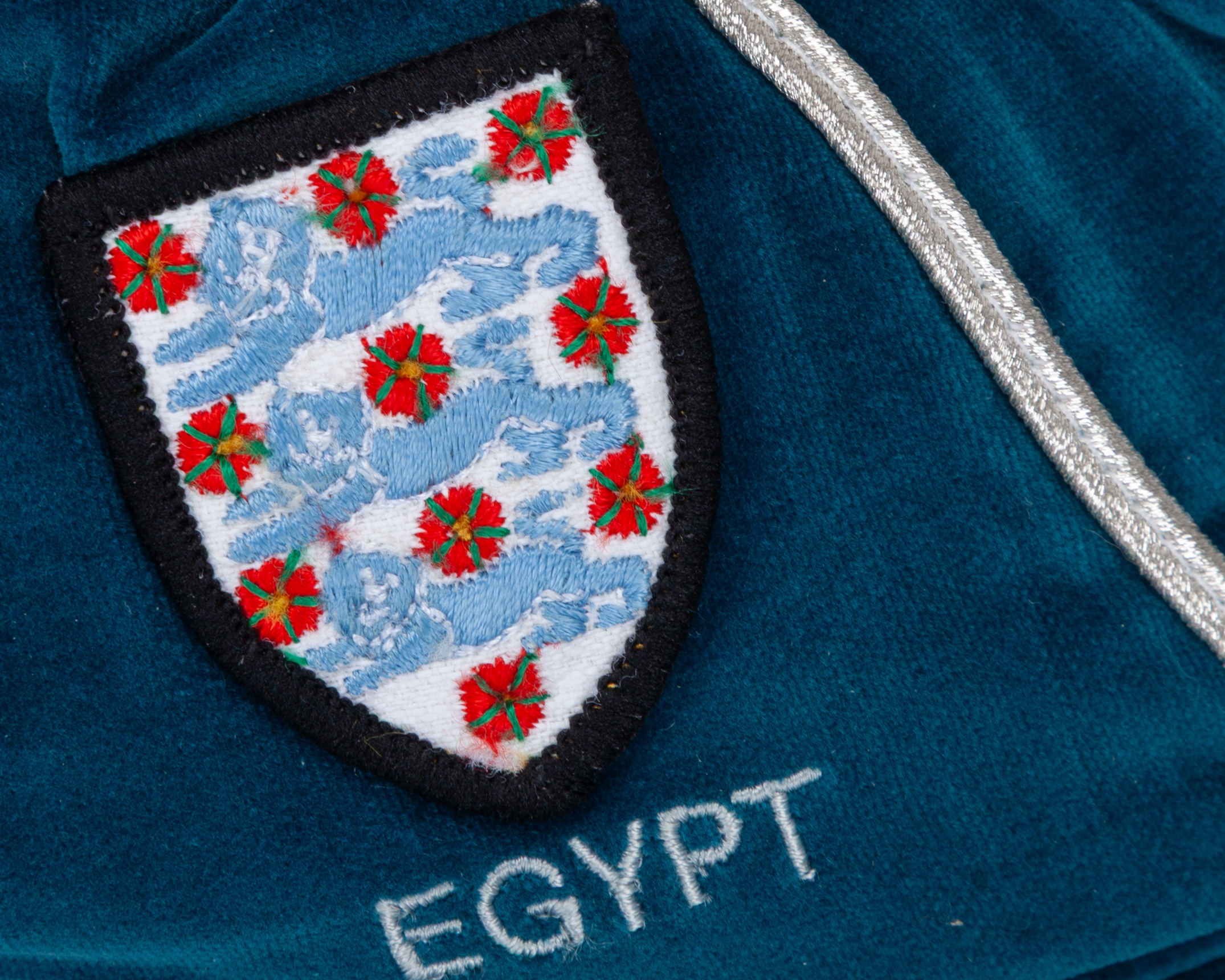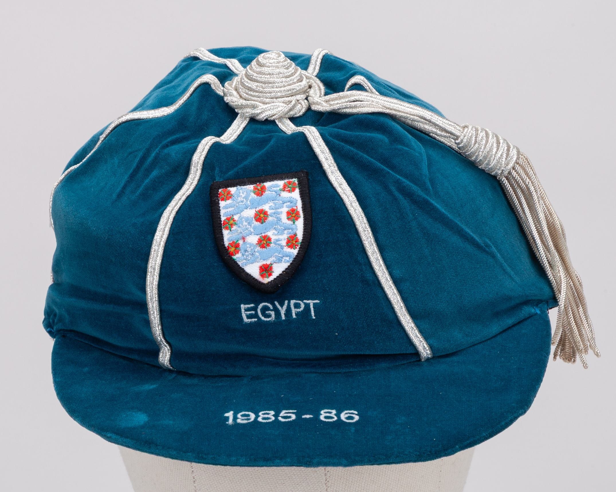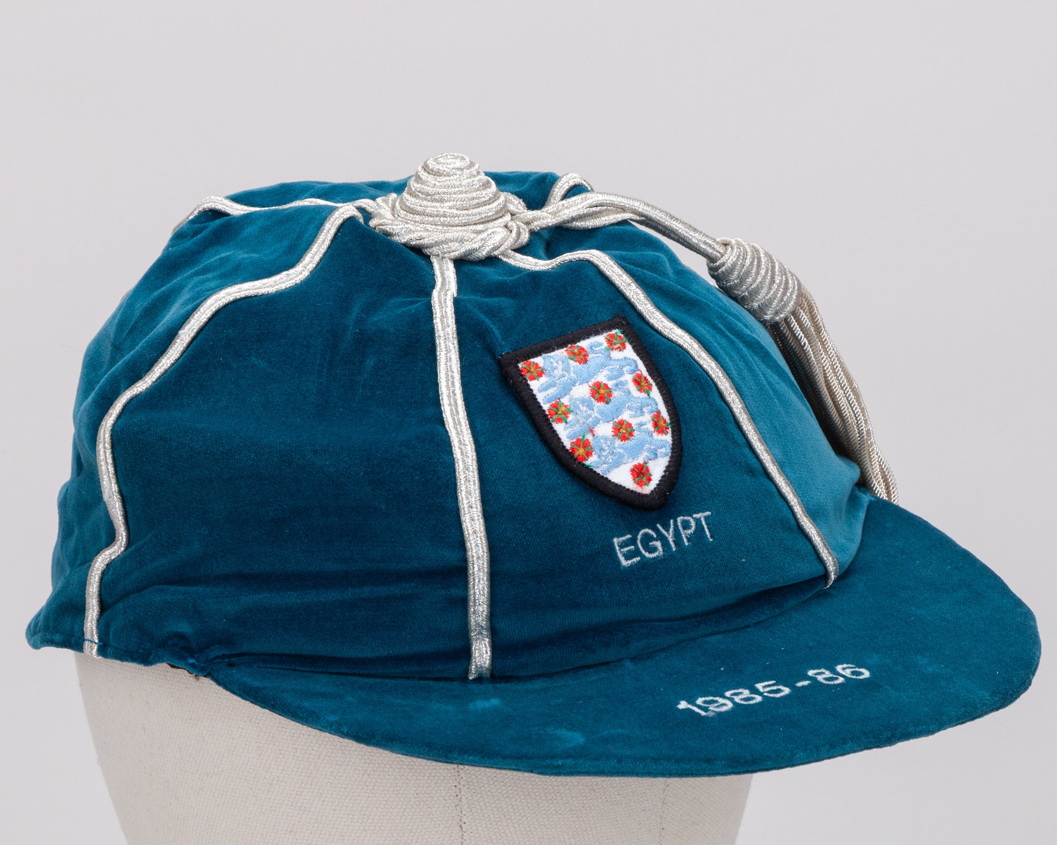 Peter Shilton blue England v. Egypt International cap, 1985-86, the blue velvet cap with silver tassel and silvered braiding, embroidered with the England three lion crest inscribed EGYPT 1985-86