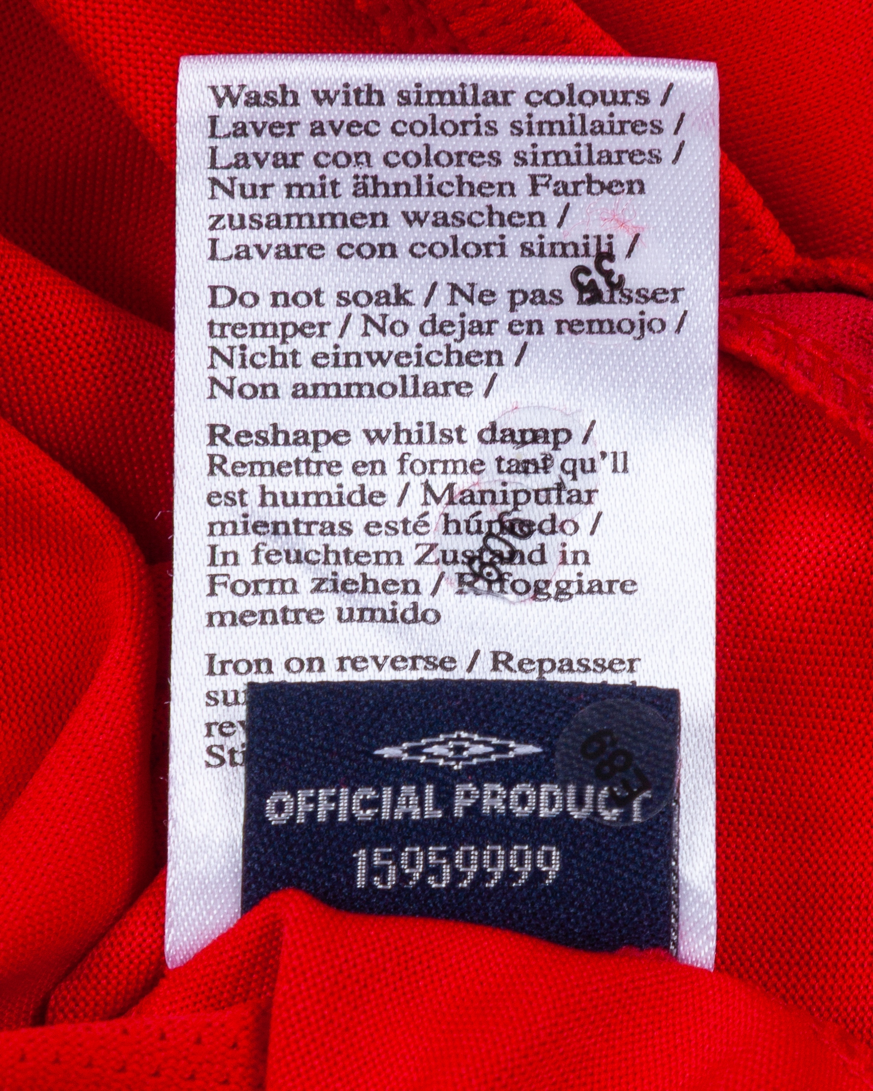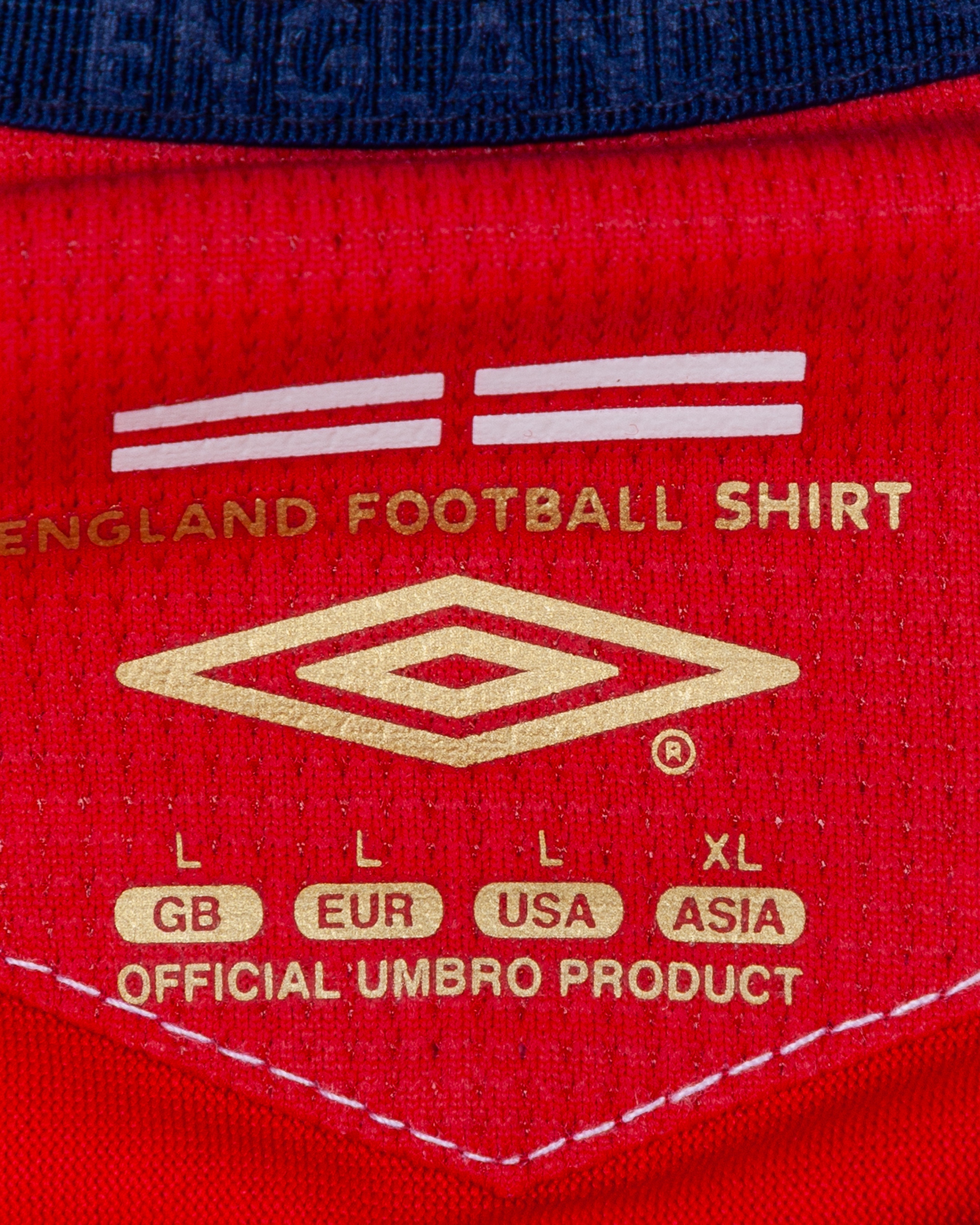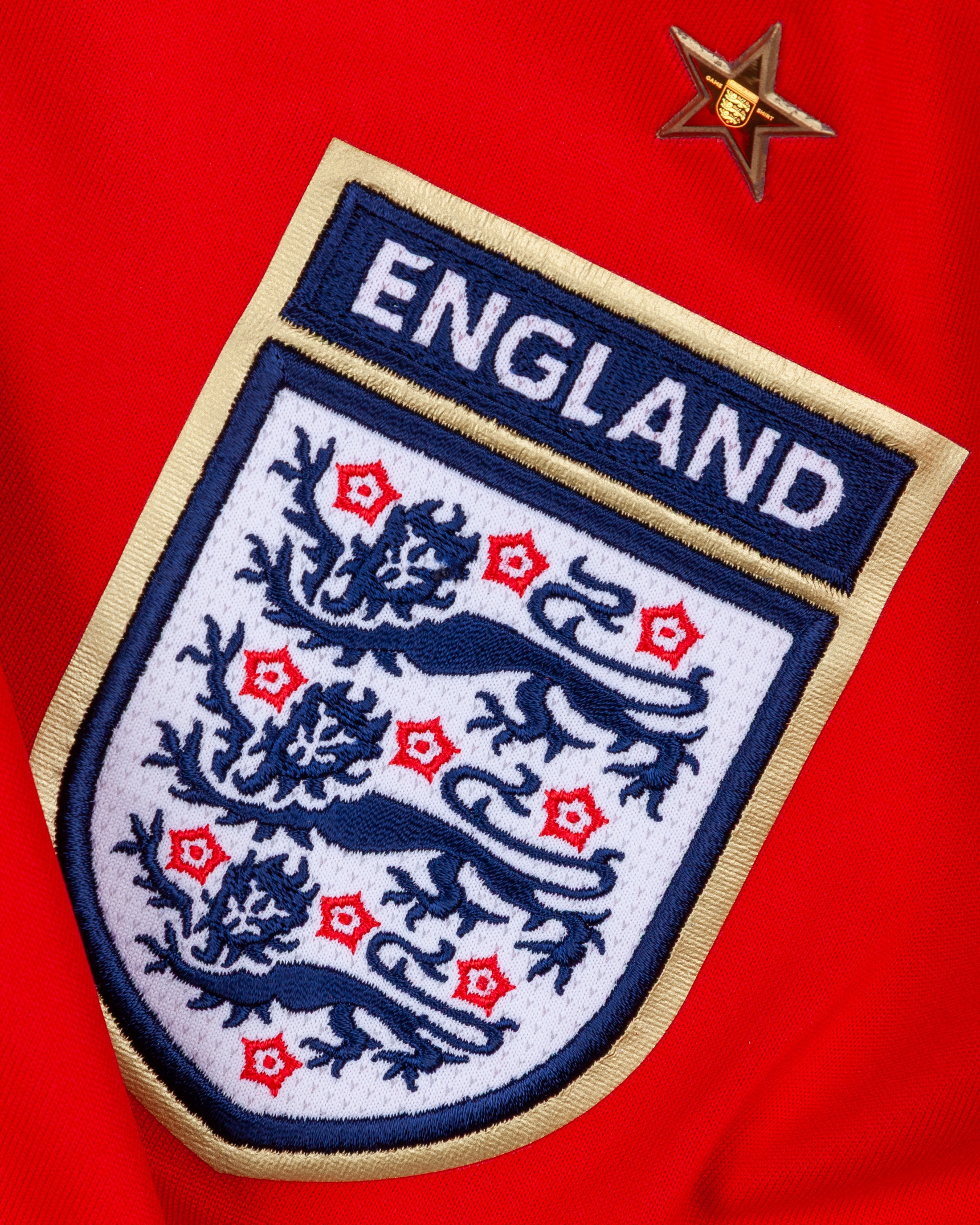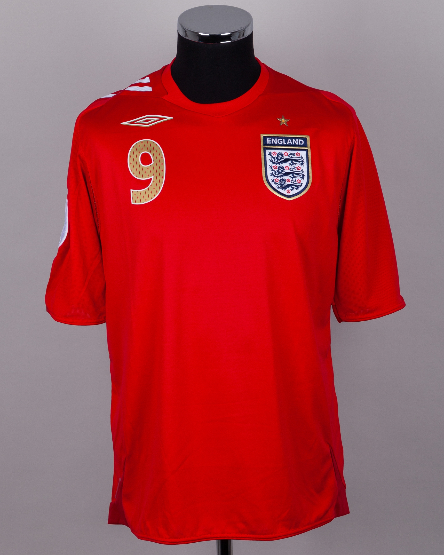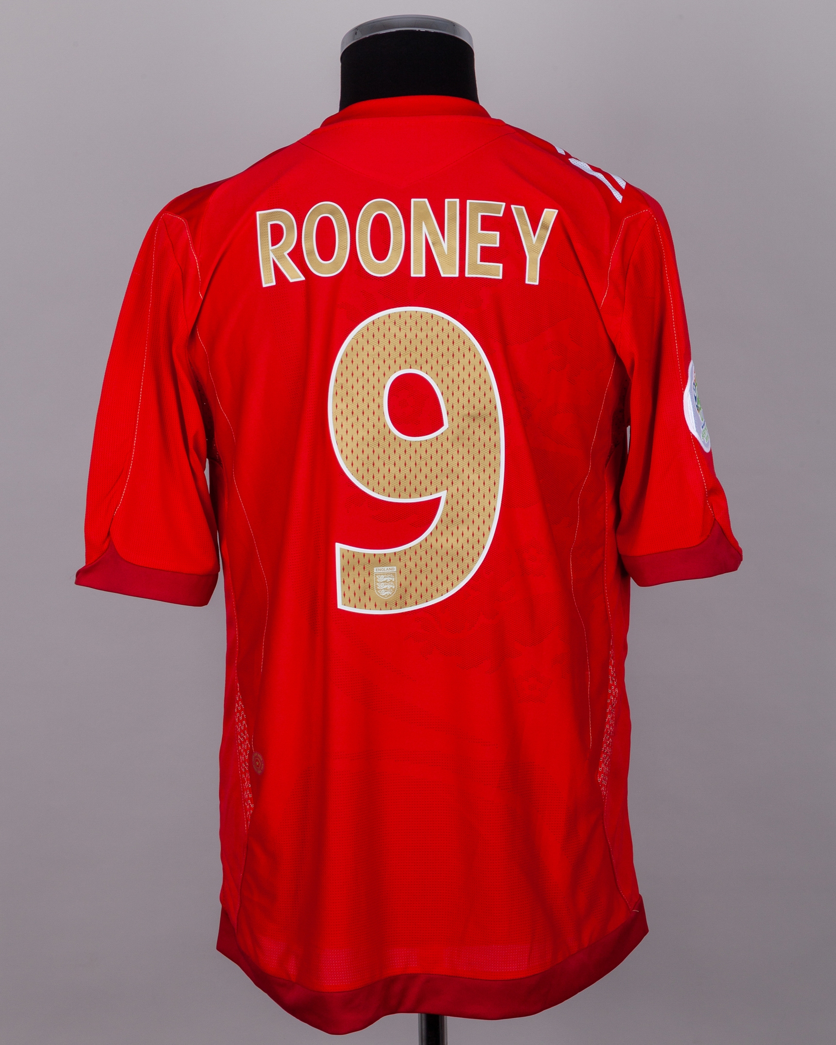 Wayne Rooney red and white No.9 England short-sleeved World Cup shirt, 2006, Umbro, L, with v-neck collar and embroidered cloth badge inscribed ENGLAND, the reverse lettered ROONEY, the right sleeve with FIA World Cup Germany 2006 flash, the star above badge stamped Game Shirt