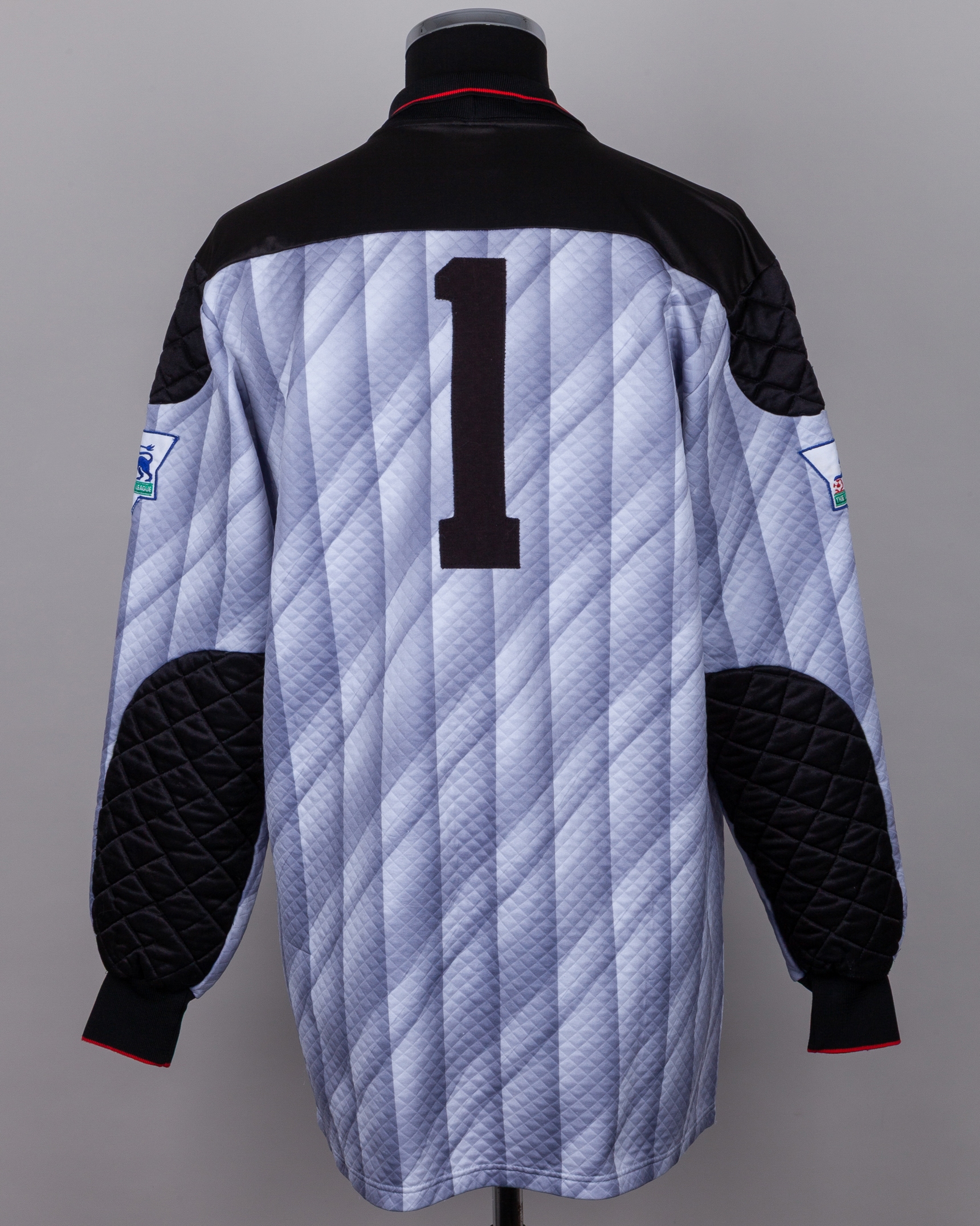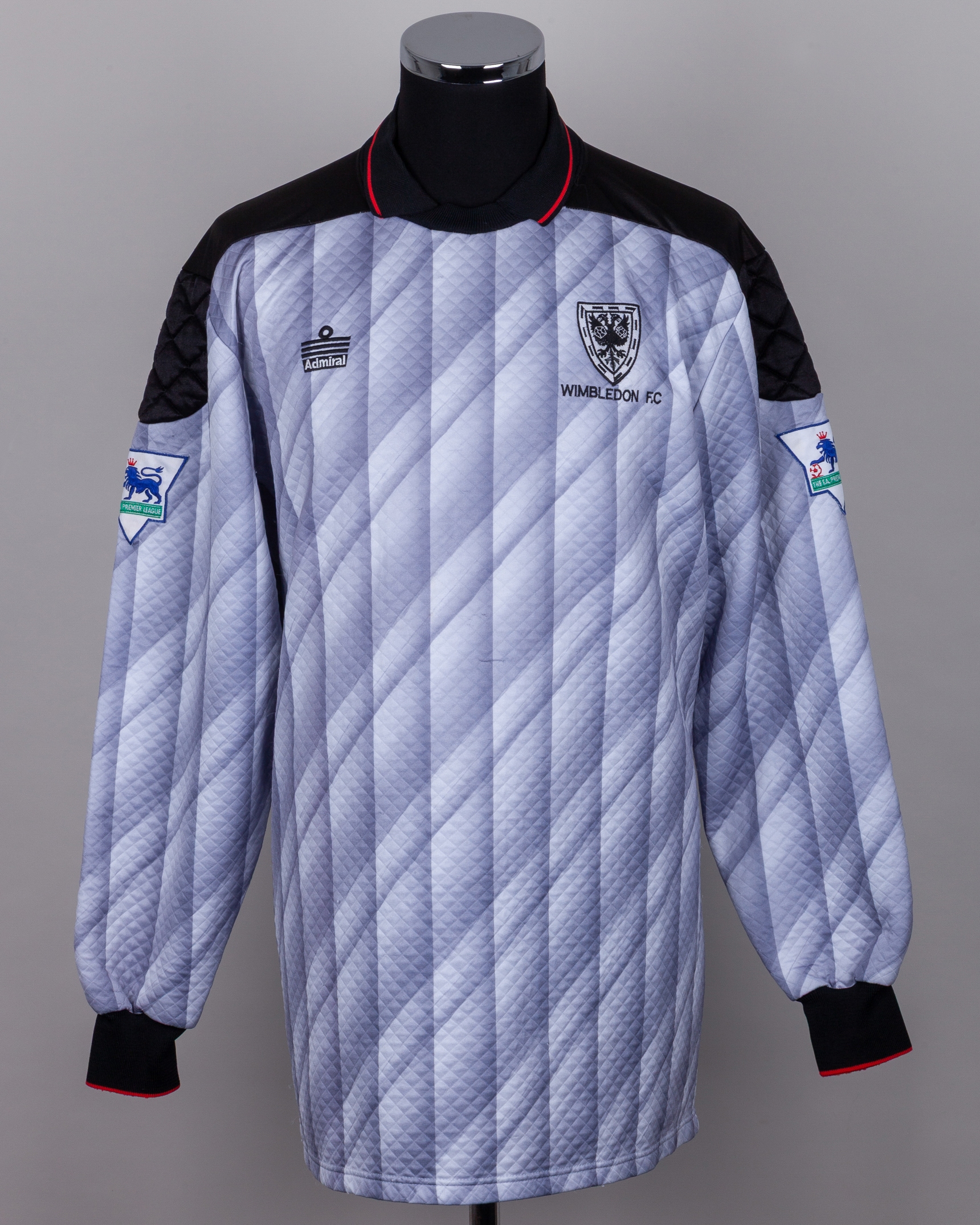 Hans Segers grey and black No.1 Wimbledon goalkeepers shirt, 1991-92, Admiral, 46in, with crew-neck collar and embroidered badge inscribed WIMBLEDON, the sleeves with The F.A.Premier League flashes