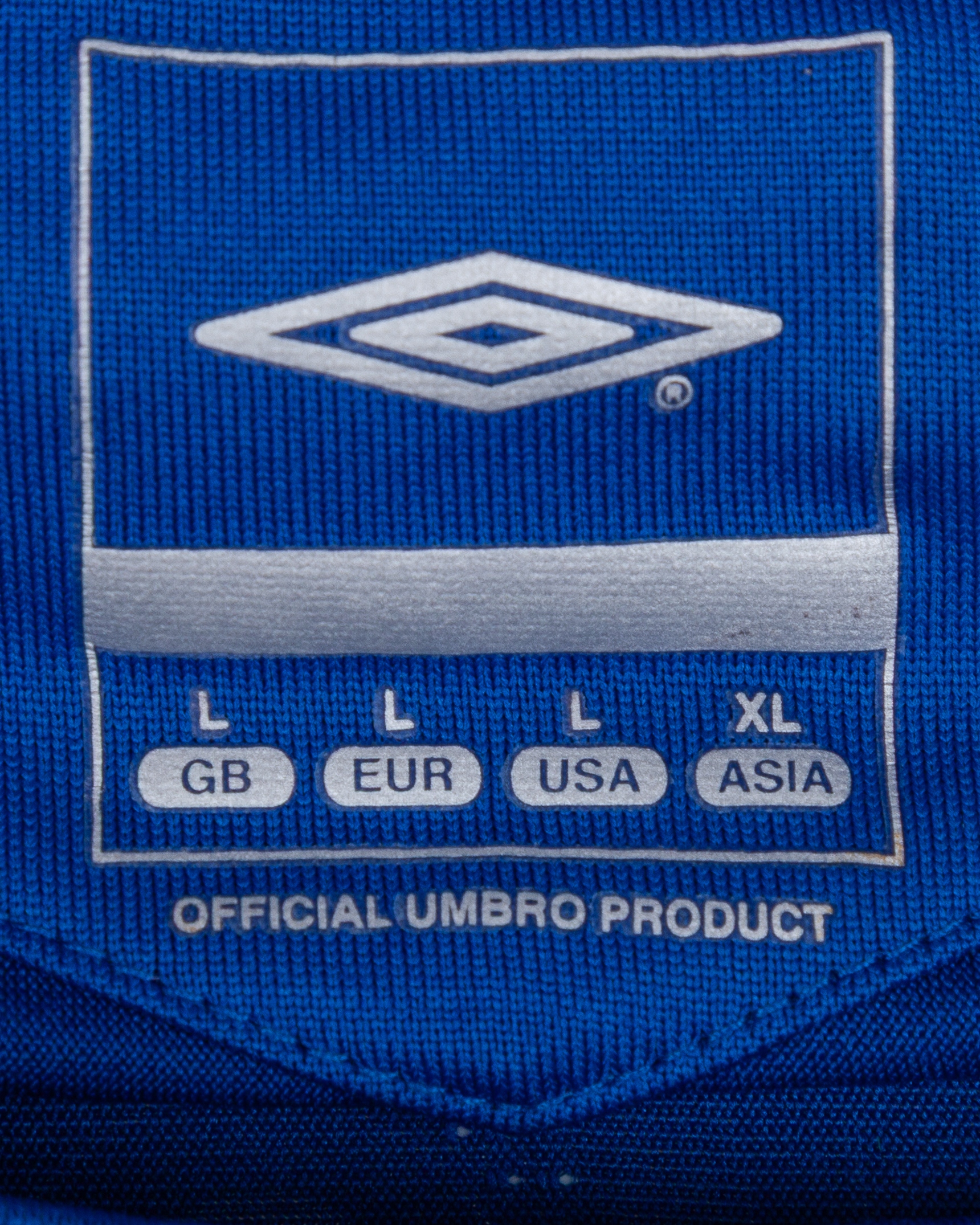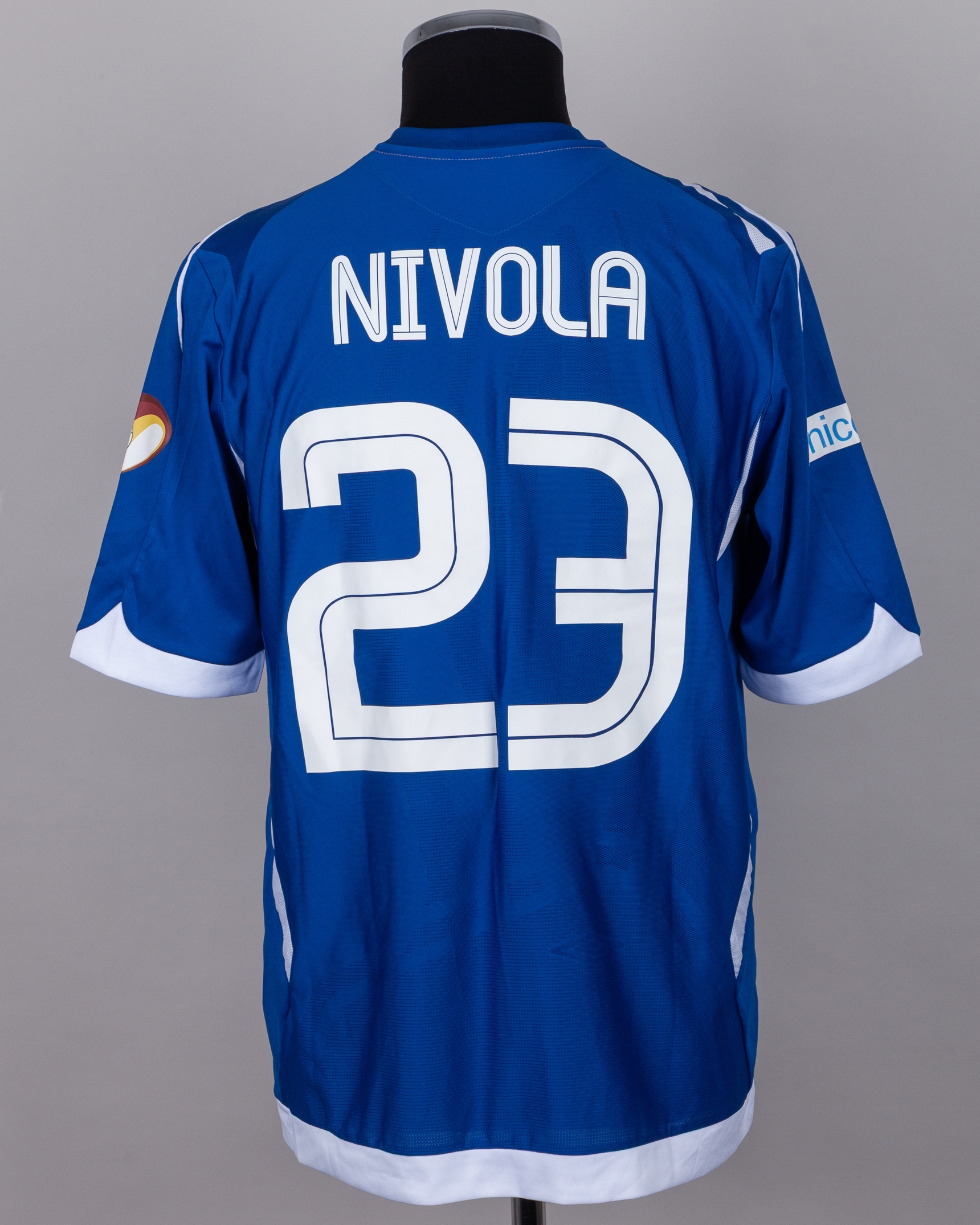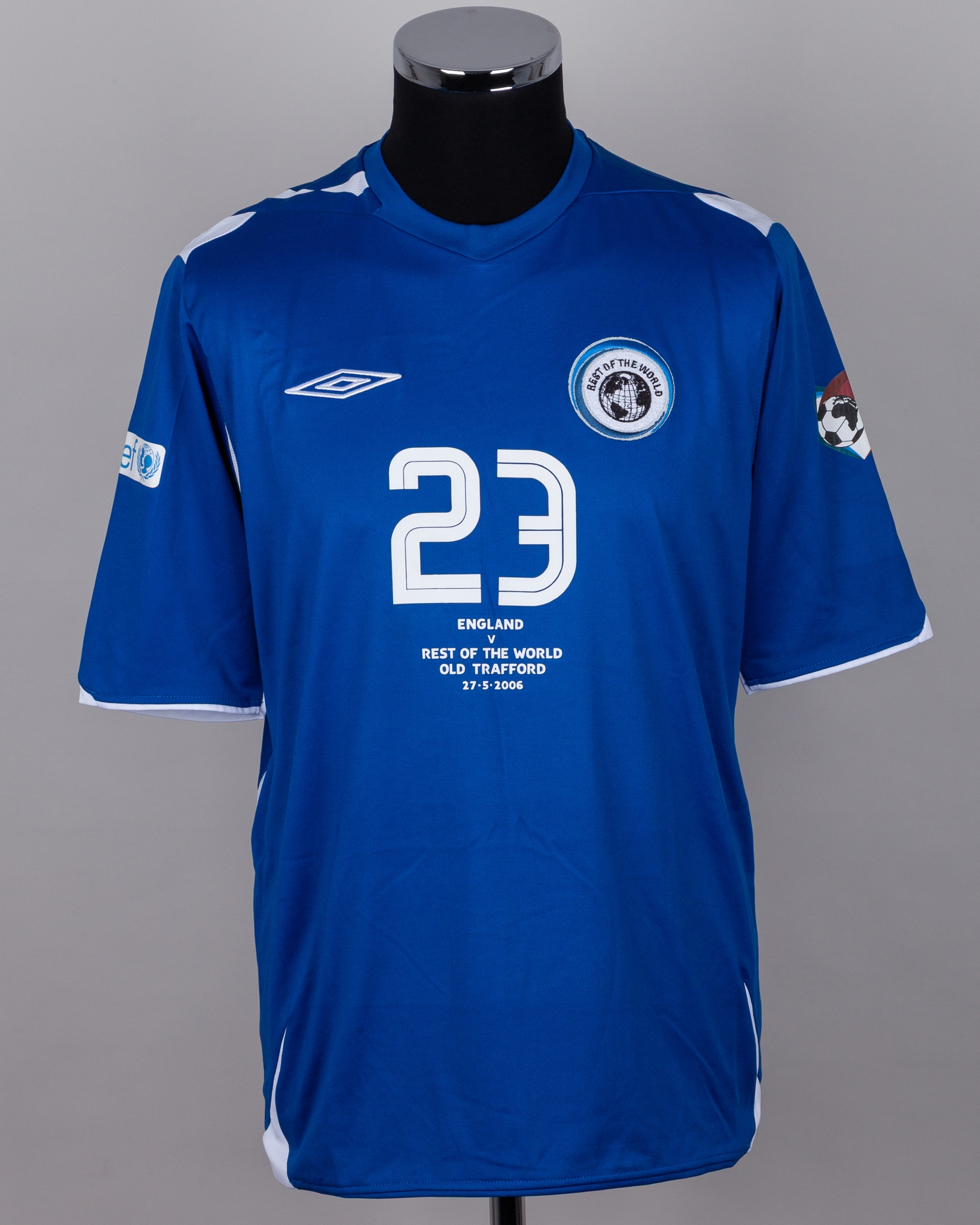 Alessandro Nivola blue and white No.23 Rest of the World v. England Soccer Aid short-sleeved shirt, 2006, Umbro, L, with v-neck collar and embroidered cloth badge inscribed REST OF THE WORLD, with ENGLAND V REST OF THE WORLD OLD TRAFFORD 27.5.2006 decal, the reverse lettered NIVOLA, the sleeves with UNICEF flashes