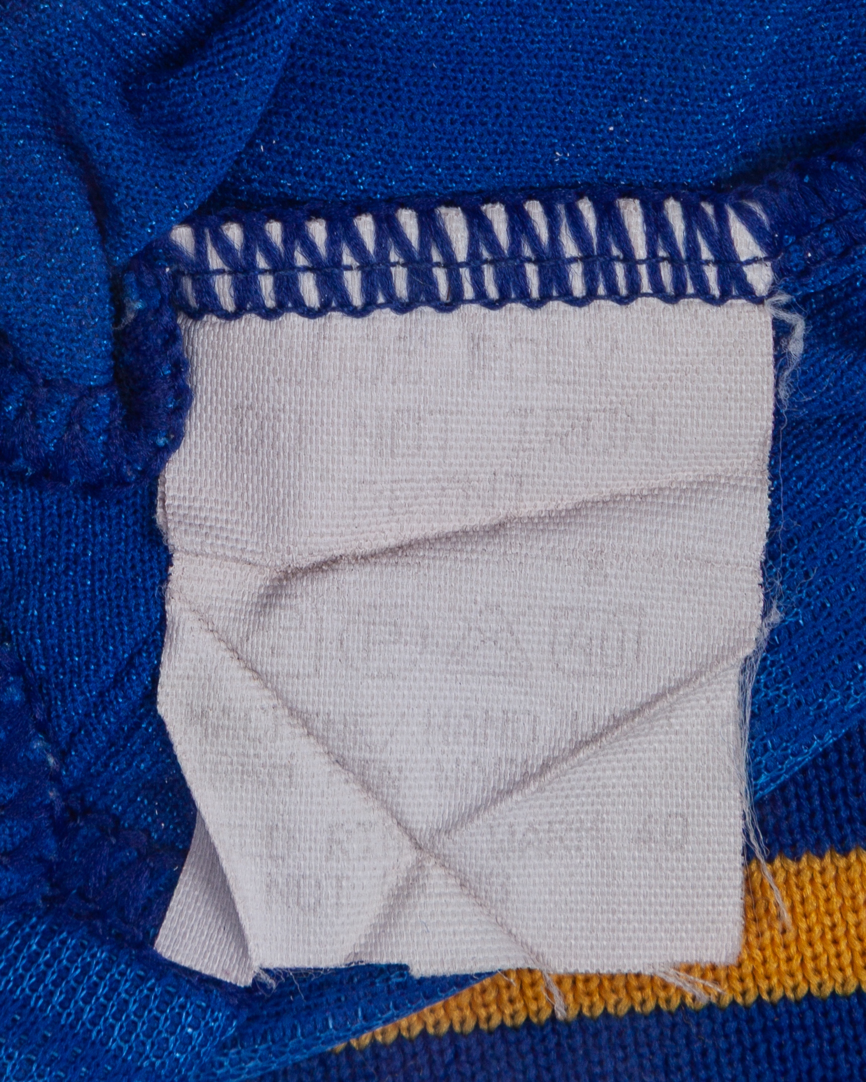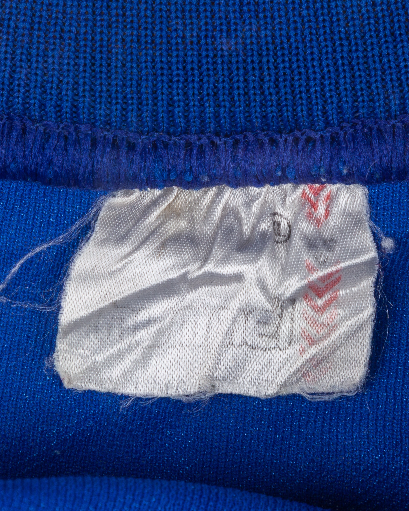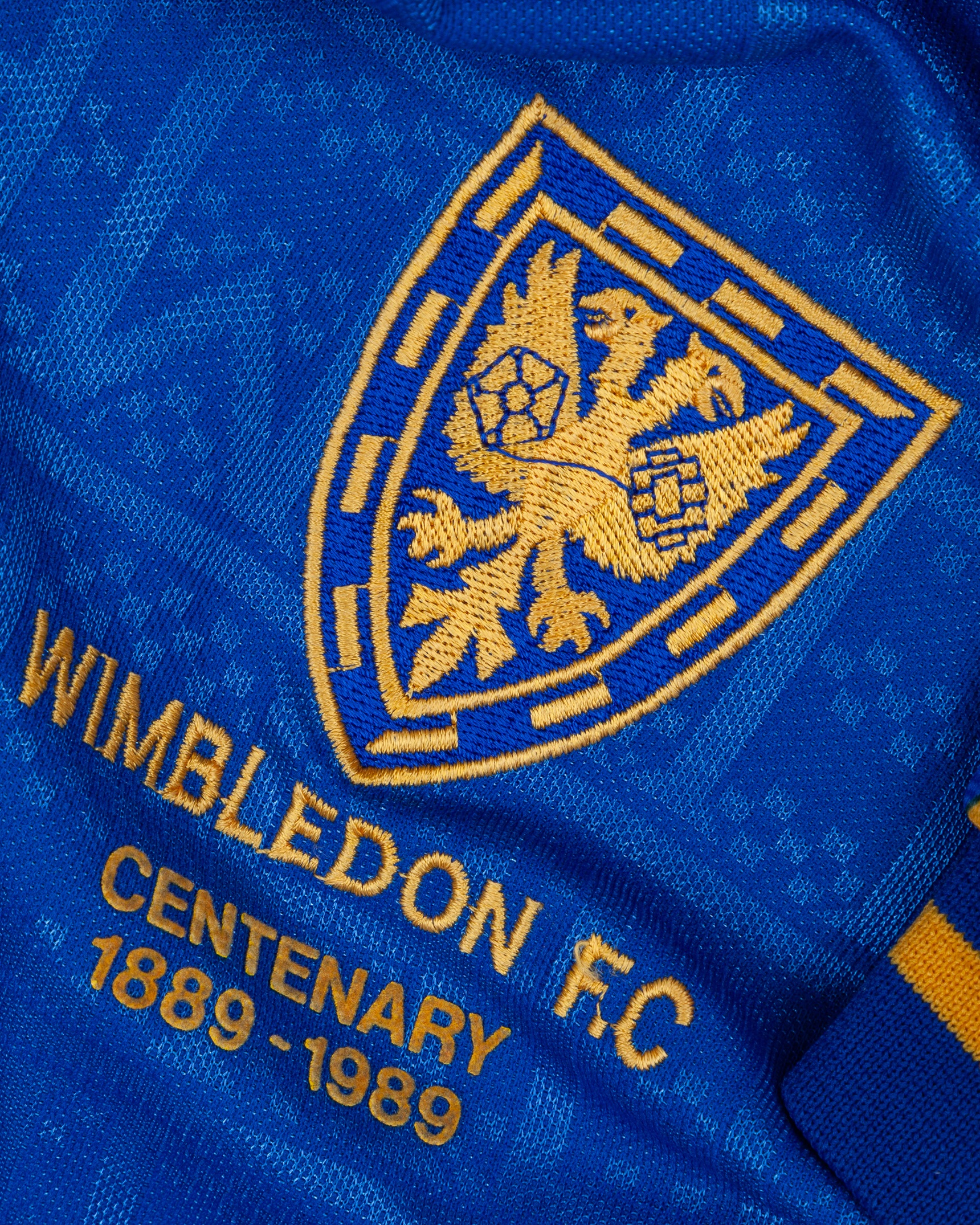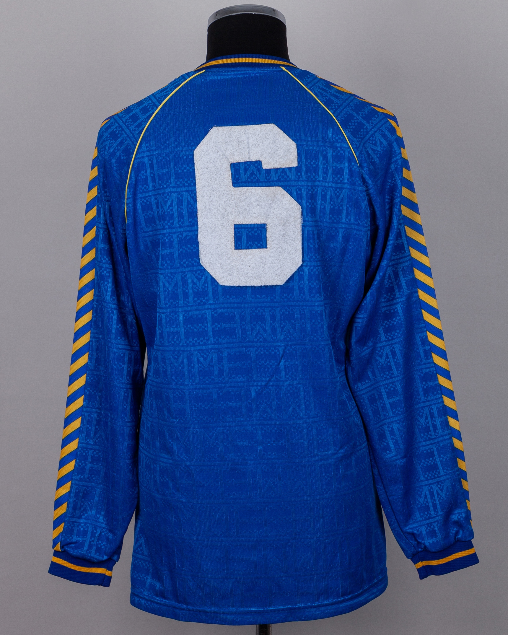 Steve Cotterill blue and yellow No.6 Wimbledon long-sleeved shirt, 1989-90, Hummel, with v-neck collar and embroidered cloth badge inscribed WIMBLEDON F.C., CENTENARY 1889-1989