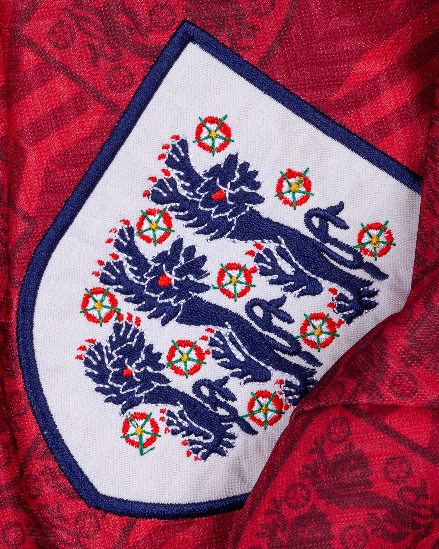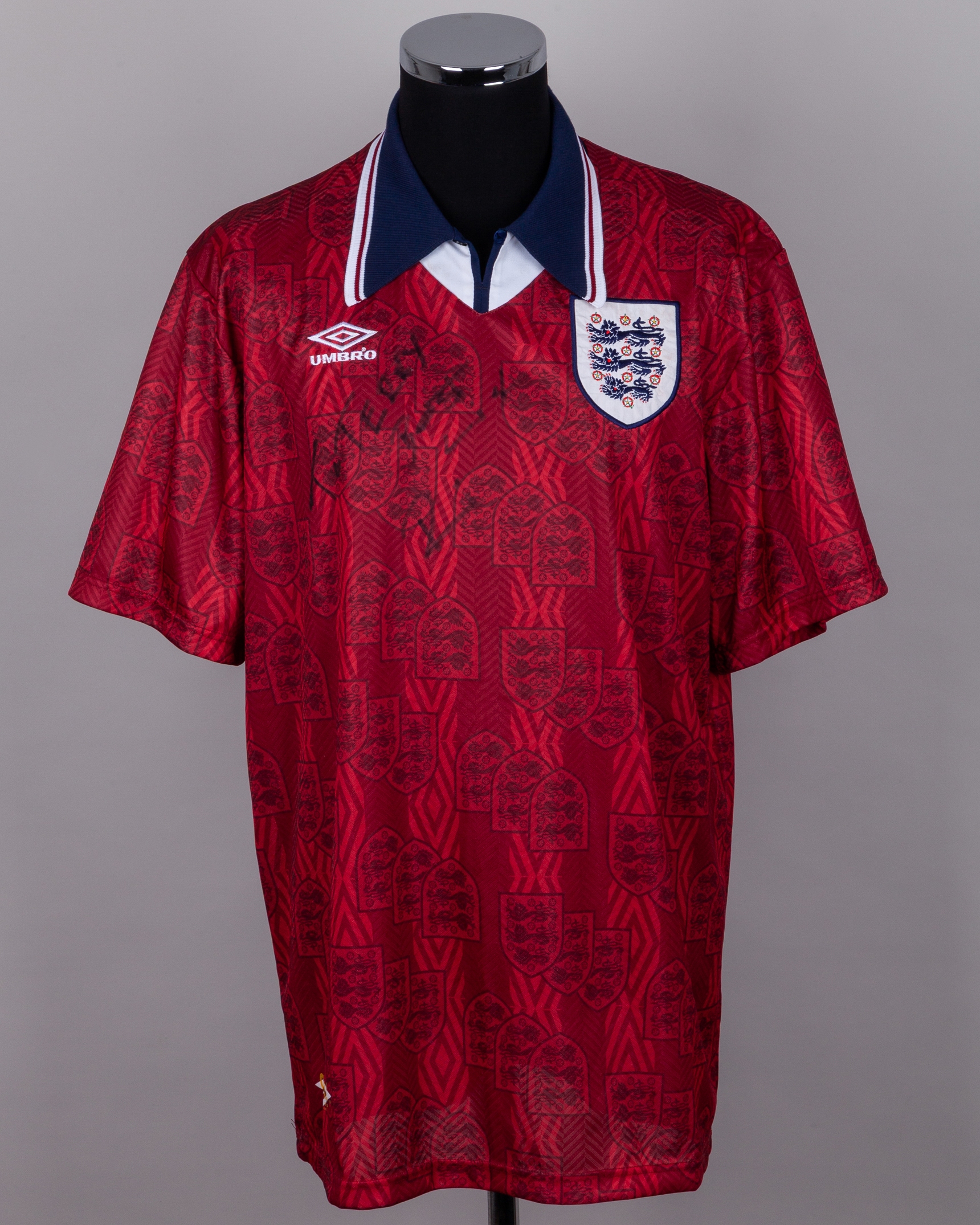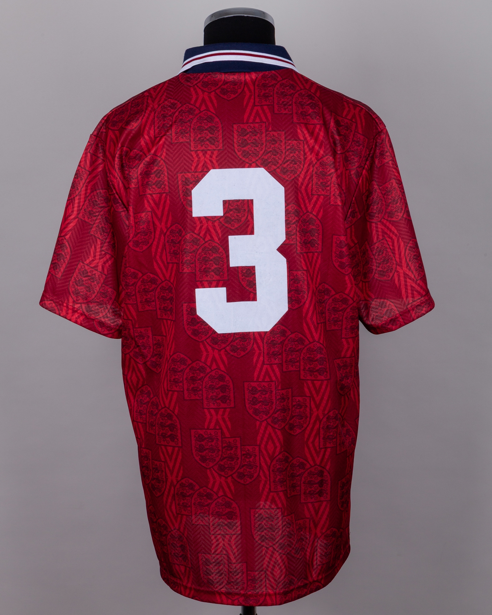 Red and blue No. 3 England short-sleeved shirt, 1994-95, Umbro, XL, with button-up collar and embroidered cloth badge