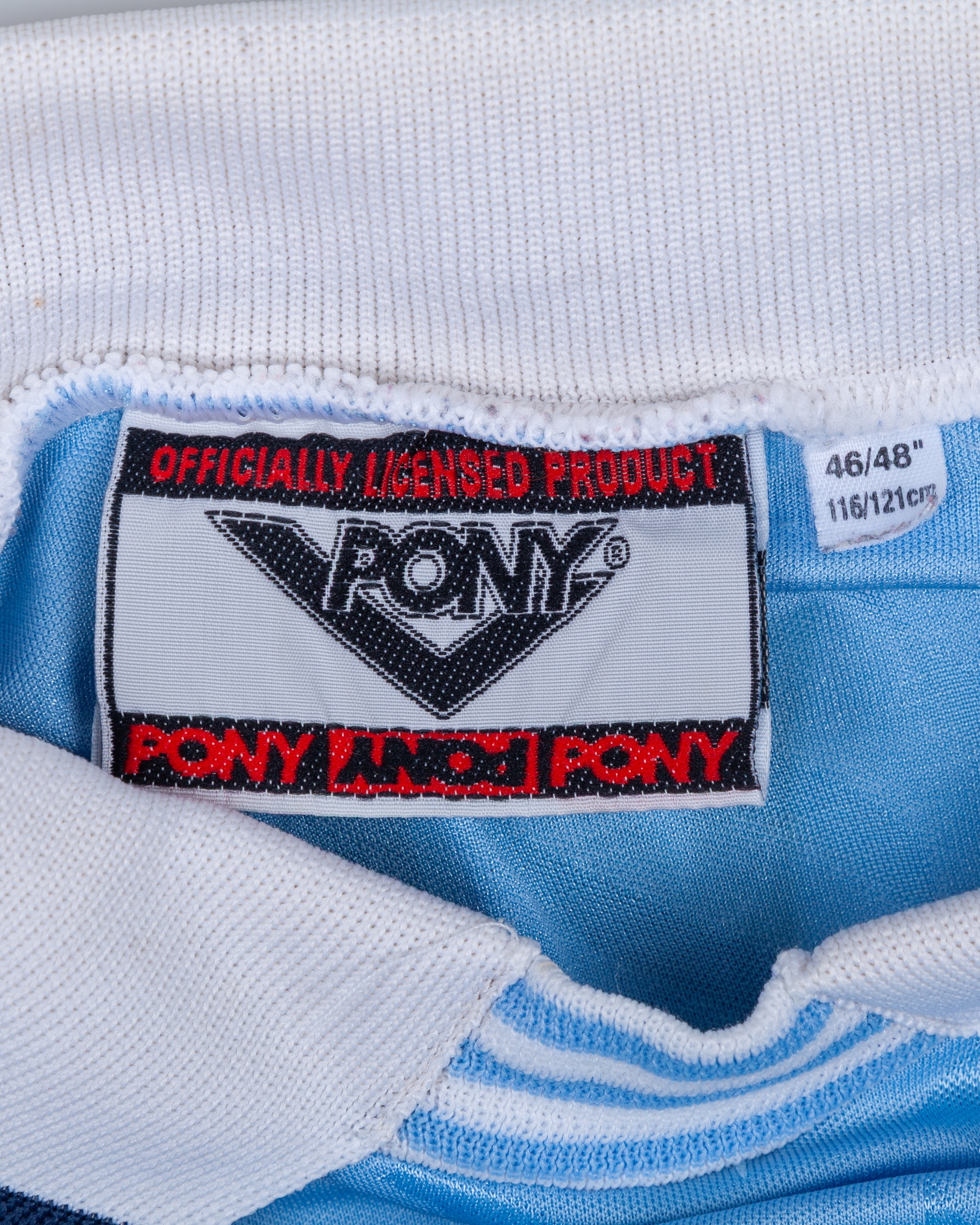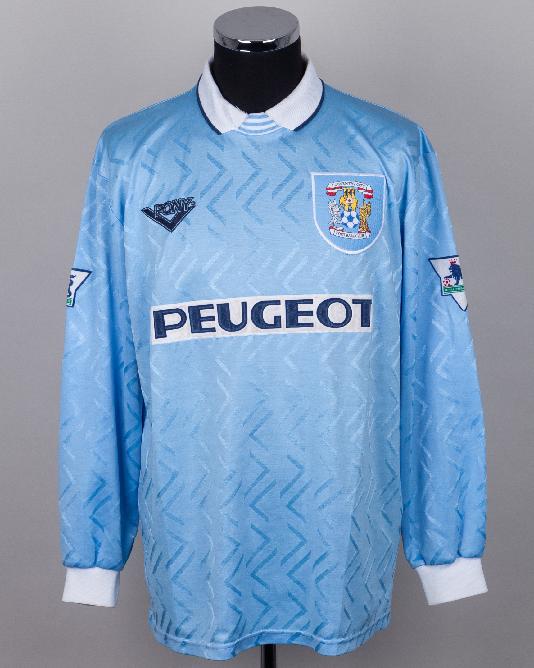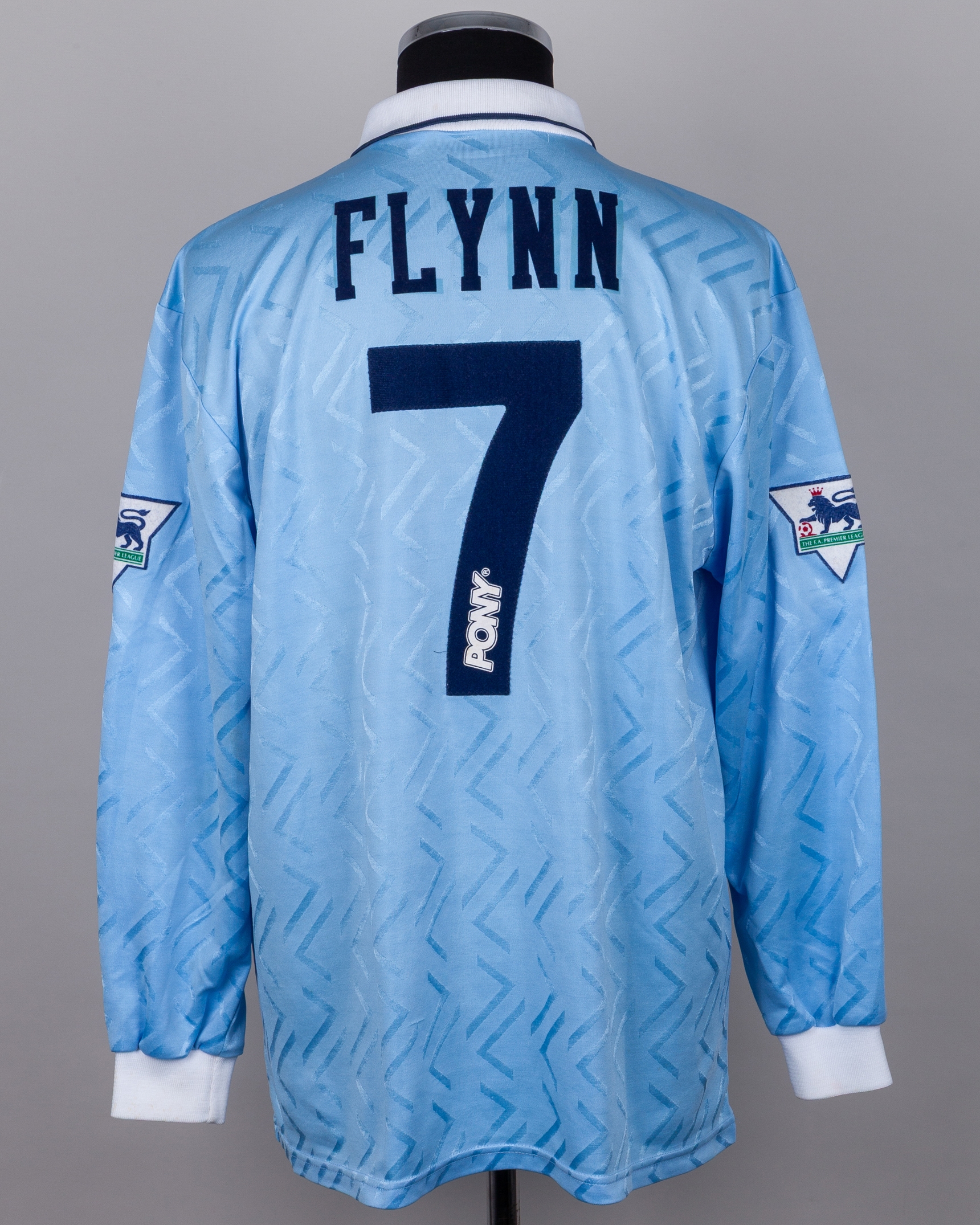 Sean Flynn blue No.7 Coventry City long-sleeved shirt, 1994-96, Pony, 46/48", with crew-neck collar and embroidered cloth badge inscribed COVENTRY CITY FOOTBALL CLUB, the reverse lettered FLYNN, the sleeves with The F.A. Premier League flashes, with some pulls, discolouation and name loose