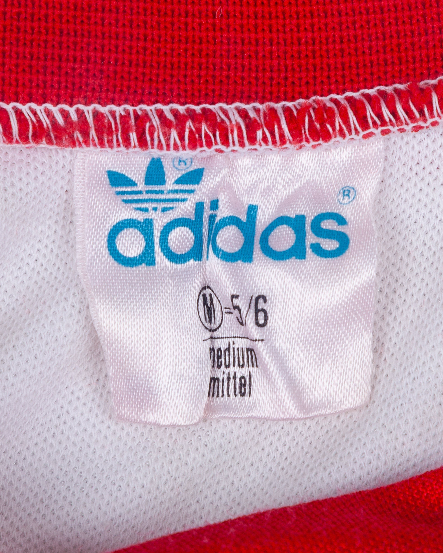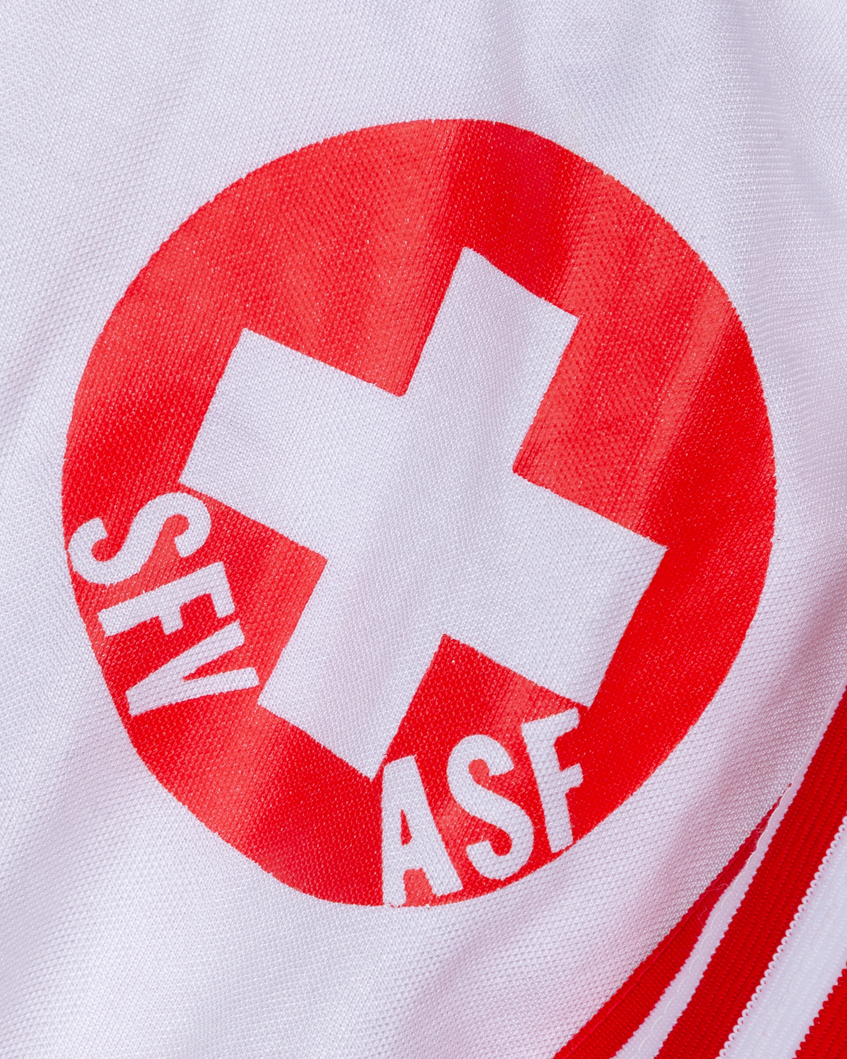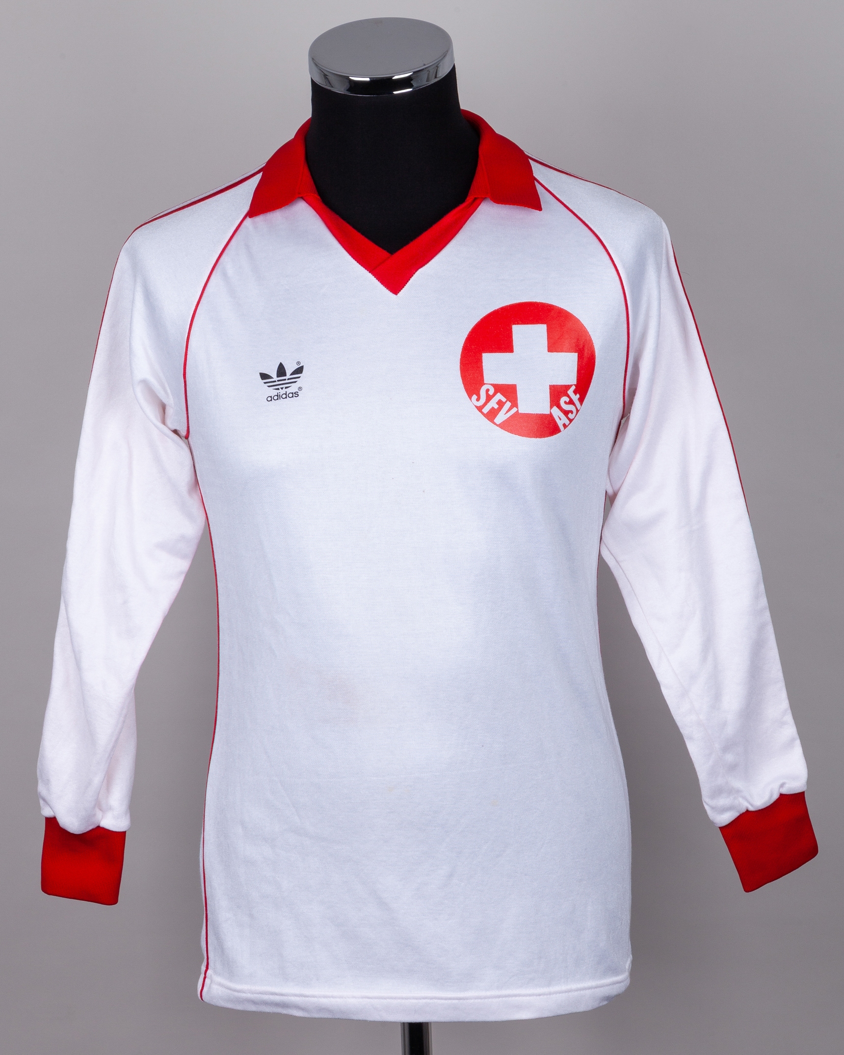 White and red No.15 Switzerland long-sleeved shirt, 1980, Adidas, M, with v-neck collar and printed badge