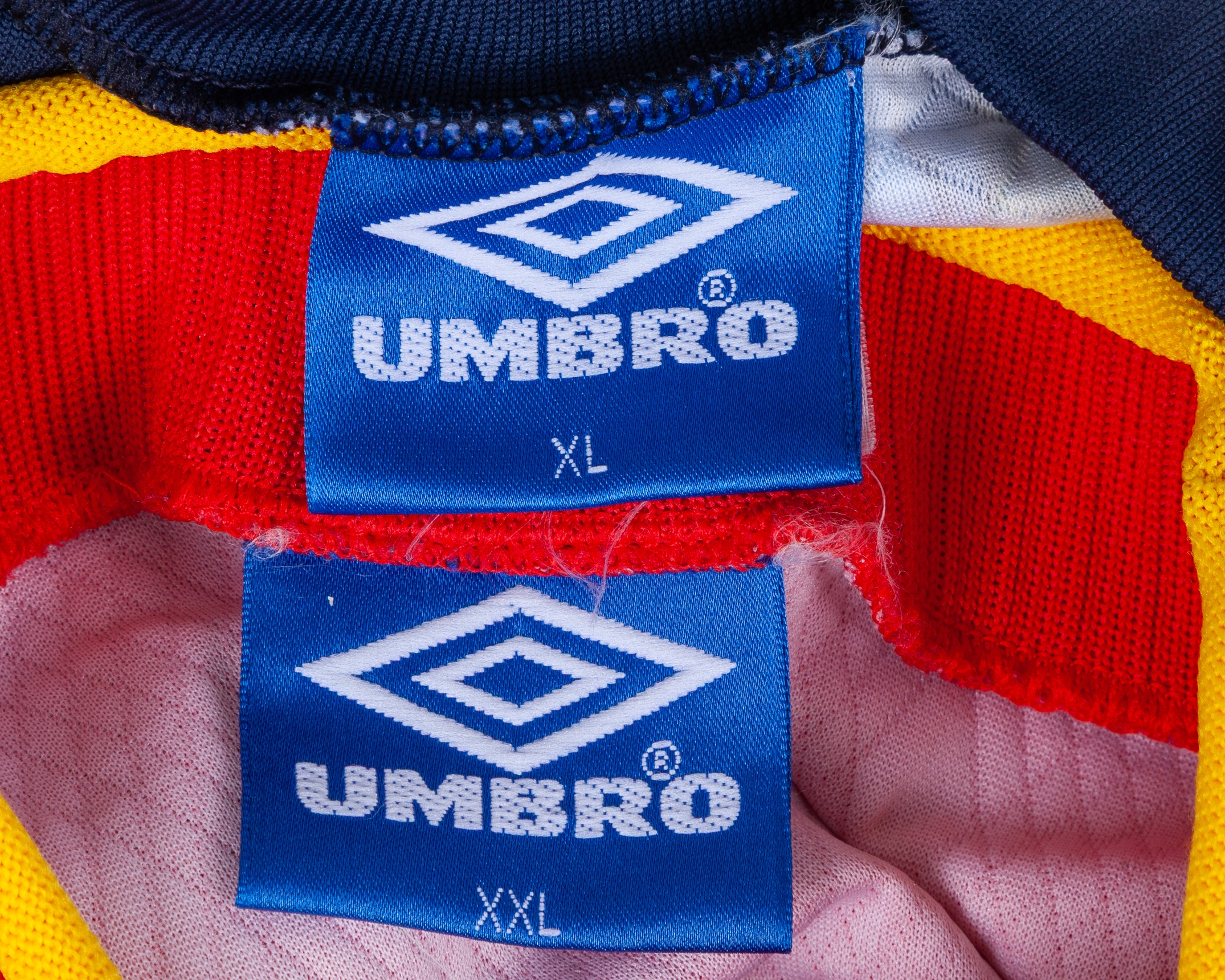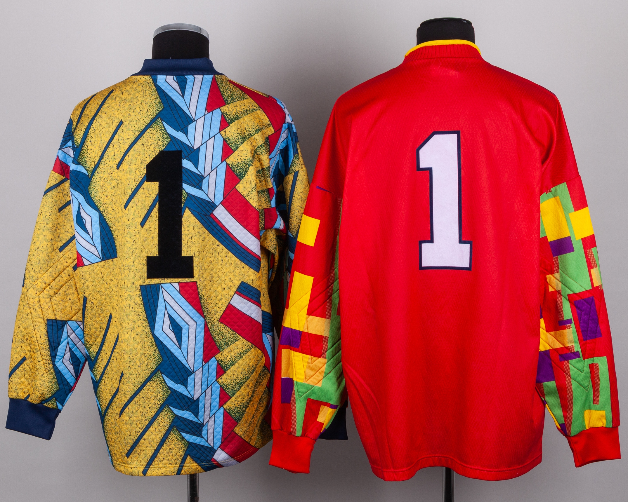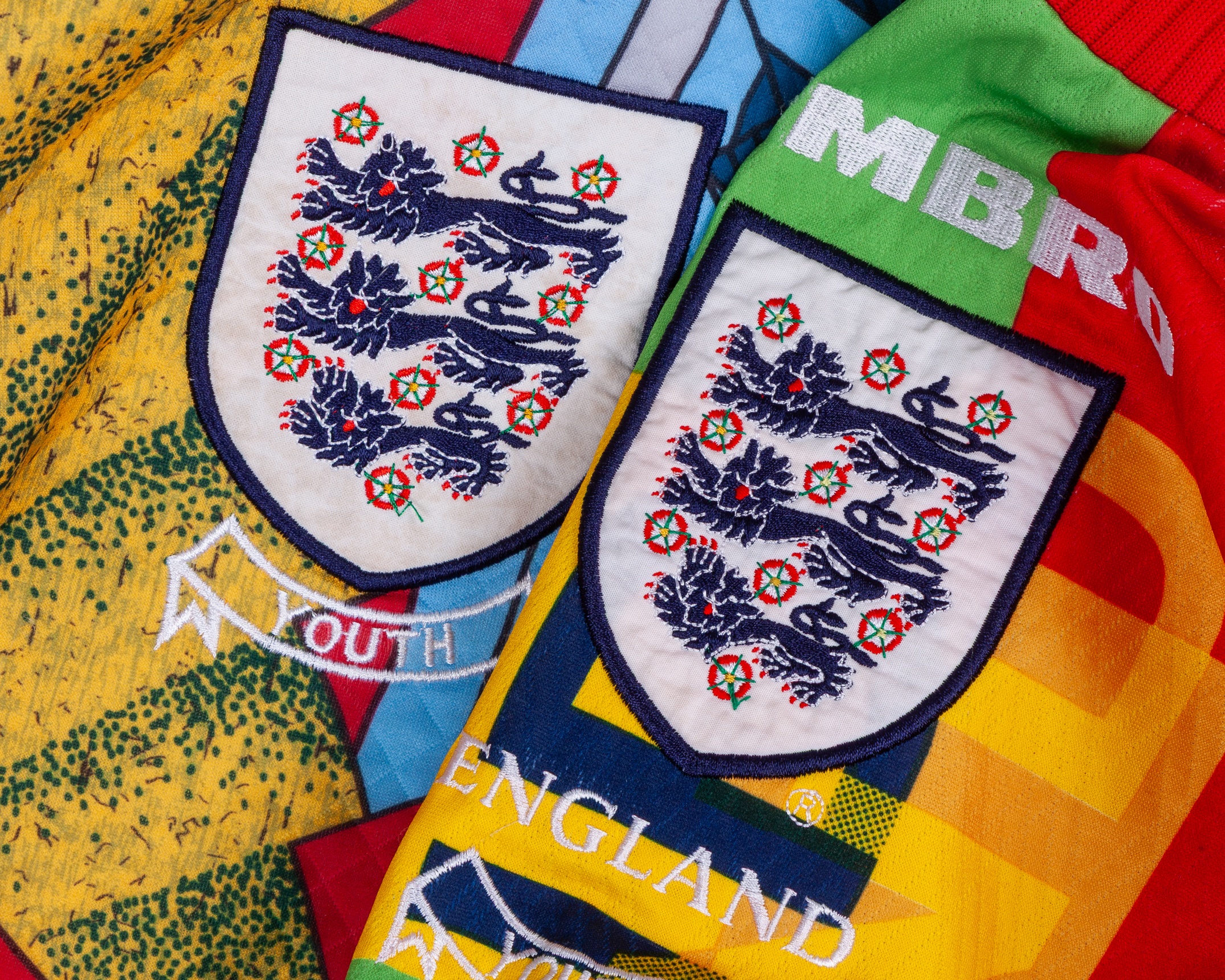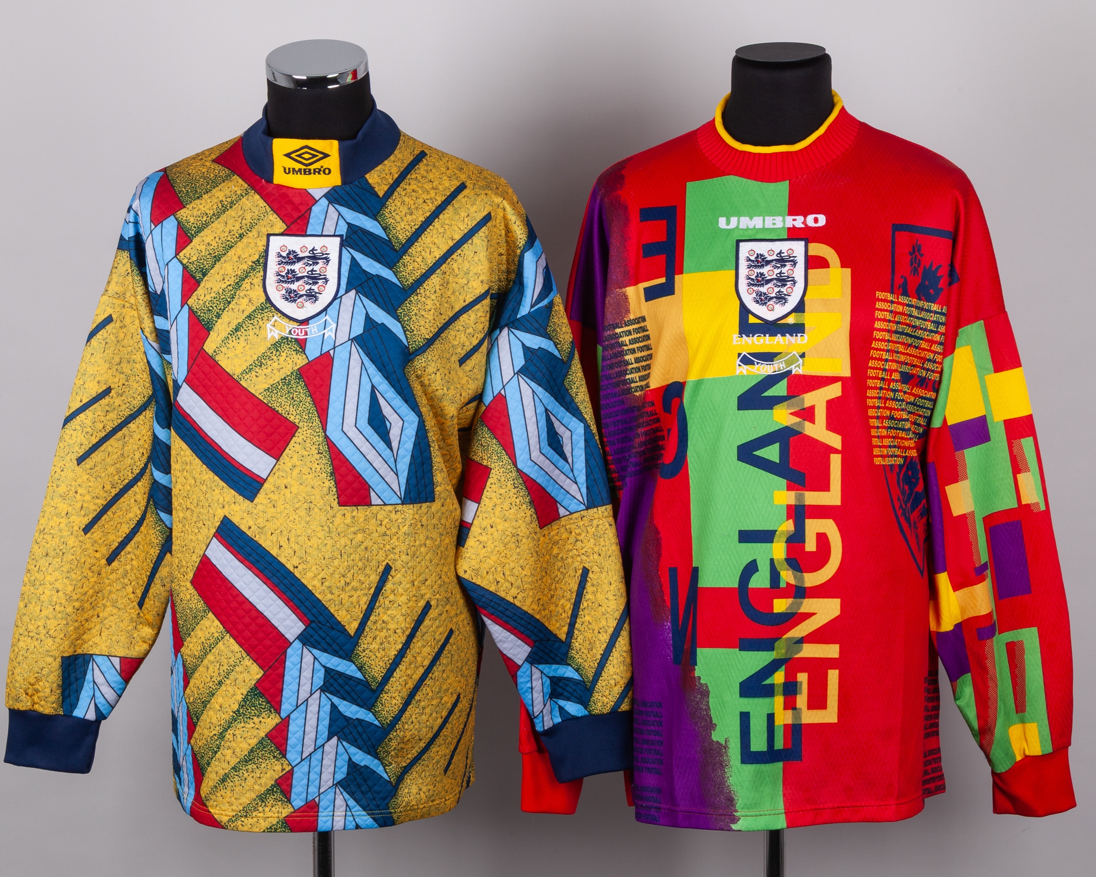 Multi-colour No.1 England Youth goalkeepers shirt, Umbro XXL, with crew-neck collar and embroidered cloth badge inscribed YOUTH and another similar, Umbro, XL (2)