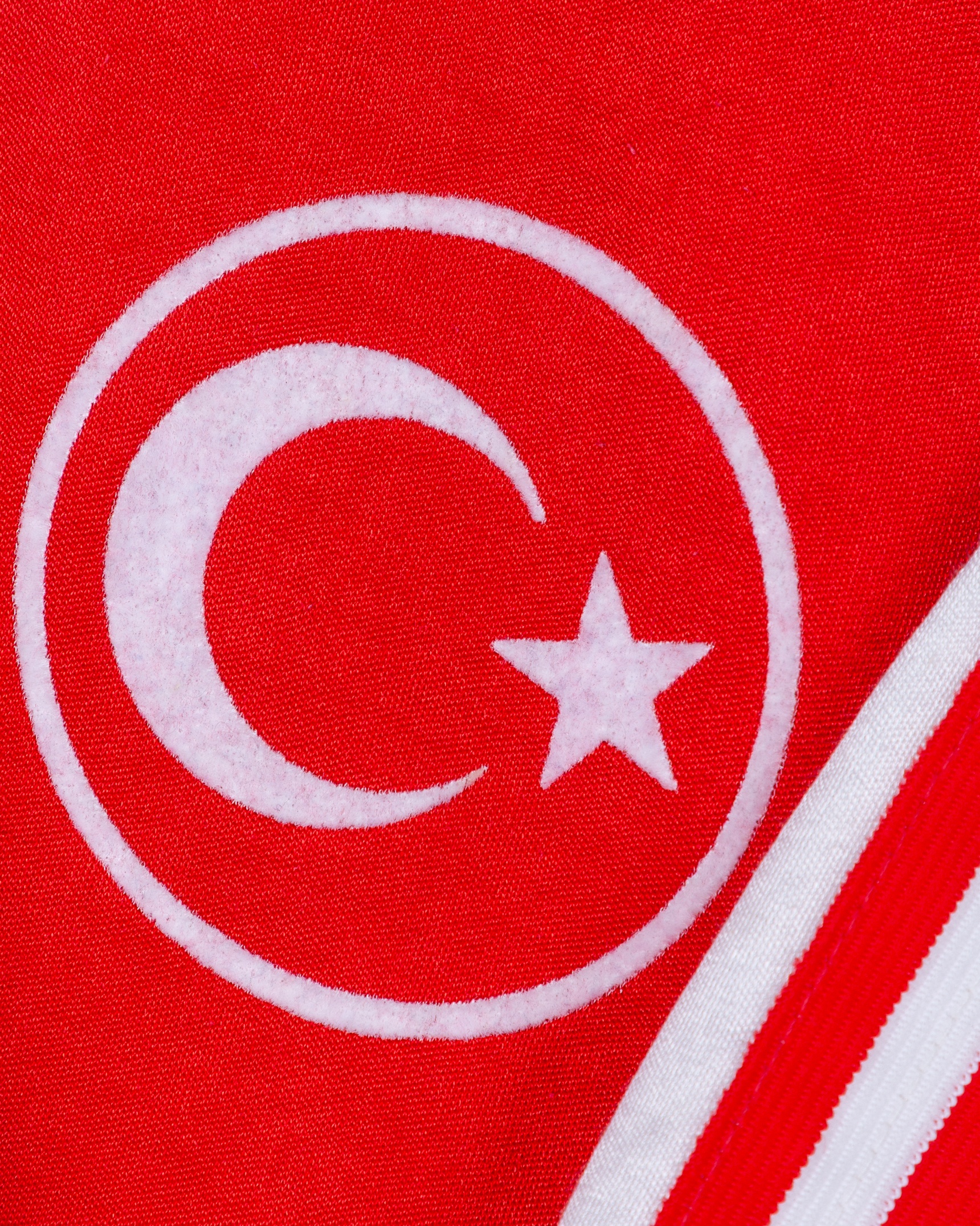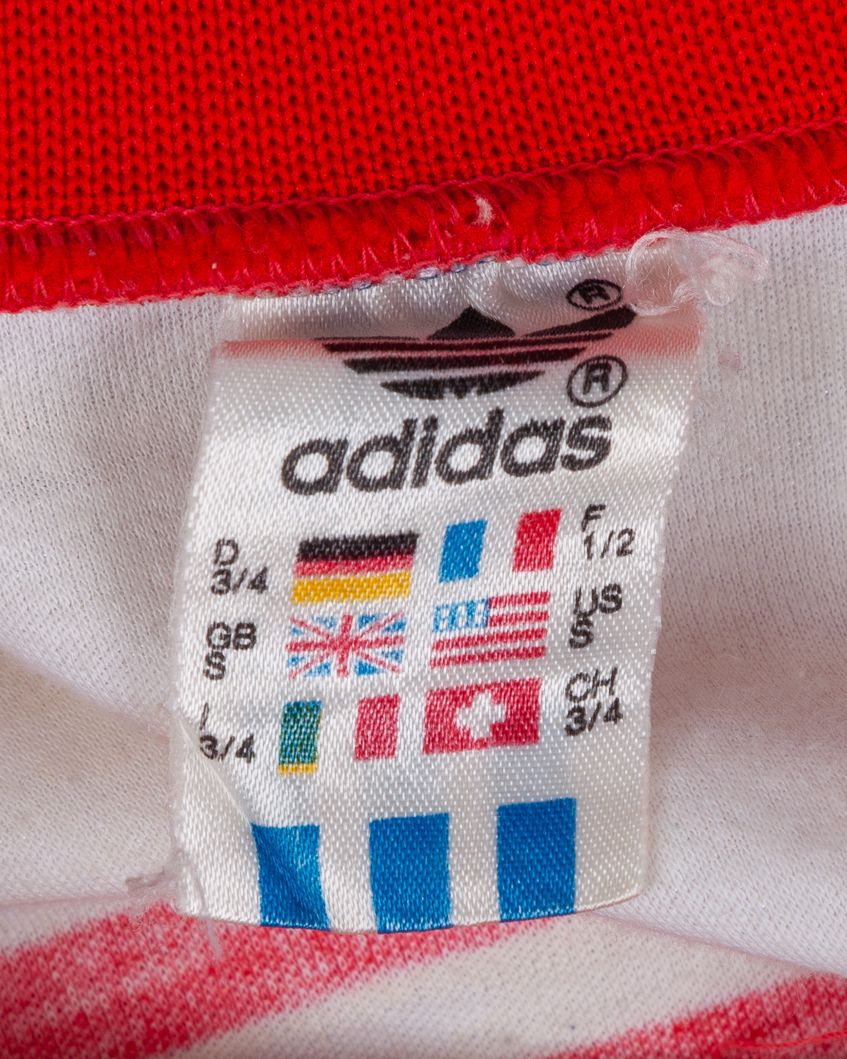 White and red No.17 Turkey long-sleeved shirt, 1980, Adidas, S, with v-neck collar and sponge badge, staining