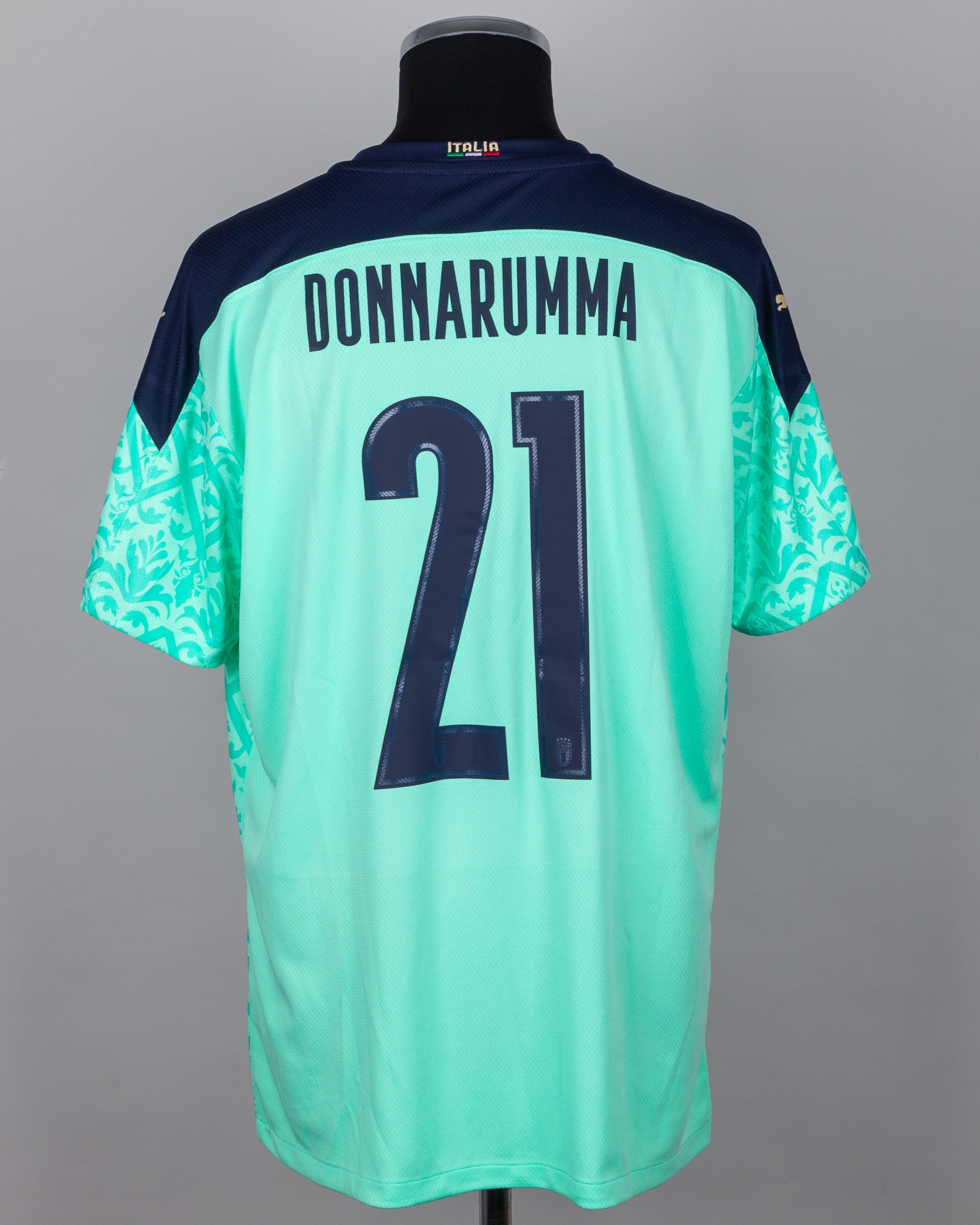 Gianluigi Donnarumma green and blue No.21 Italy match issued goalkeepers shirt, 2021