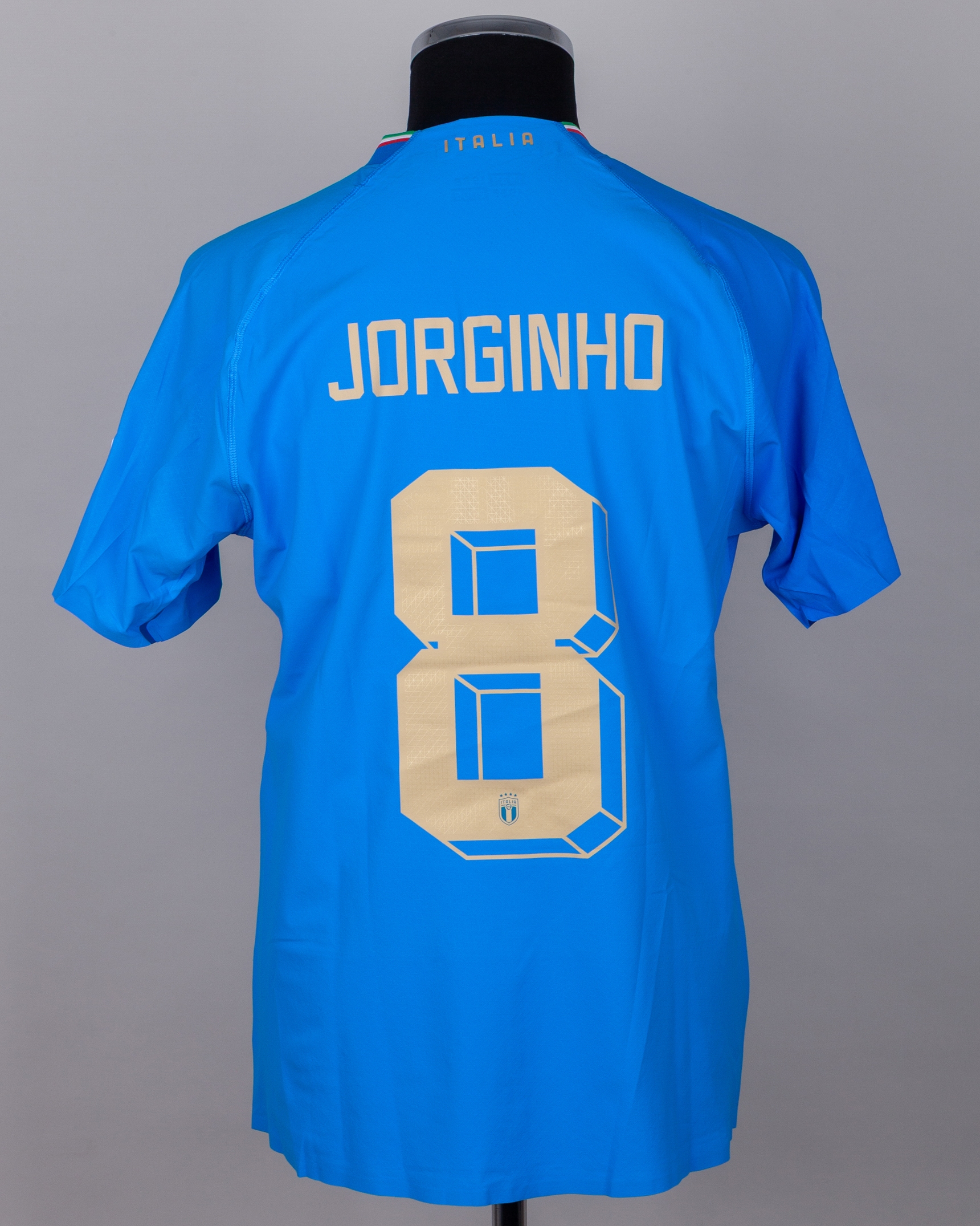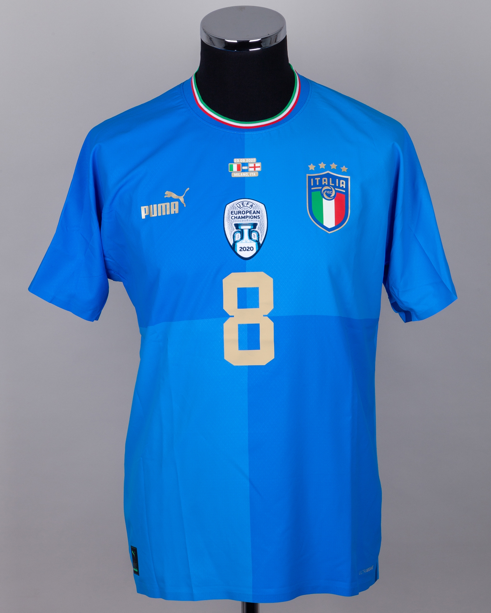 Jorginho blue No.8 Italy v. England match issued short-sleeved shirt, 2022, Puma, M, with crew-neck collar and printed badge with flags of nations 23.09.2022, MILANO, ITA decal, with UEFA EUROPEAN CHAMPIONS 2020 badge, the reverse lettered JORGINHO, the sleeves with UEFA Nations Lea and UEFA Foundation flashes