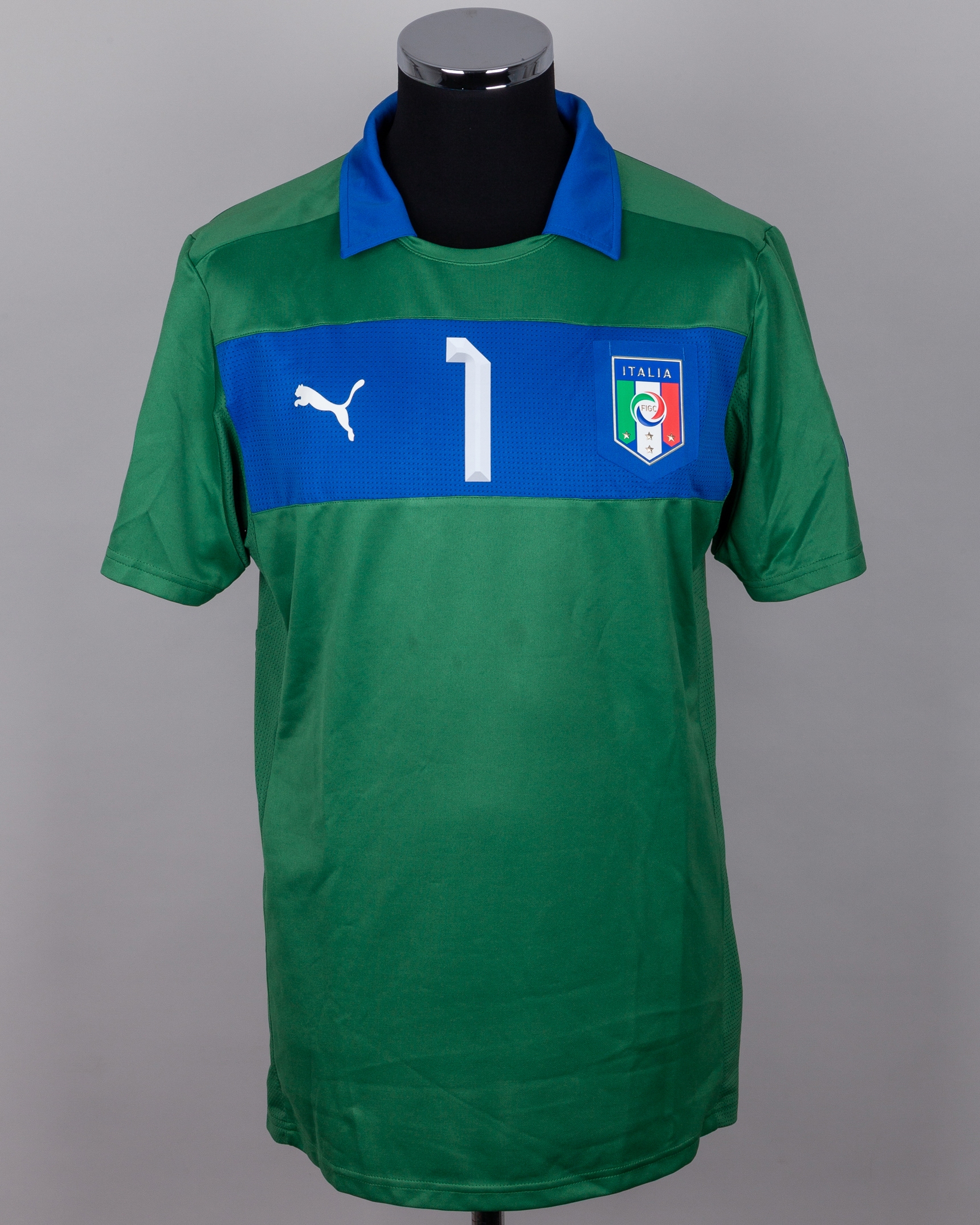 Gianluigi Buffon green and blue No.1 Italy v. England match worn short-sleeved shirt, 2012, Puma, XL, with crew-neck collar and printed badge, the reverse lettered buffon, the right sleeve with UEFA 2012 flash, the other with UEFA Respect flash