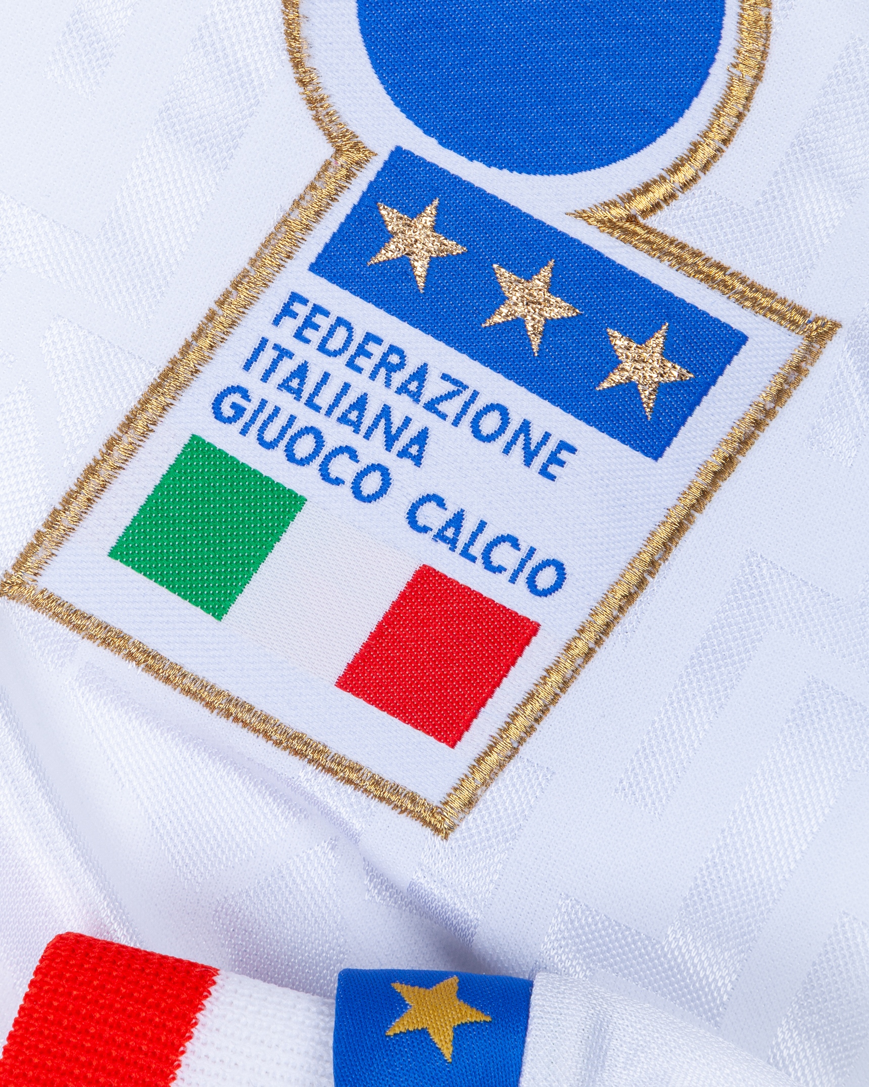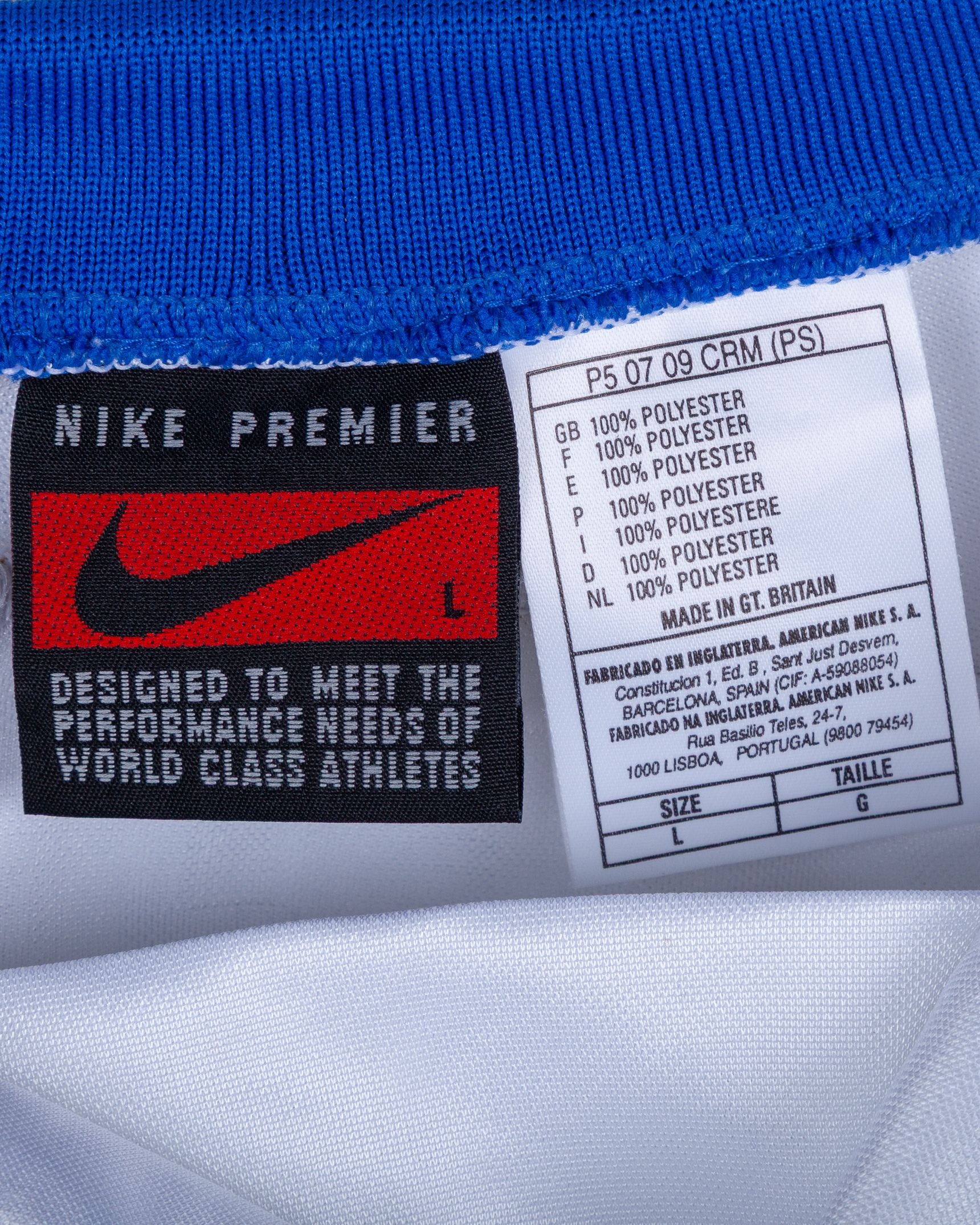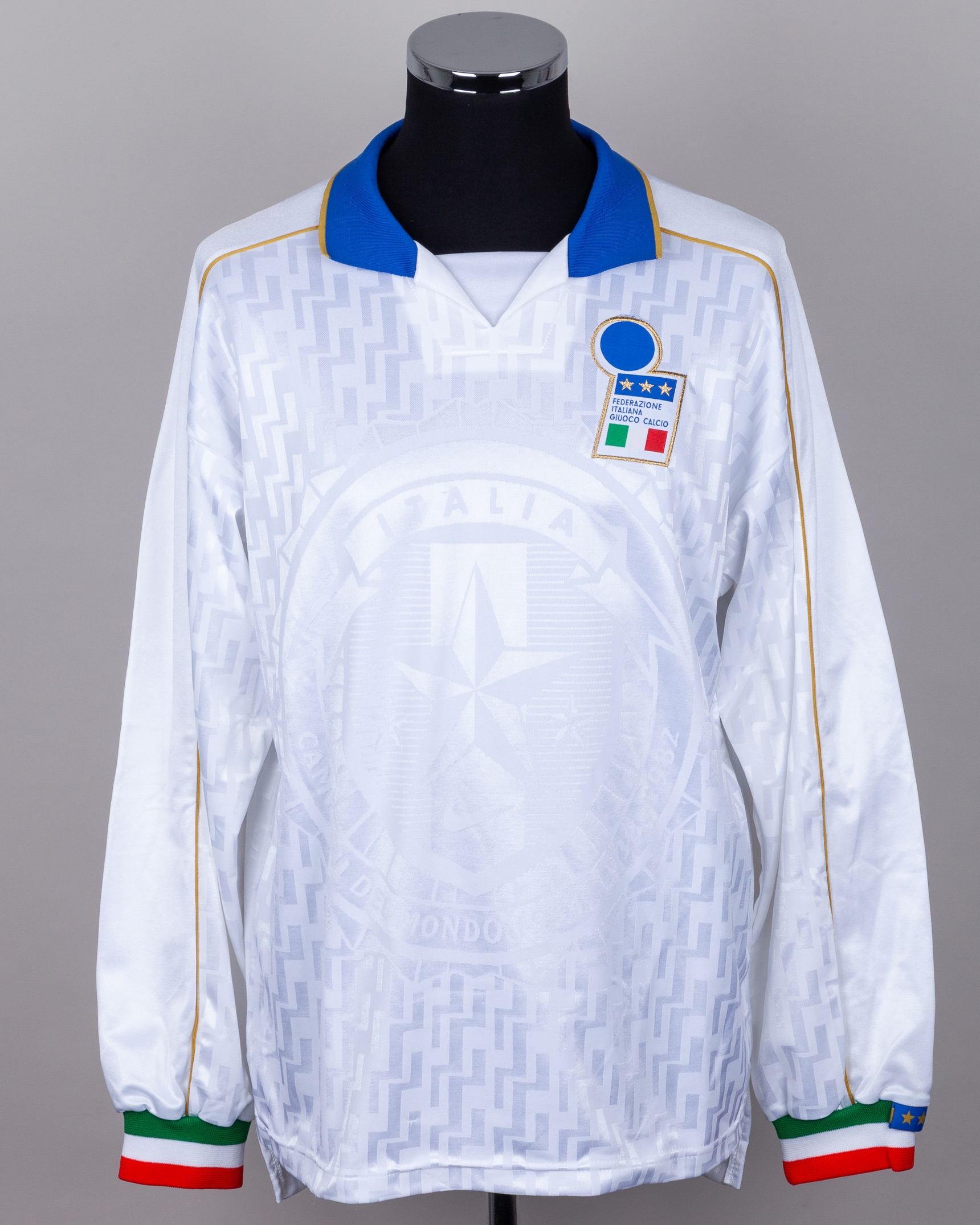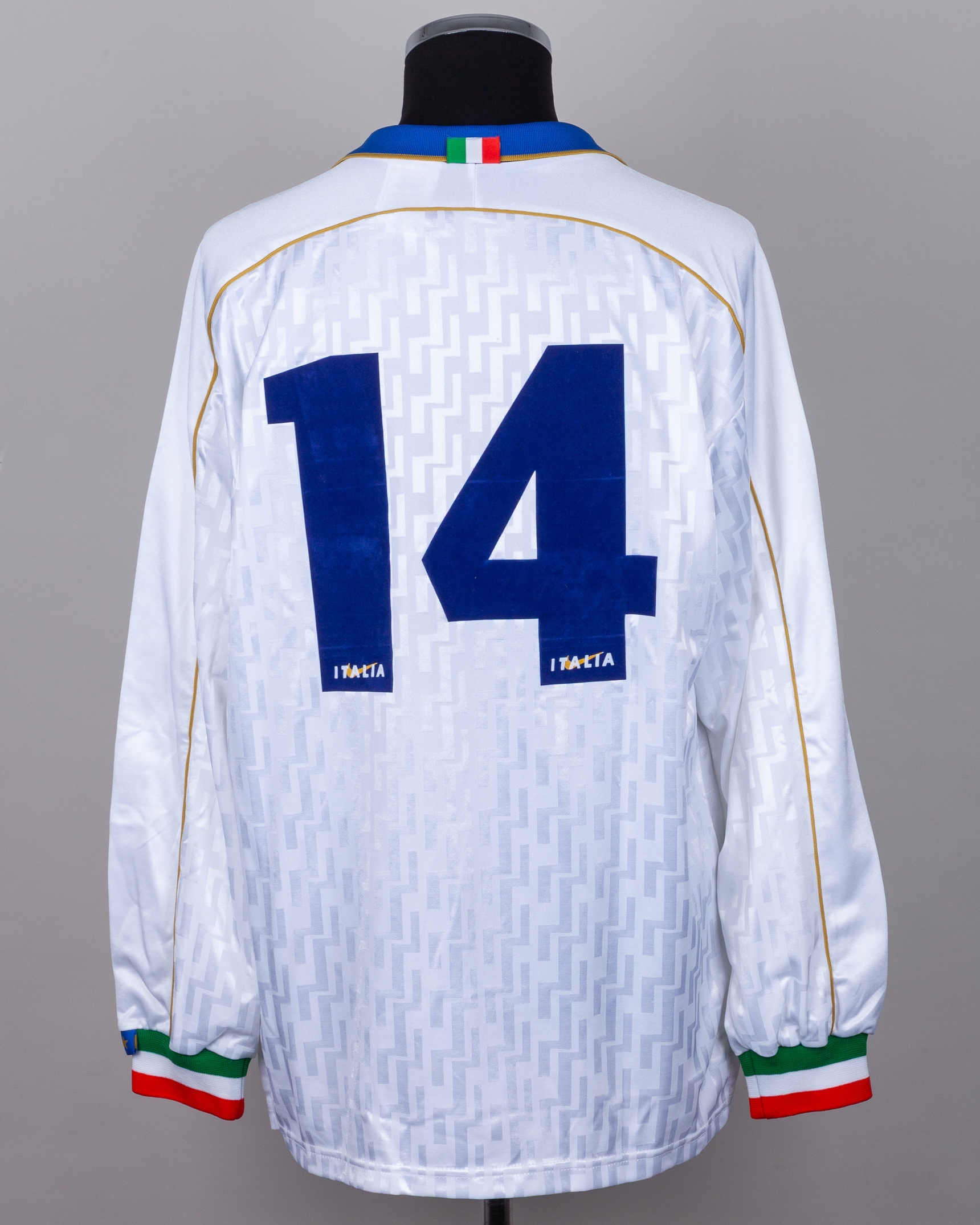 Antonio Conte white and blue No.14 Italy v. Ukraine match worn long-sleeved shirt, 1996, Nike, L, with v-neck collar and embroidered cloth badge inscribed FEDERAZONE ITALIANA GIUOCO CALCIO