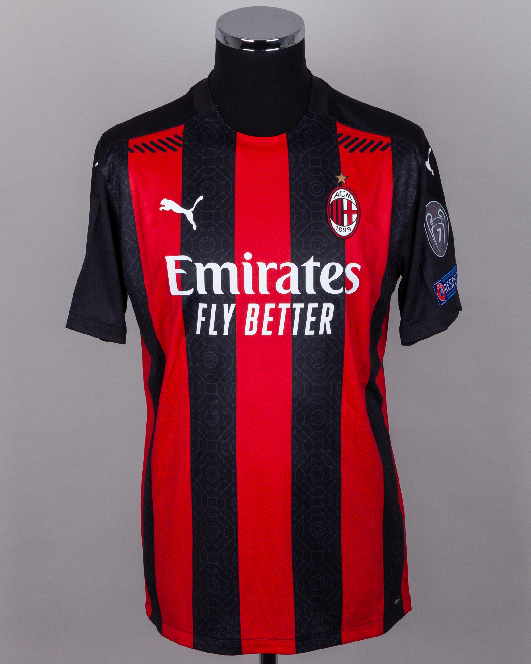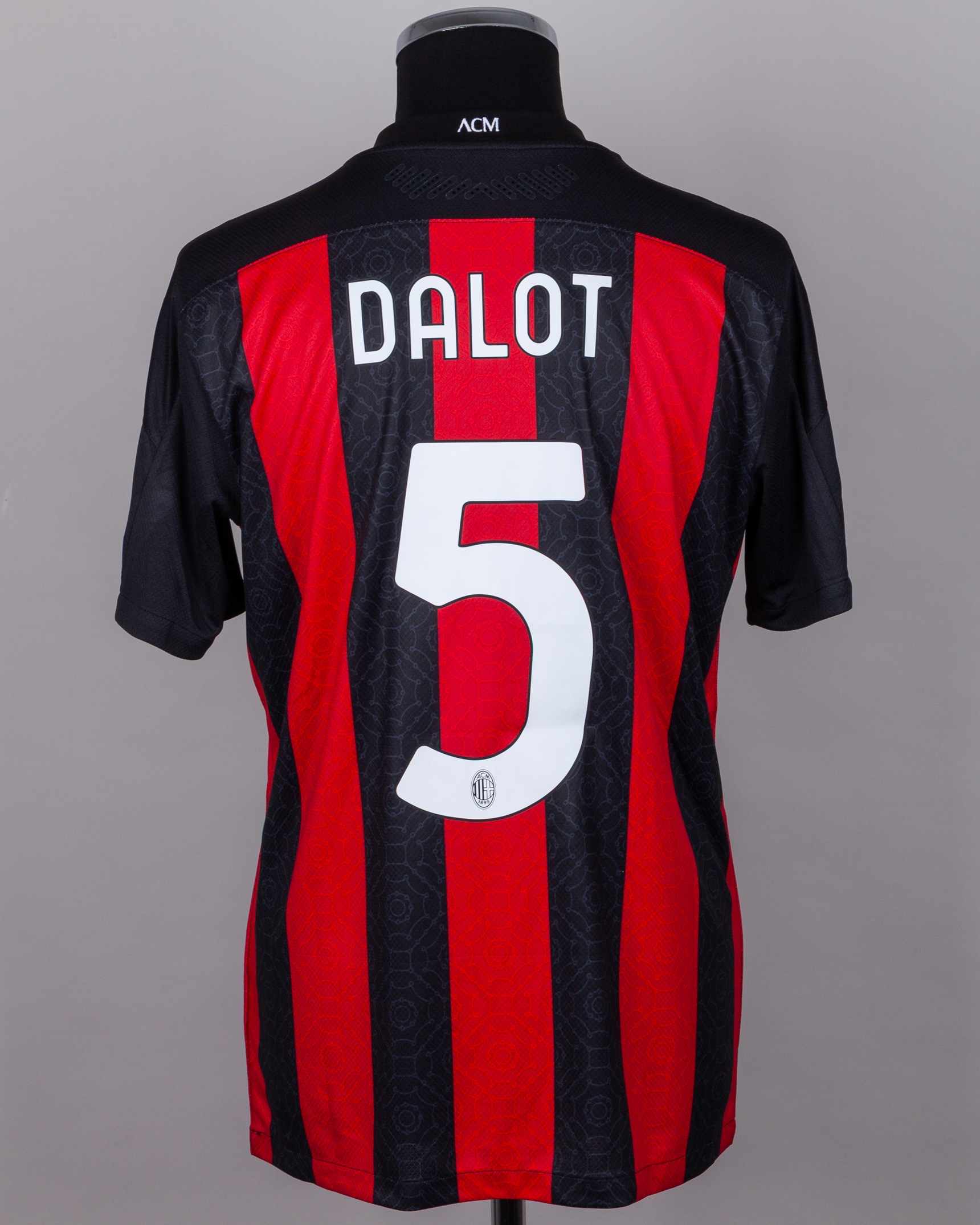 Diogo Dalot red and black No.5 AC Milan match worn short-sleeved shirt, 2020-21, Puma, L, with crew-neck collar and printed badge, the reverse lettered DALOT, the right sleeve with Europa League flash and the left sleeve with 7 Champions League and respect flash