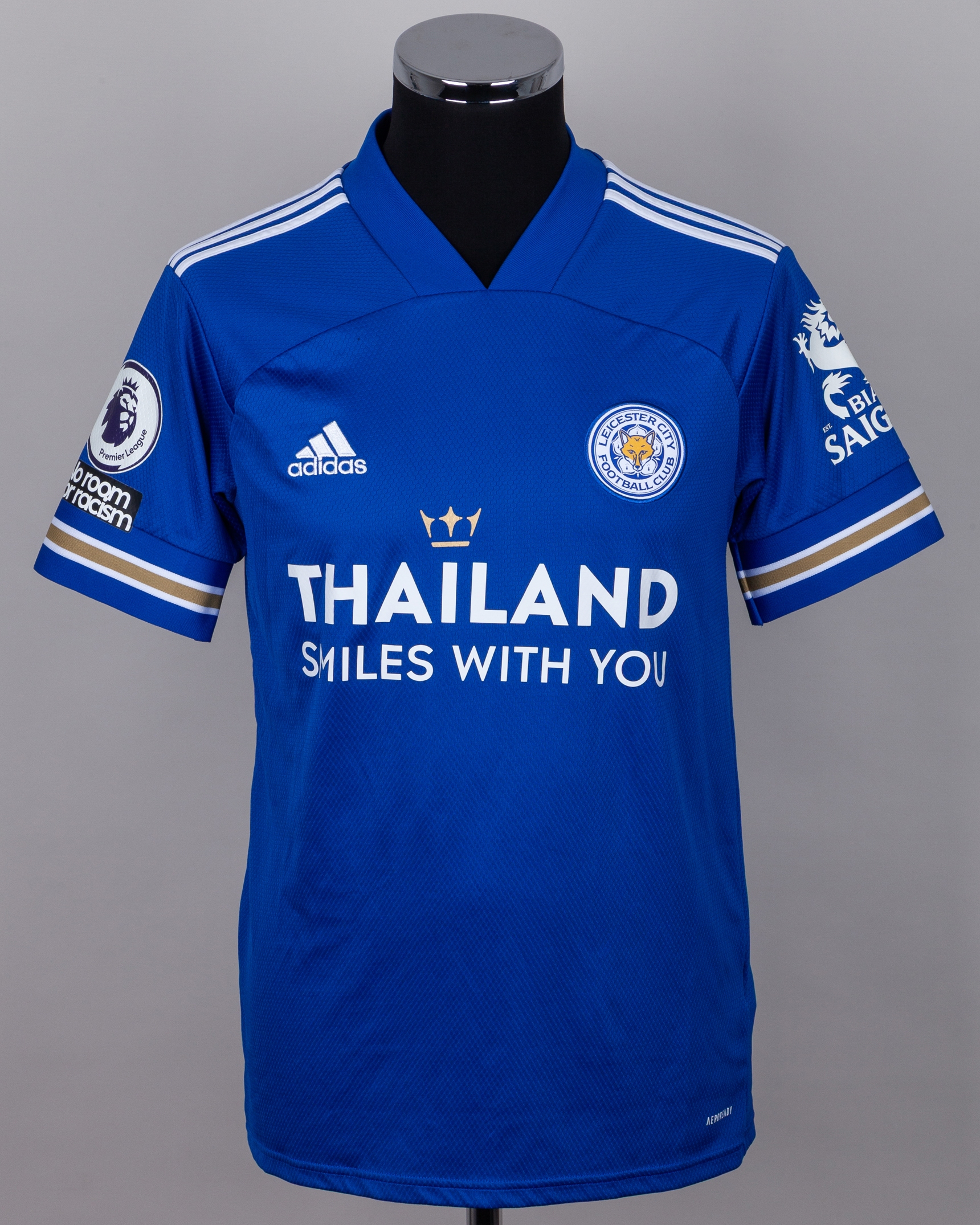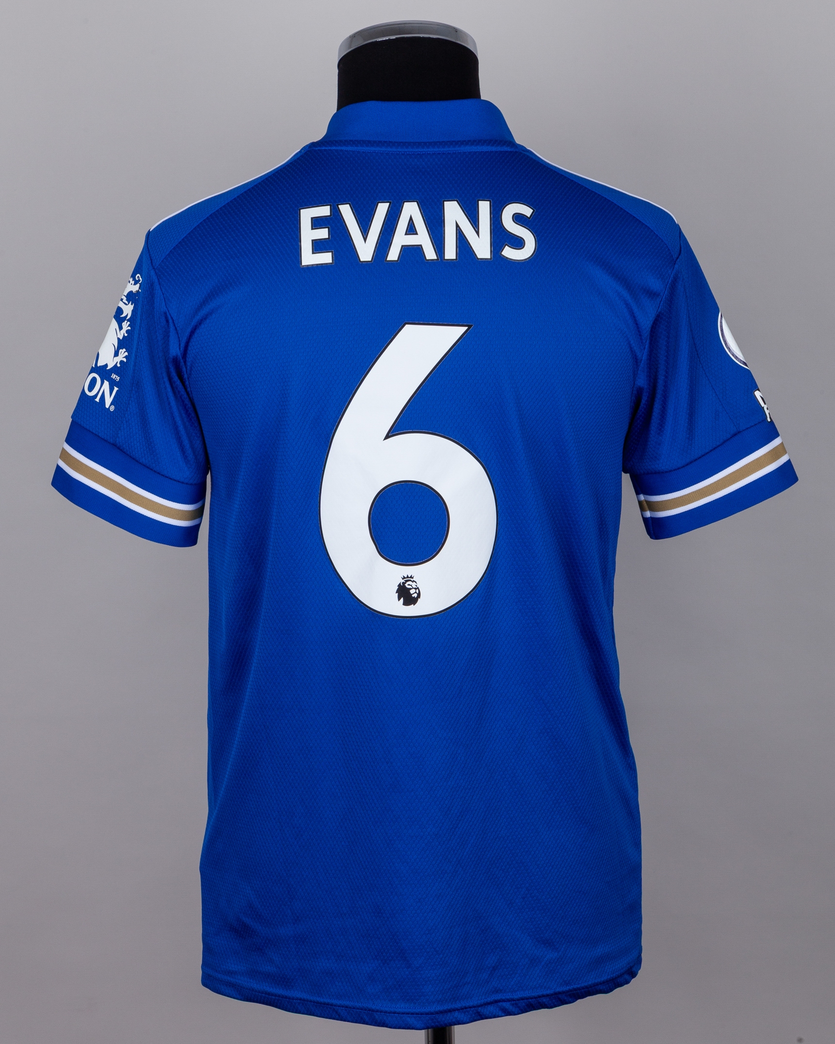 Jonny Evans blue No.6 Leicester City match worn short-sleeved shirt, 2020-21, Adidas, M, with v-neck collar and embroidered cloth badge inscribed LEICESTER CITY FOOTBALL CLUB, the reverse lettered EVANS, the right sleeve with Premier League flash