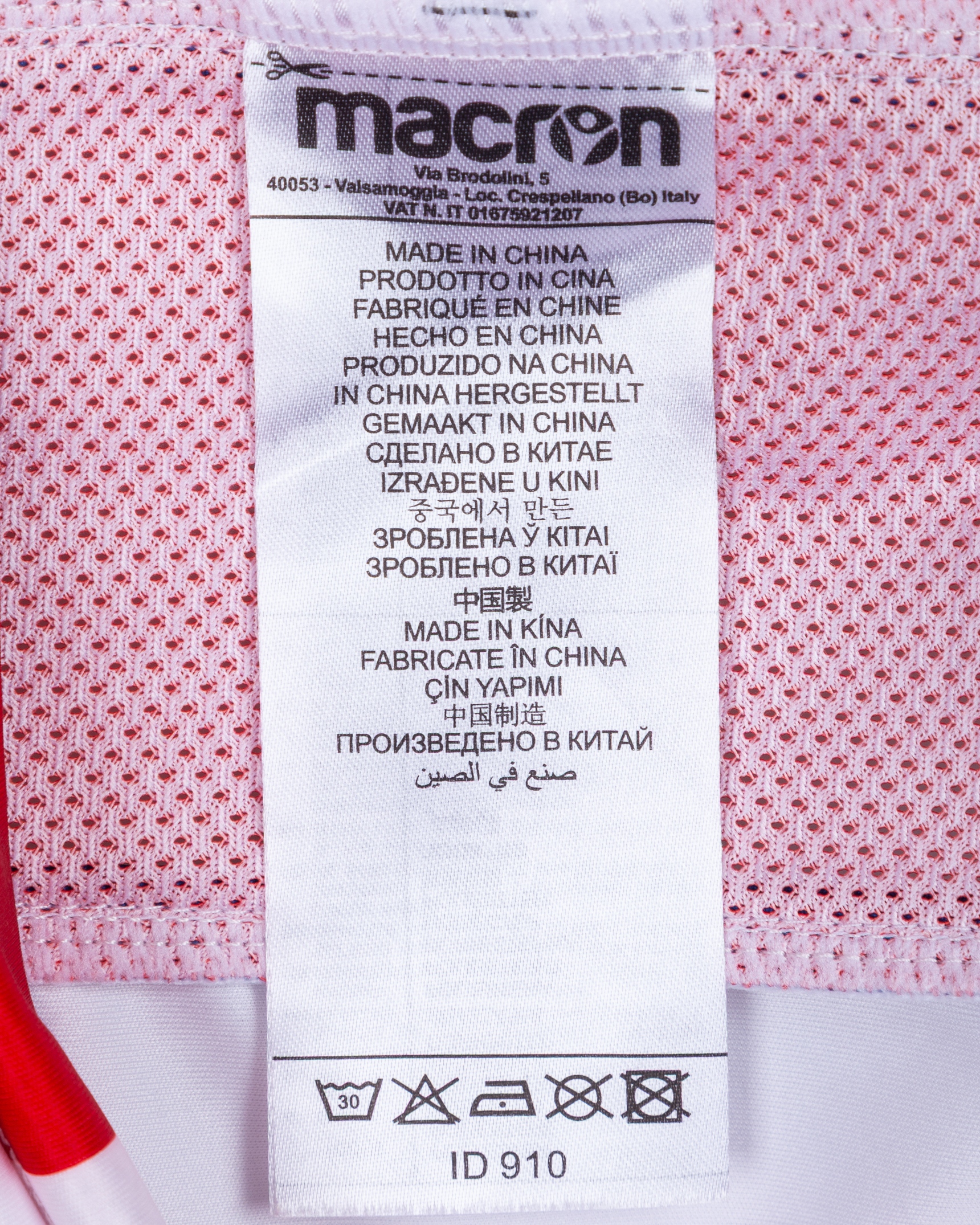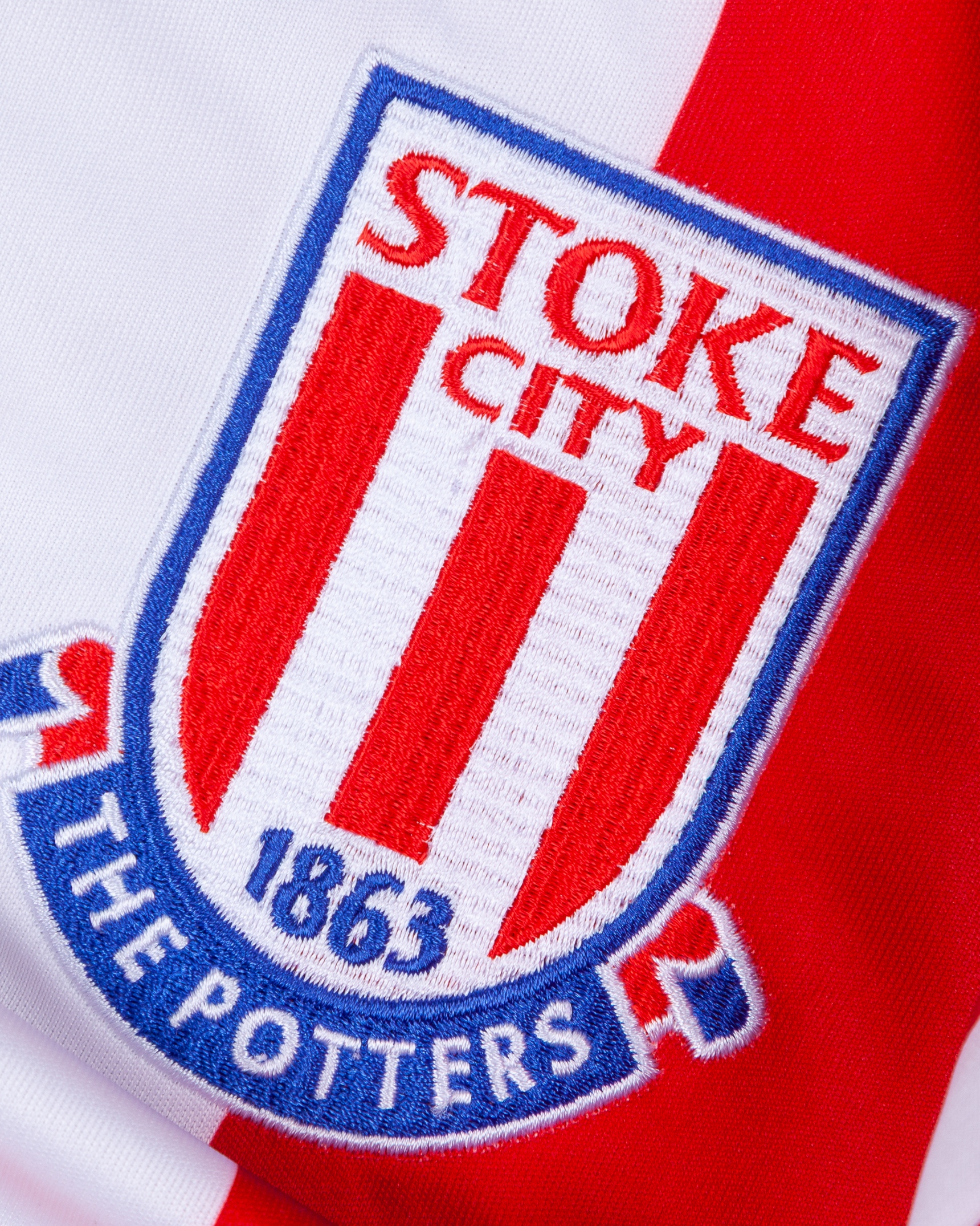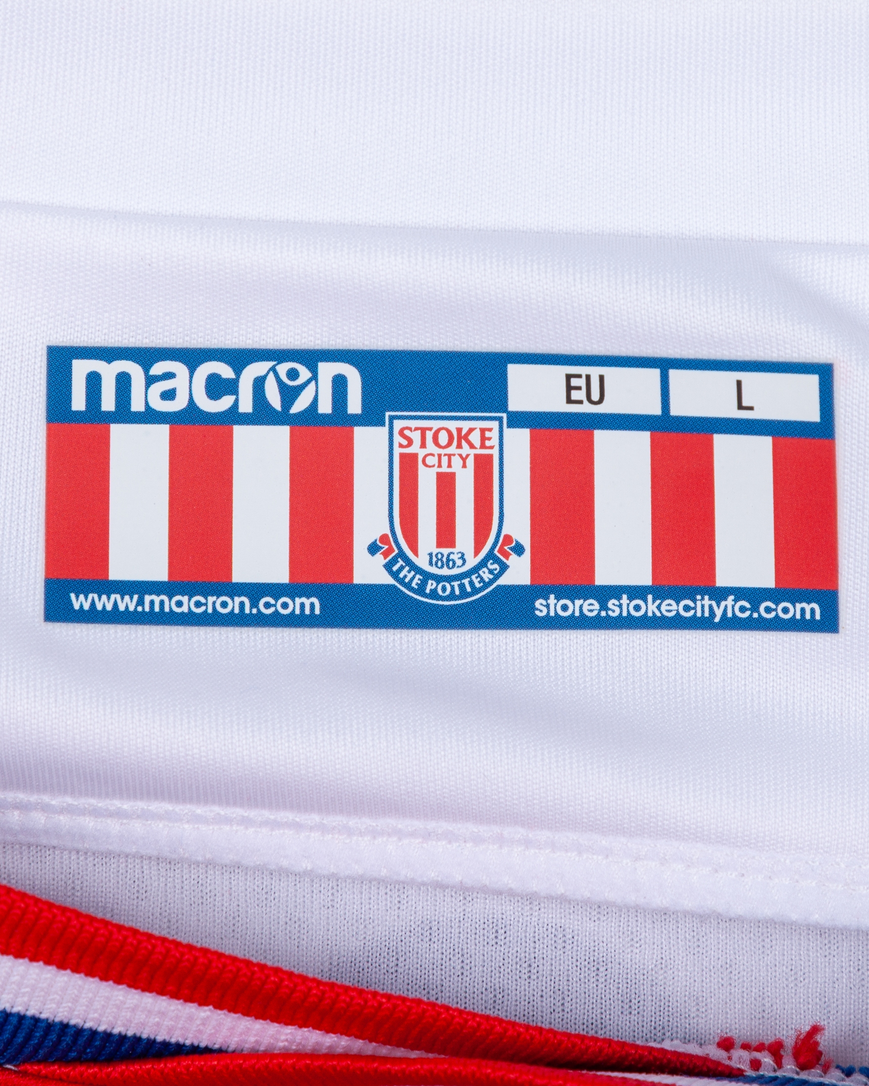 Mame Biram Diouf red and white No.18 Stoke City match worn short-sleeved shirt, 2017-18, Macron, L, with crew-neck collar and embroidered badge inscribed STOKE CITY 1863 THE POTTERS, the right sleeve with Premier League flash, with some staining