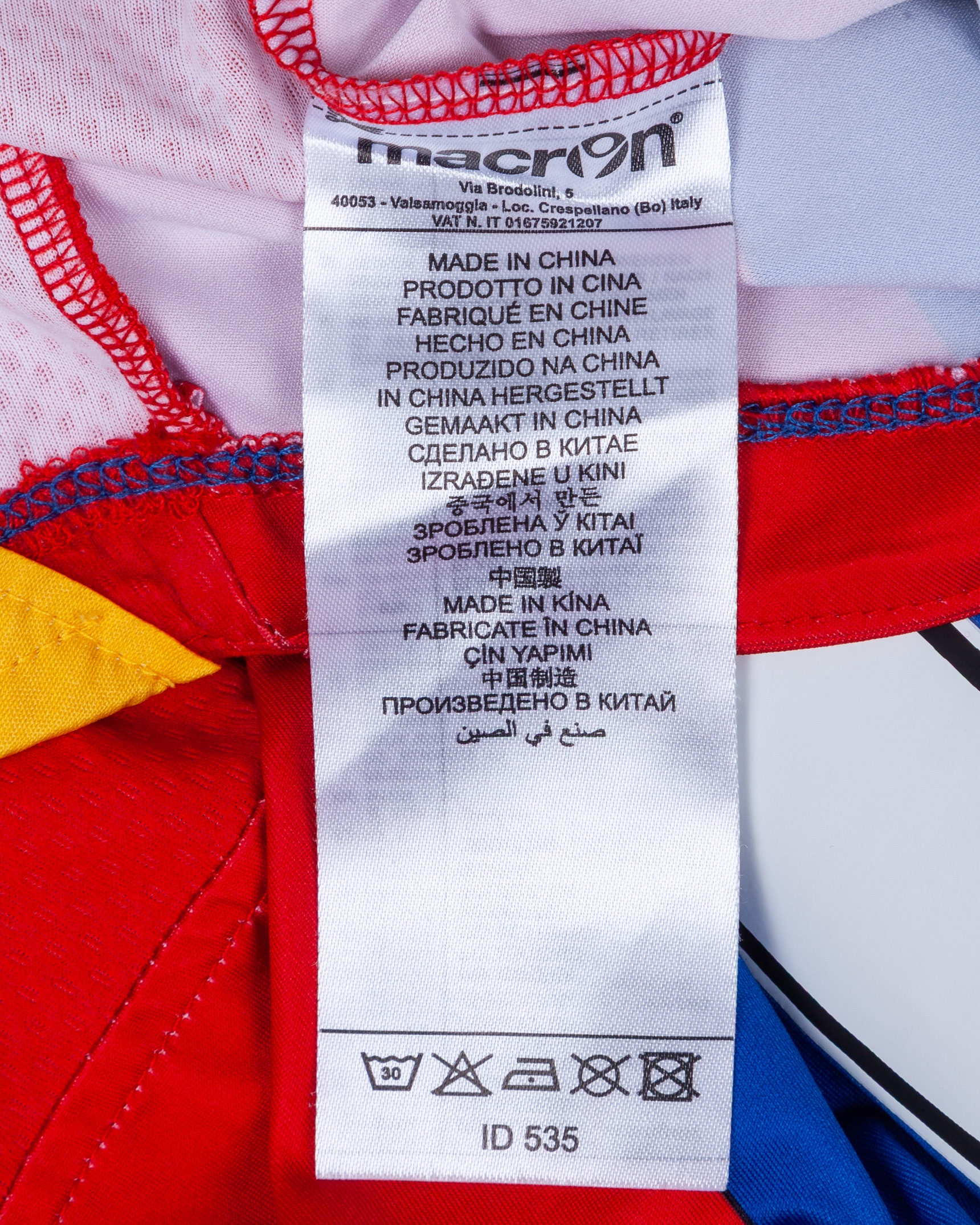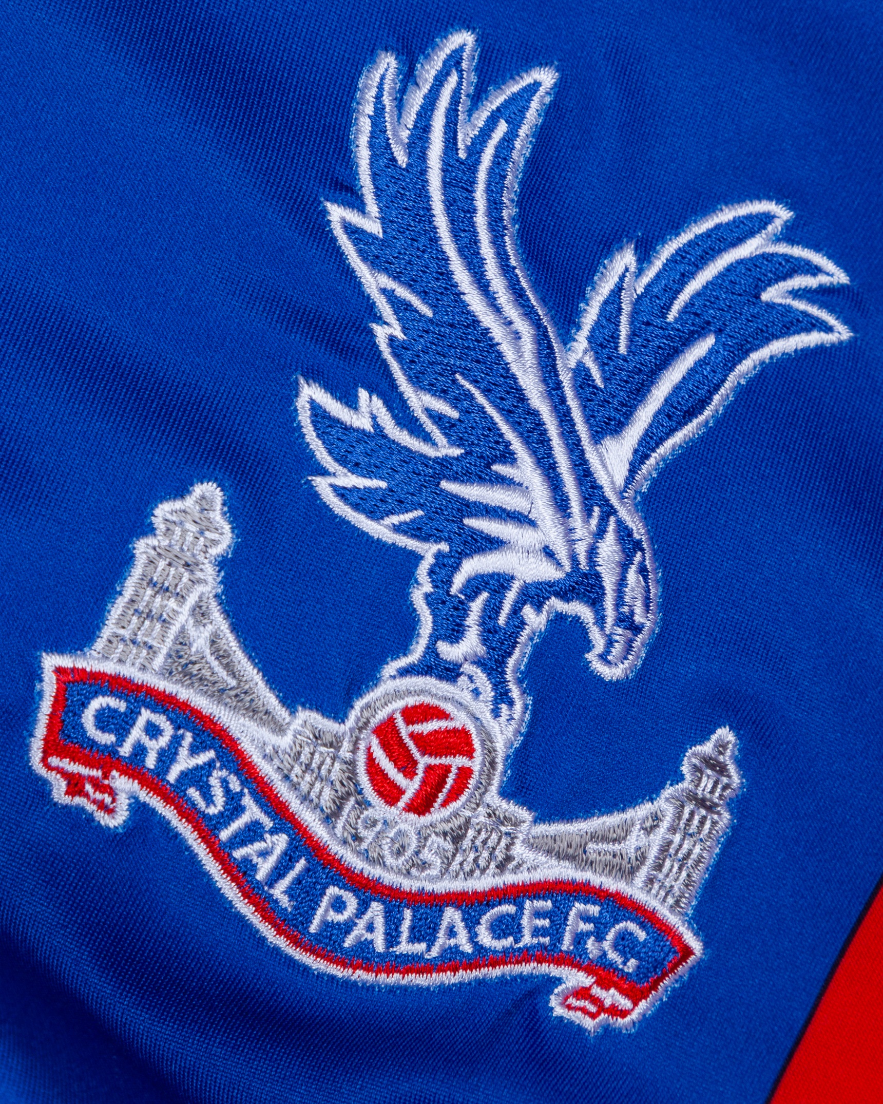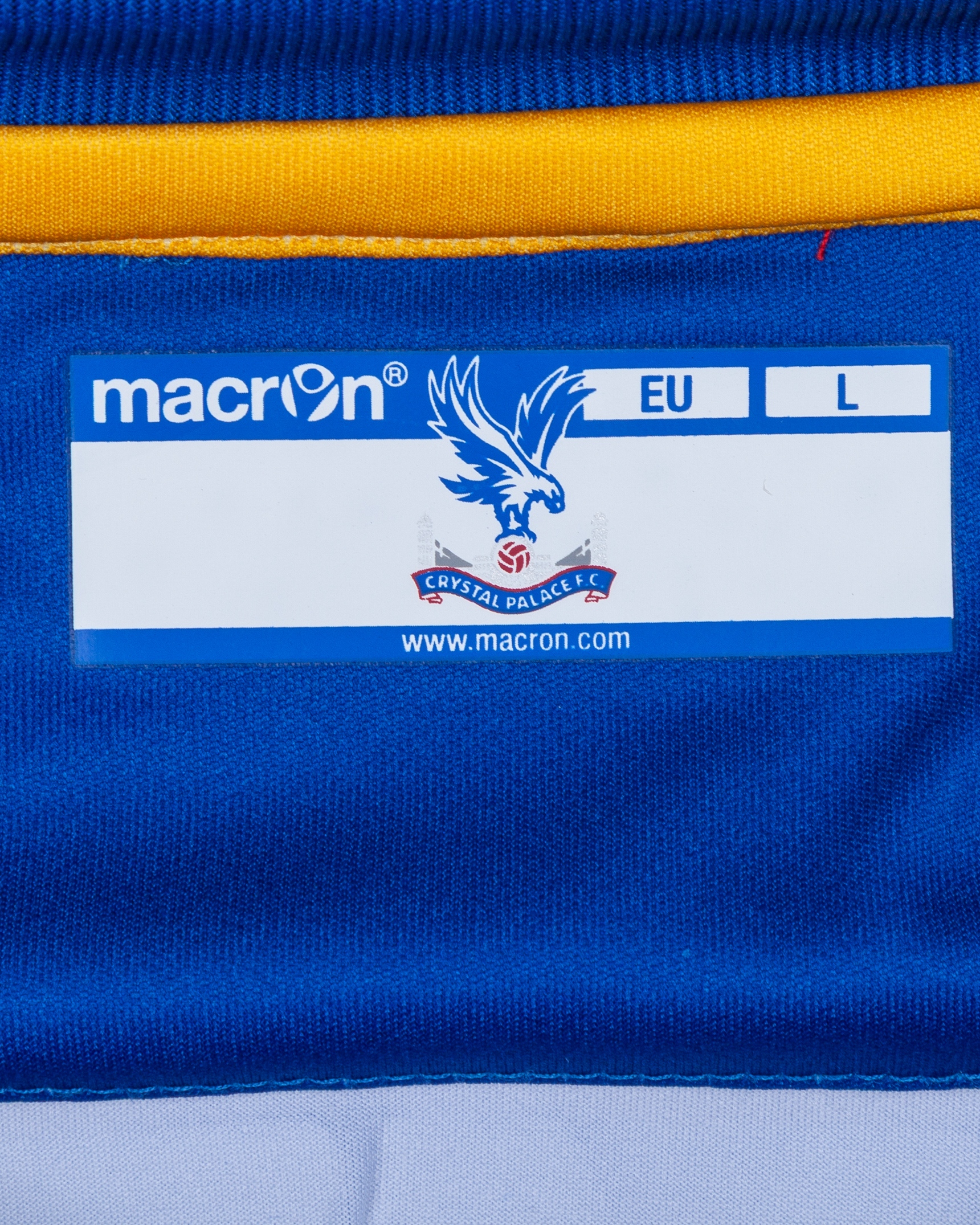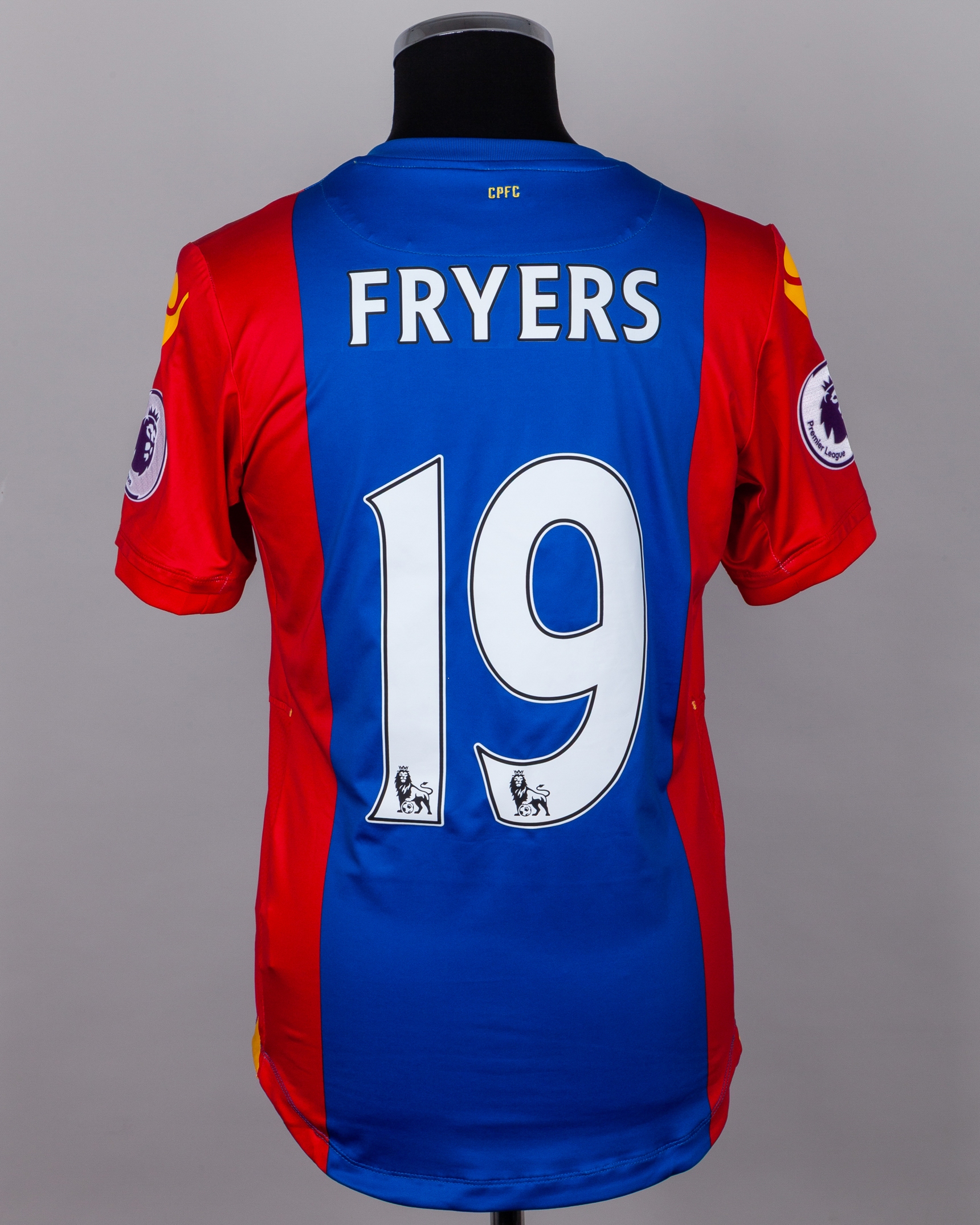 Zeki Fryers blue and red No.19 Crystal Palace match worn short-sleeved shirt, 2016-17, Macron, L, with crew-neck collar and embroidered badge inscribed 1905 CRYSTAL PALACE F.C., the reverse lettered FRYERS, the sleeves with Premier League flashes