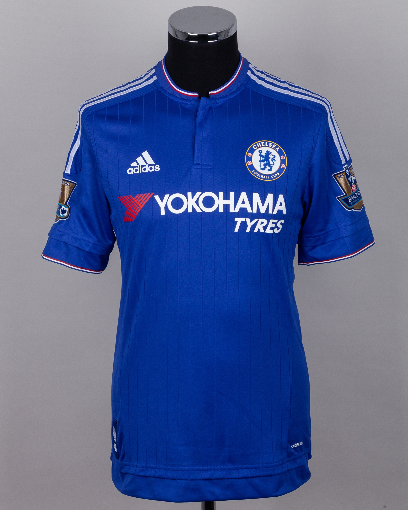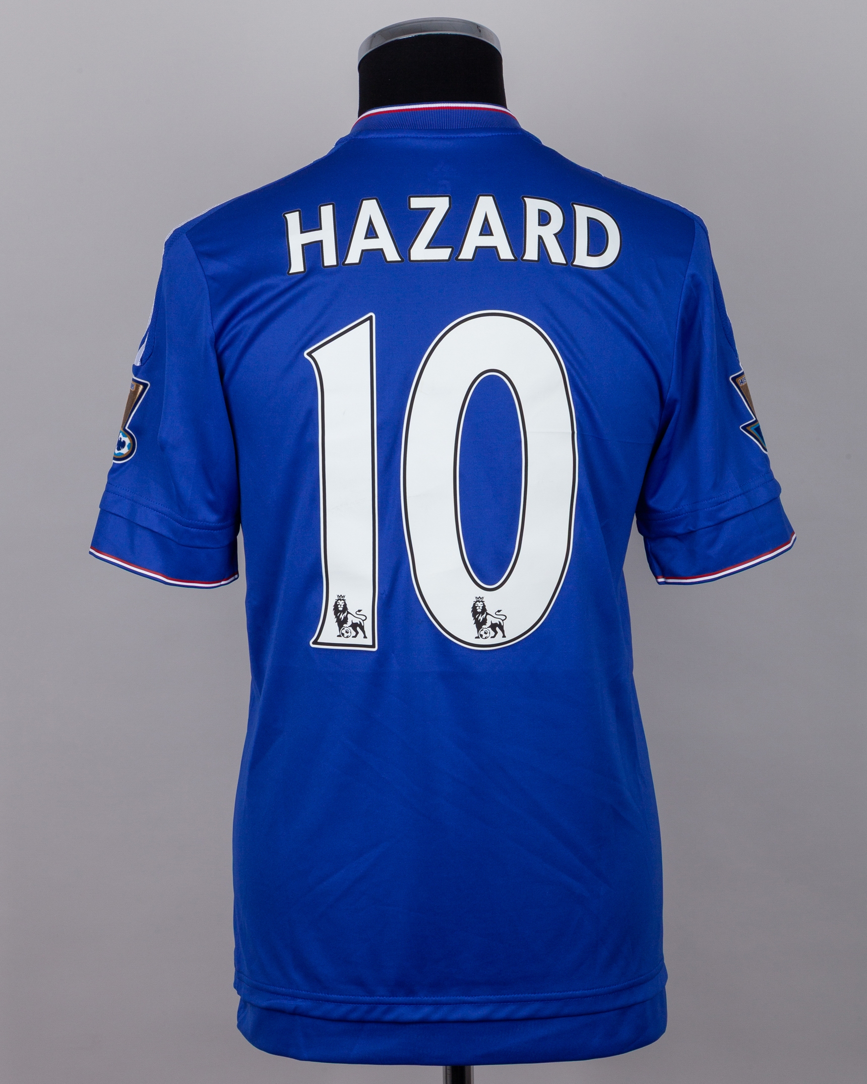 Eden Hazard blue No.10 Chelsea short-sleeved shirt, 2015-16, Adidas, 6, with button-up collar and printed badge, the reverse lettered HAZARD, the sleeves with 14/15 Champions Barclays Premier League flashes, with some pulls