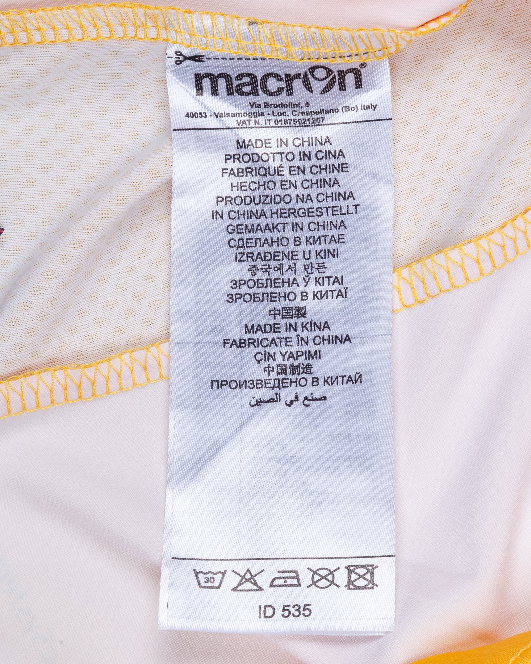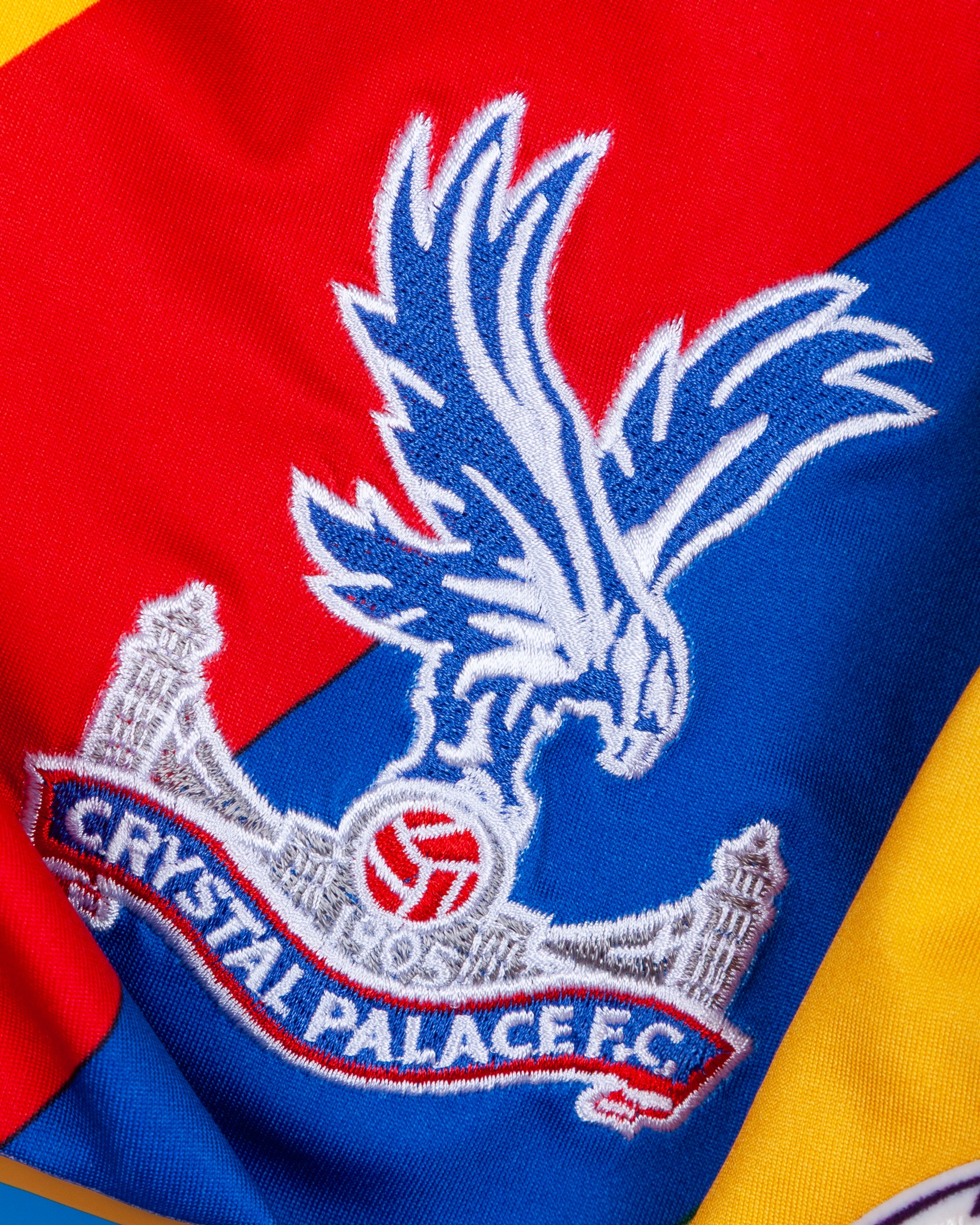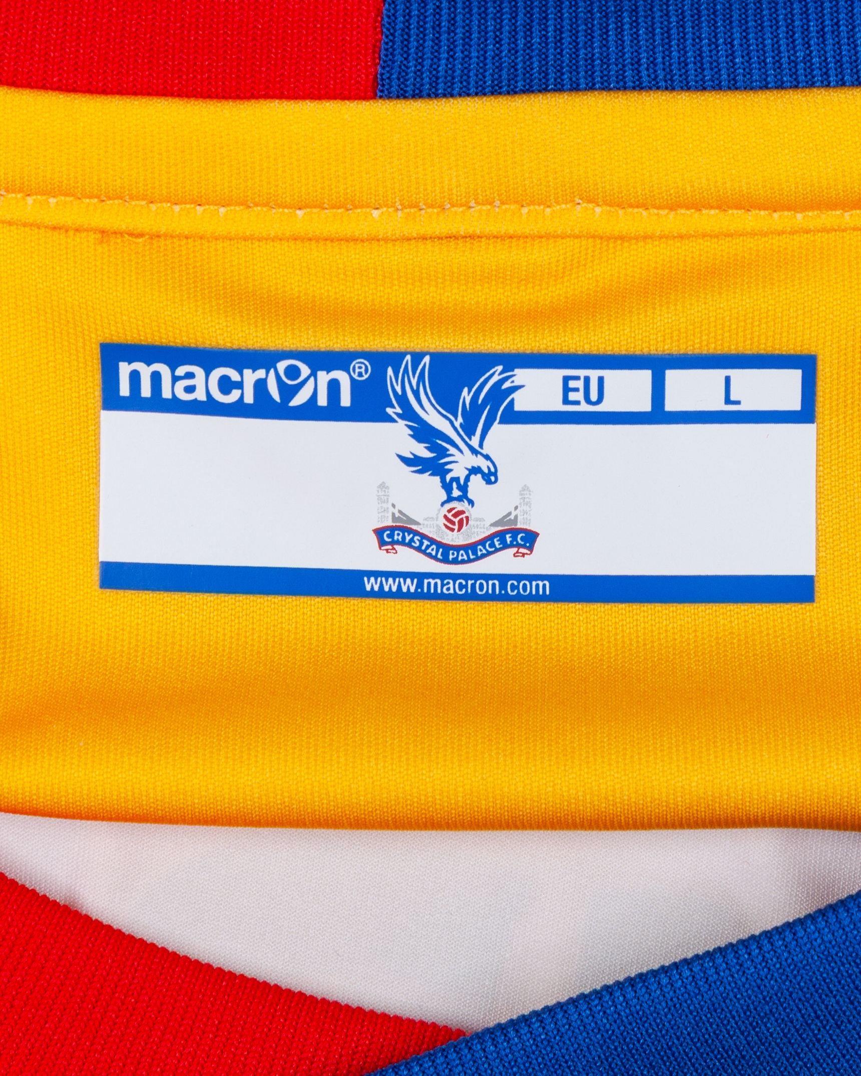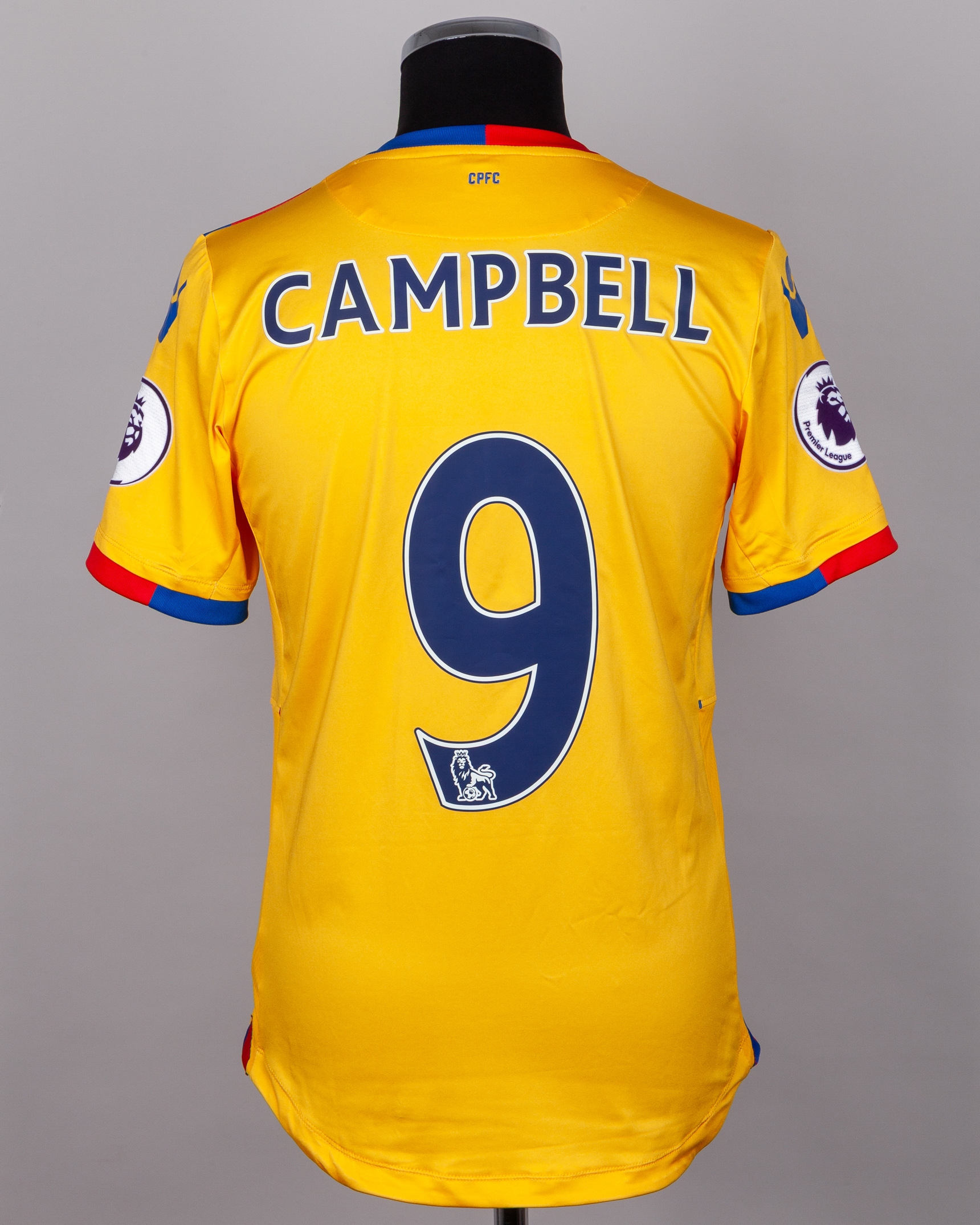 Fraizer Campbell yellow, red and blue No.9 Crystal Palace match worn short-sleeved shirt, 2016-17, Macron, L, with crew-neck collar and embroidered badge inscribed 1905 CRYSTAL PALACE F.C., the reverse lettered CAMPBELL, the sleeves with Premier League flashes