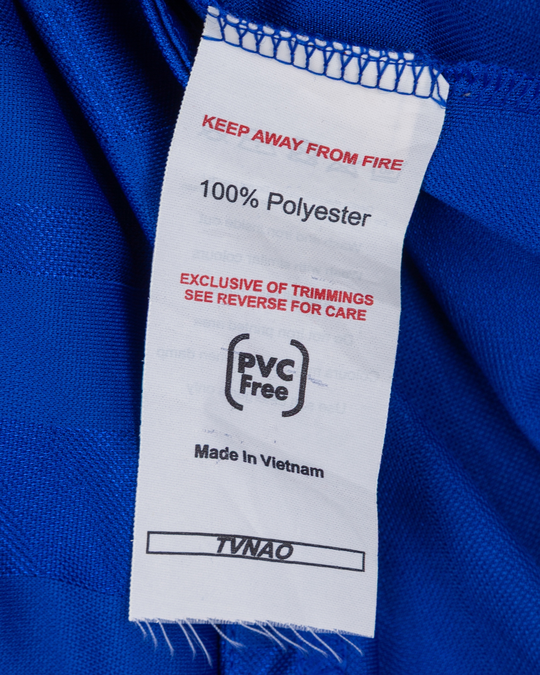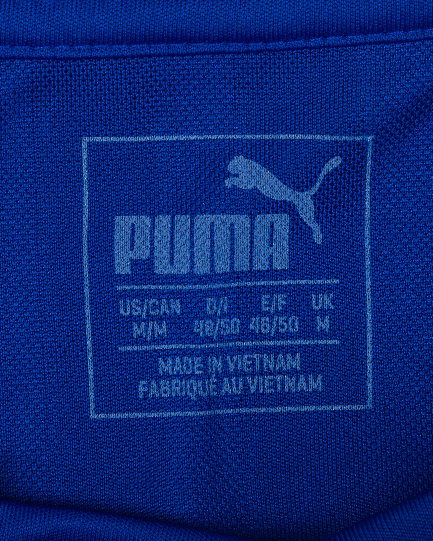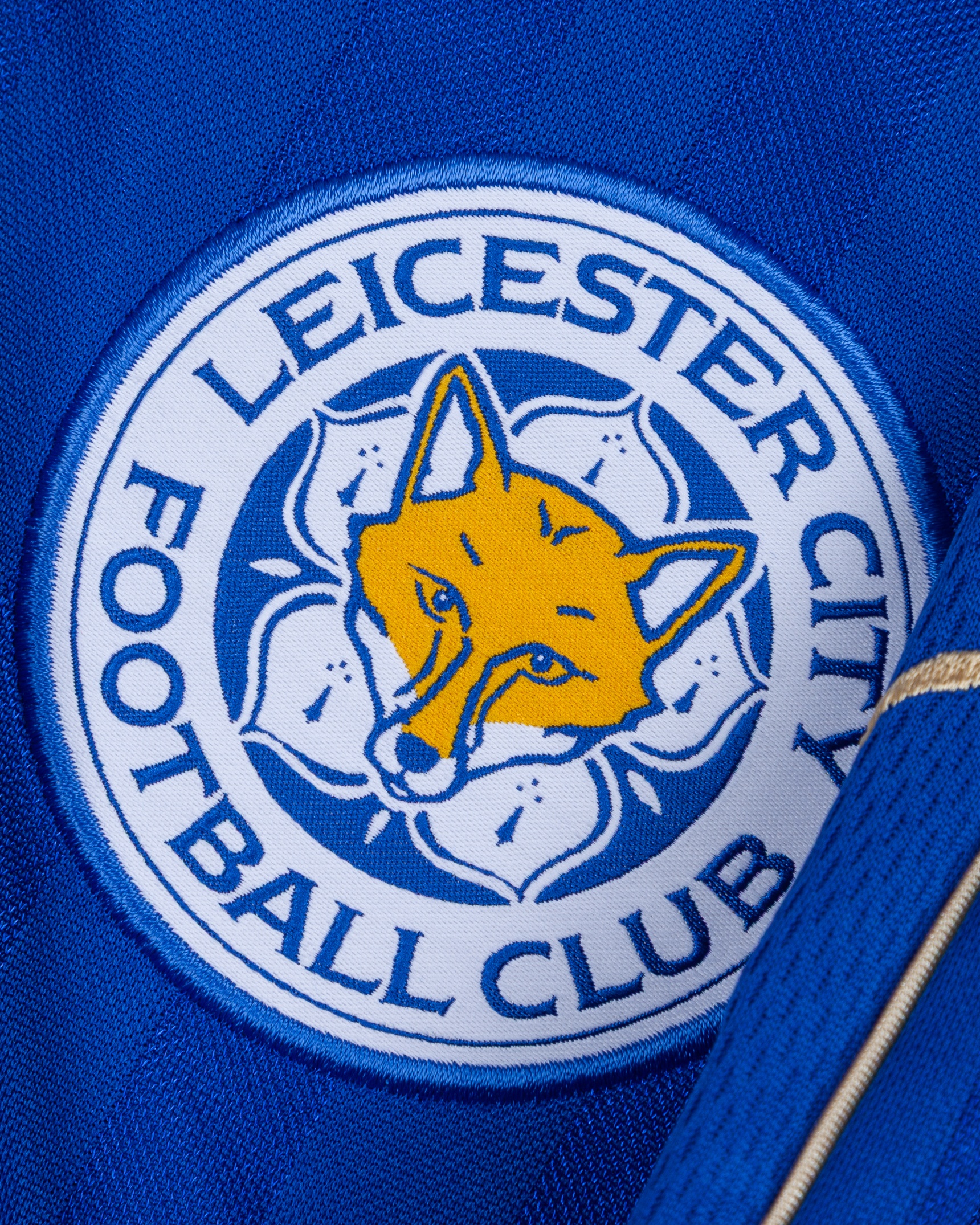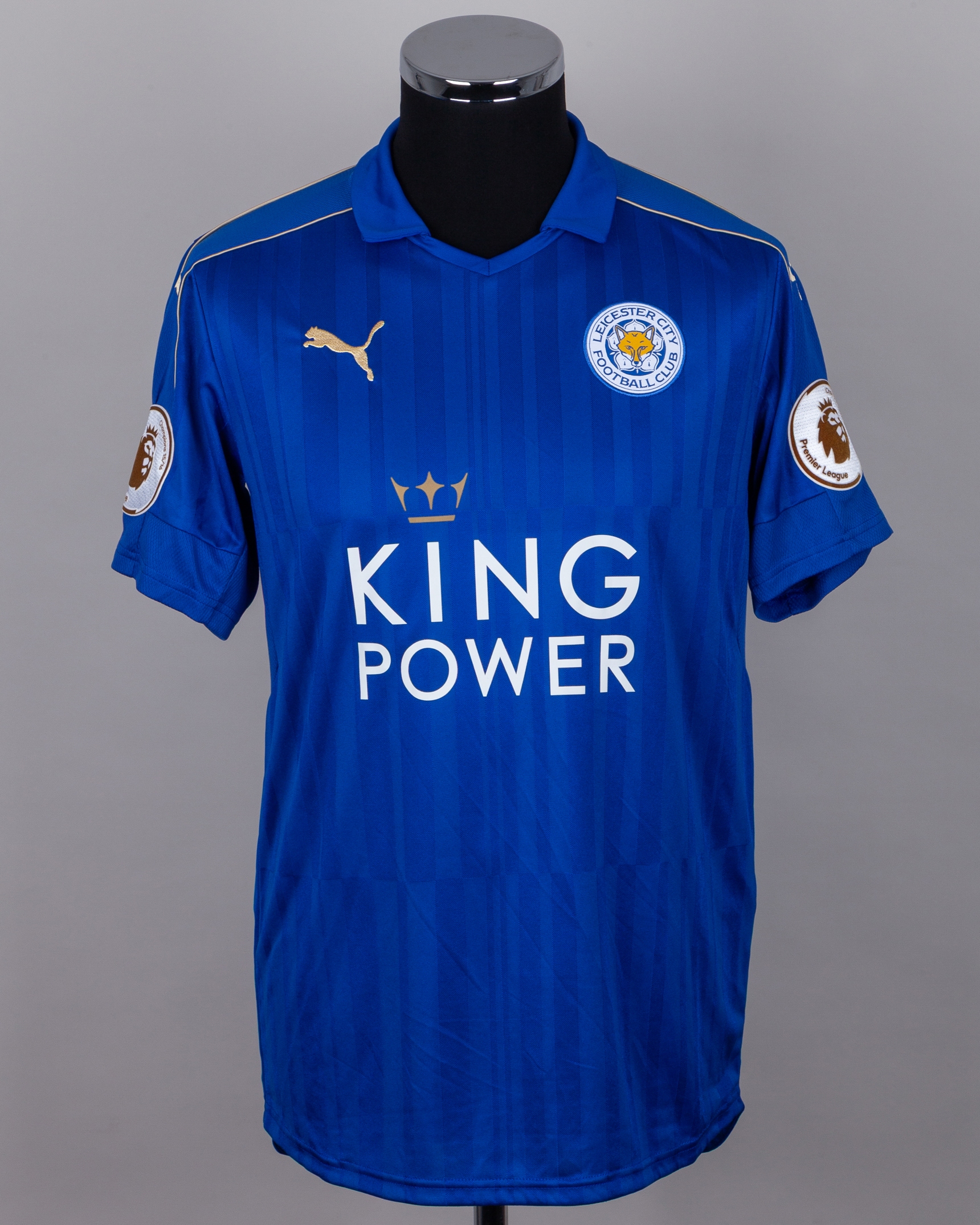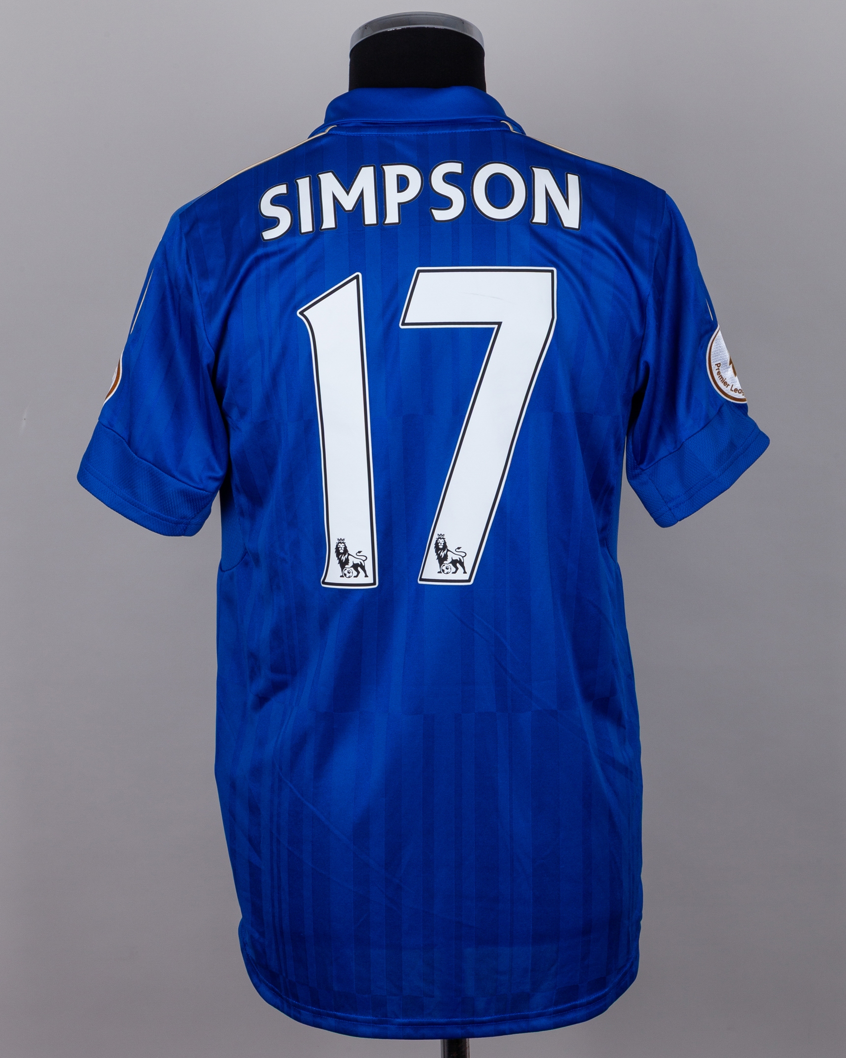 Danny Simpson blue No.17 Leicester City match worn short-sleeved shirt, 2016-17, Puma, M, with v-neck collar and embroidered cloth badge LEICESTER CITY FOOTBALL CLUB, the reverse lettered SIMPSON, the sleeves with Champions 15/16 Premier League flashes