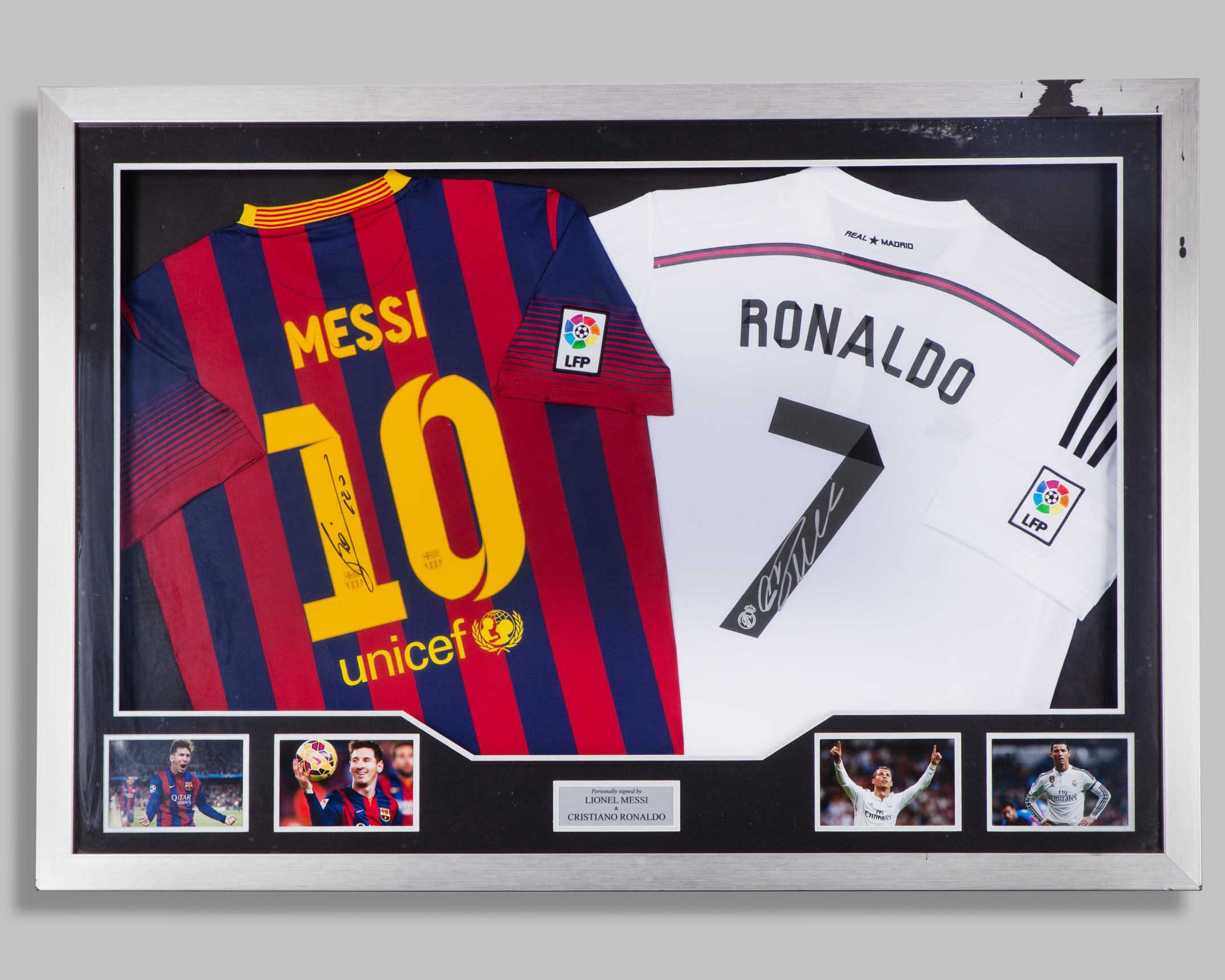 A dual framed Lionel Messi and Cristiano Ronaldo autographed shirt
