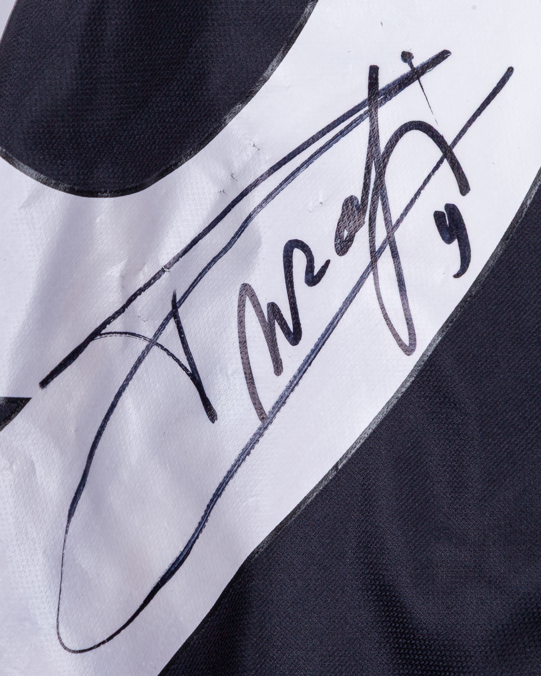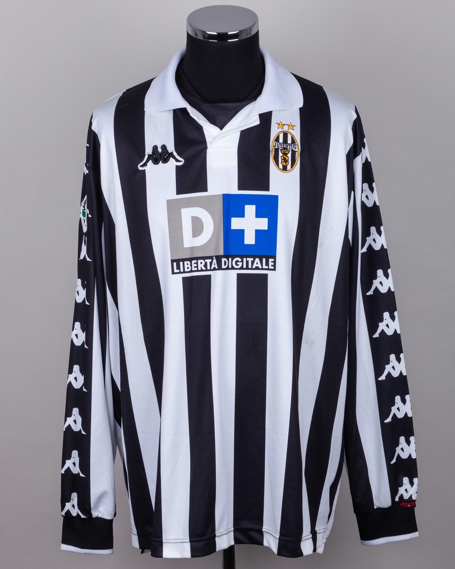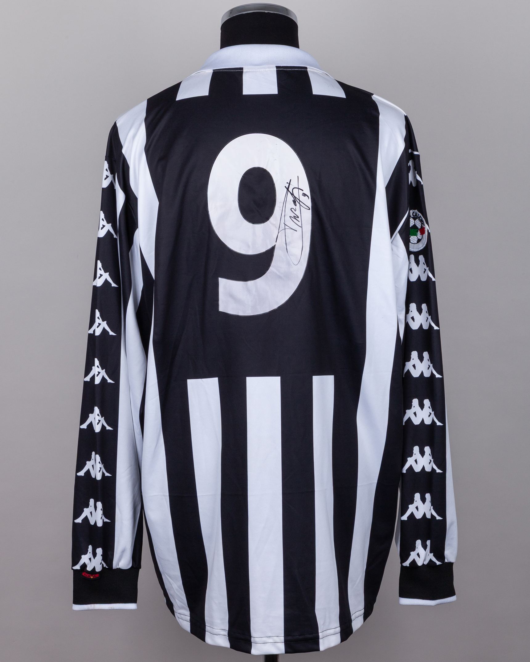 Filippo Inzaghi black and white No.9 Juventus long-sleeved shirt, Kappa, XL, with v-neck collar and embroidered badge inscribed JUVENTUS, the numbered autographed by Inzaghi, staining