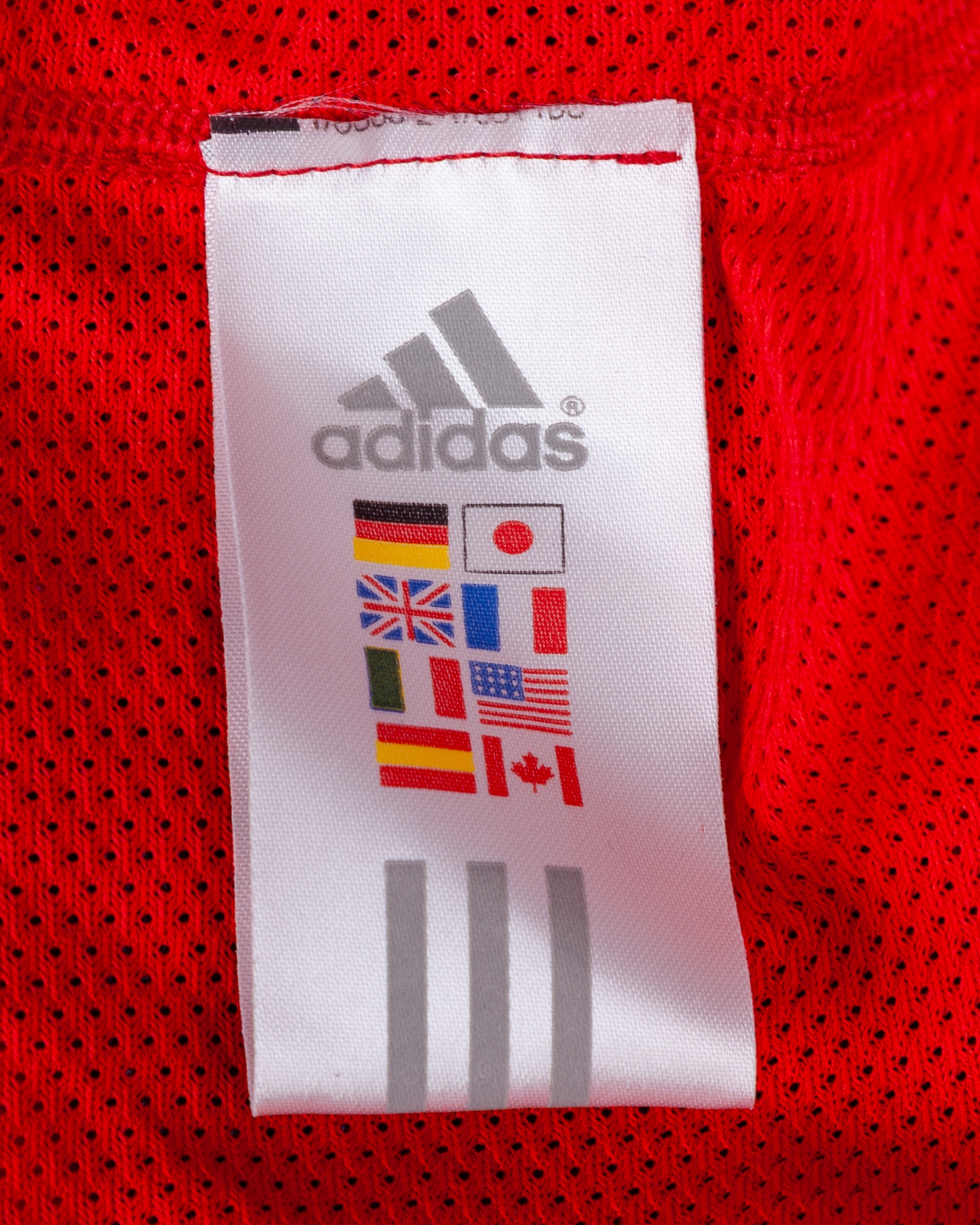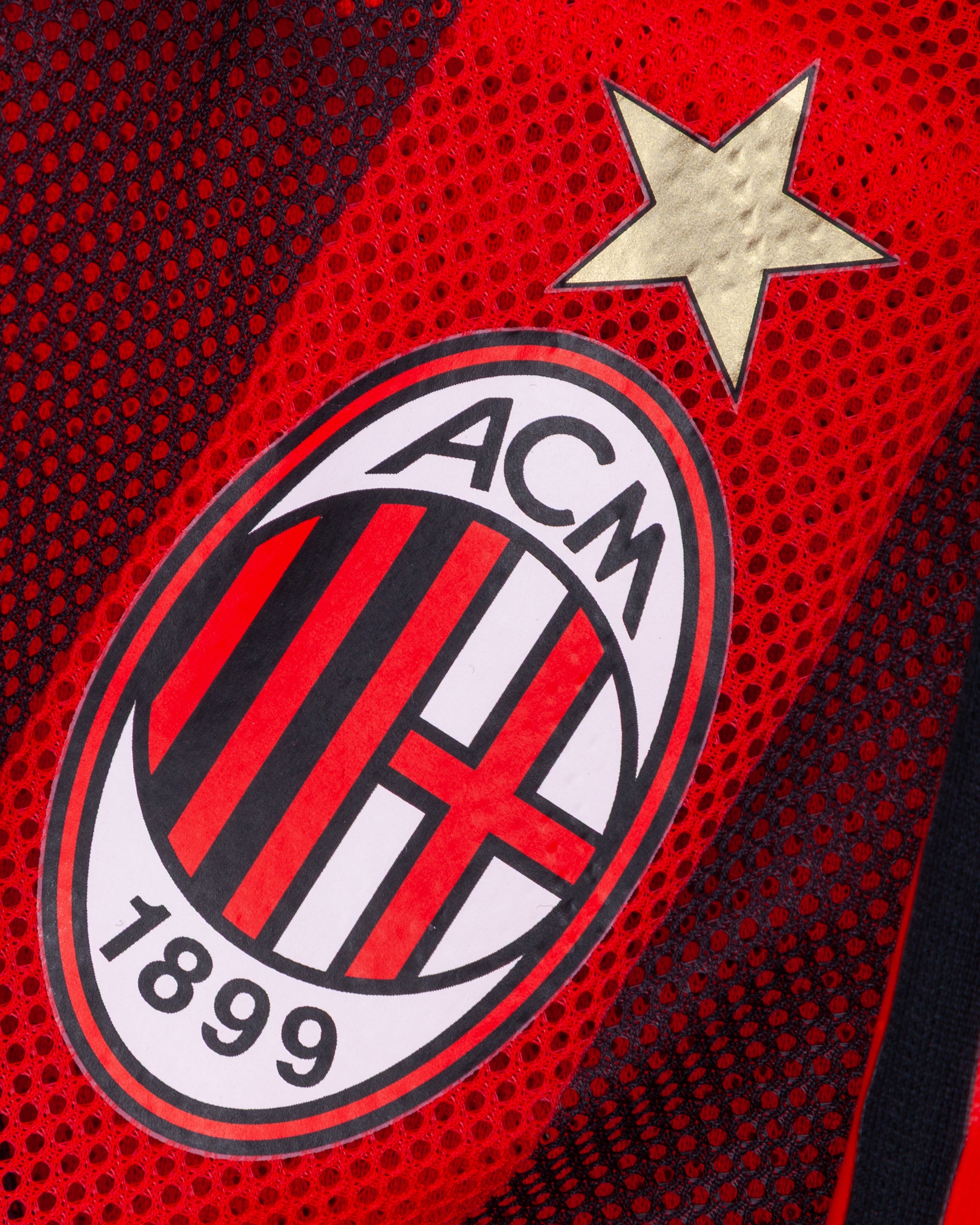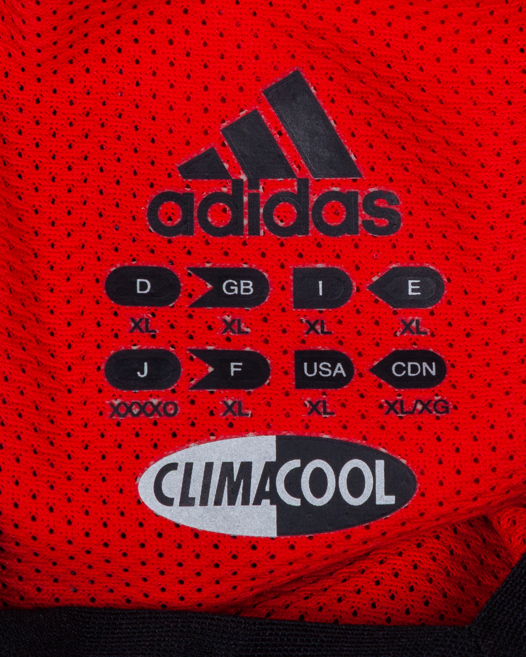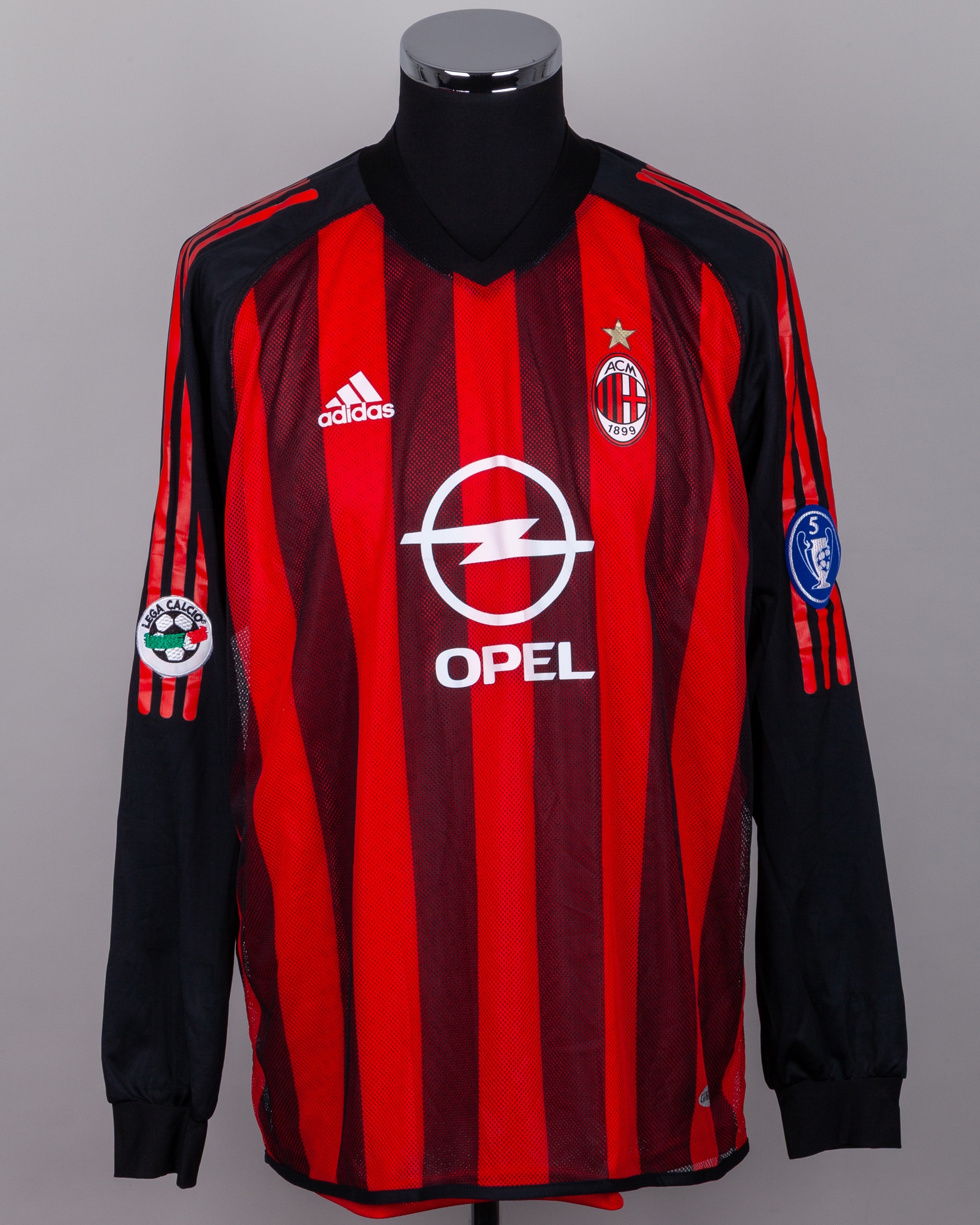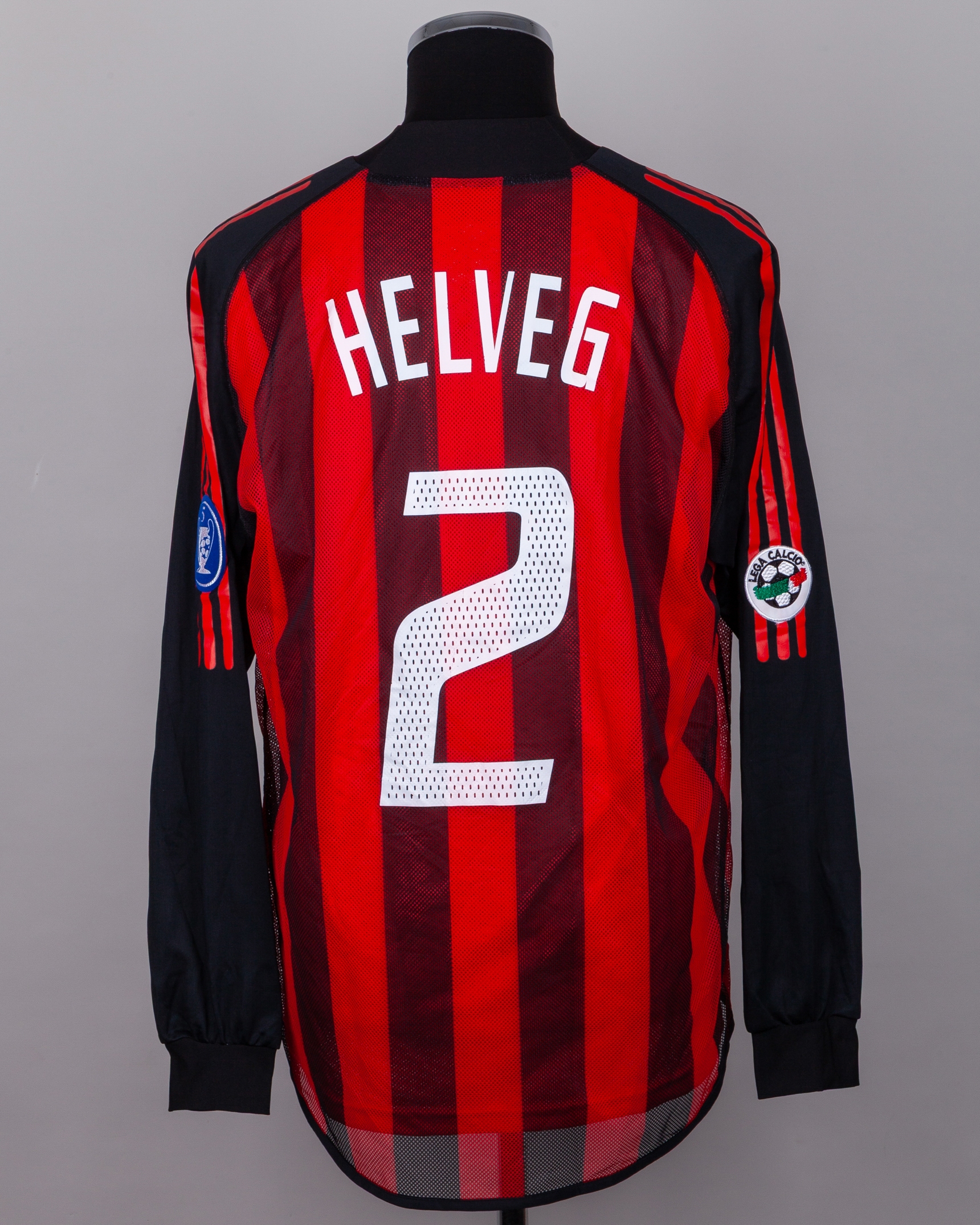 Thomas Helveg red and black No.2 AC Milan long-sleeved shirt, 2002-03, Adidas, XL, with v-neck collar and printed badge, the reverse lettered HELVEG, the right sleeve with Lega Calcio flash and the left sleeve with 5 Champions League flash