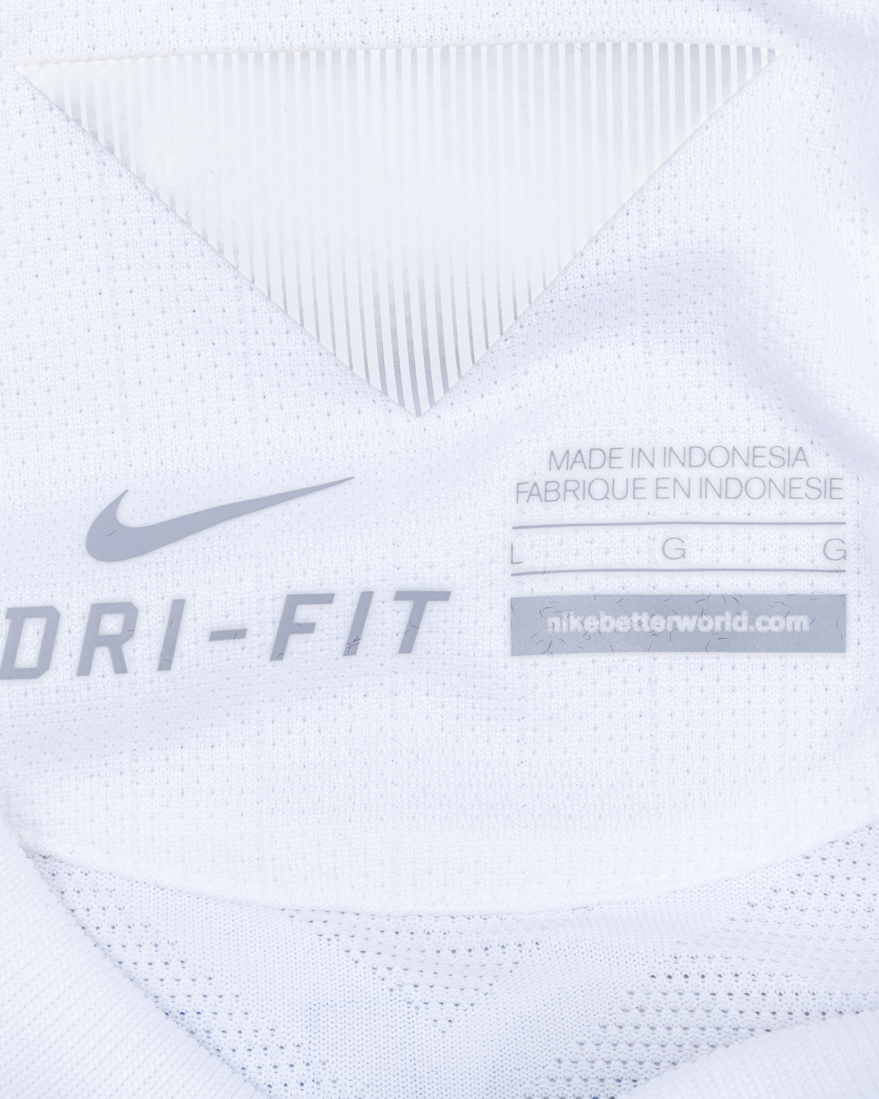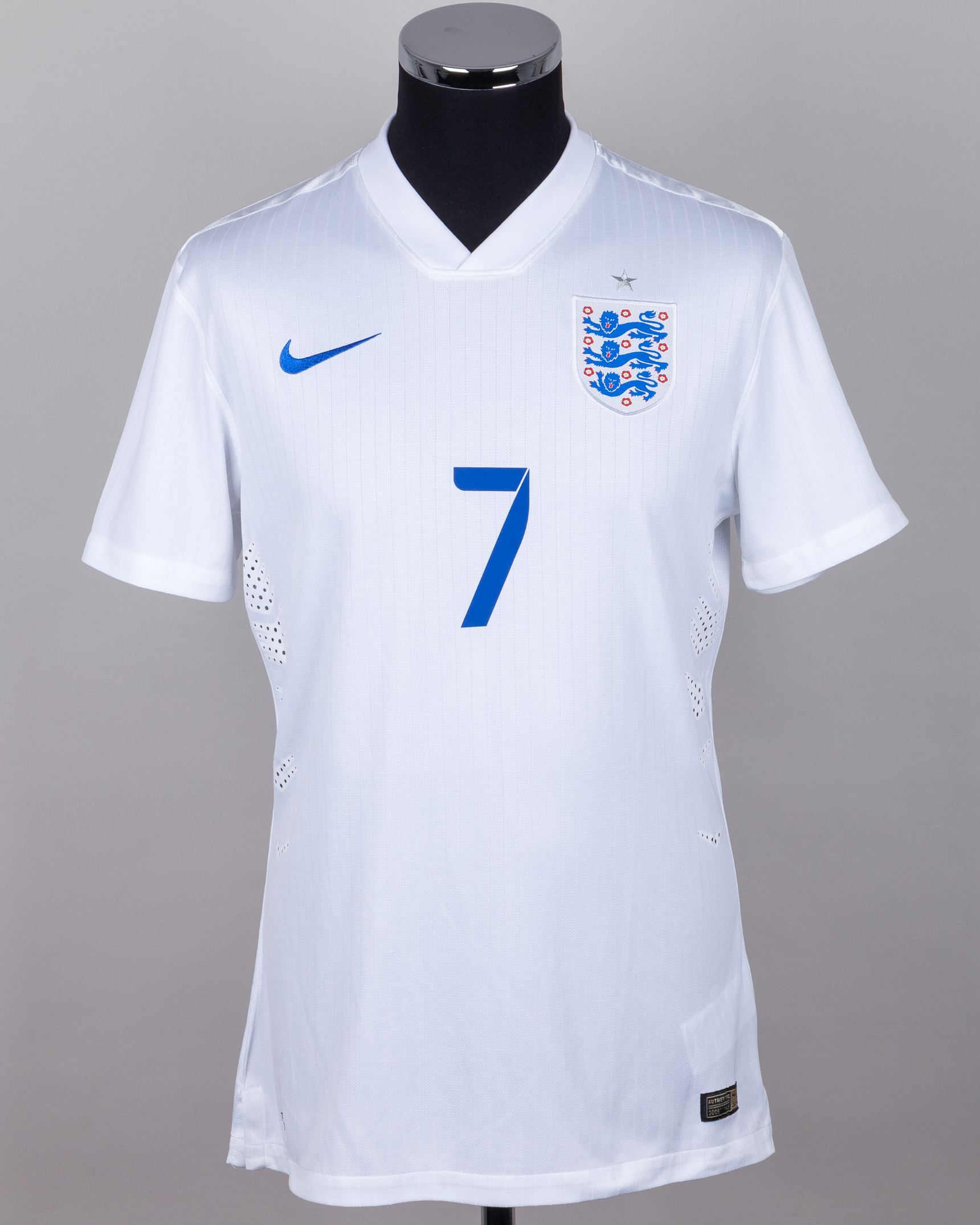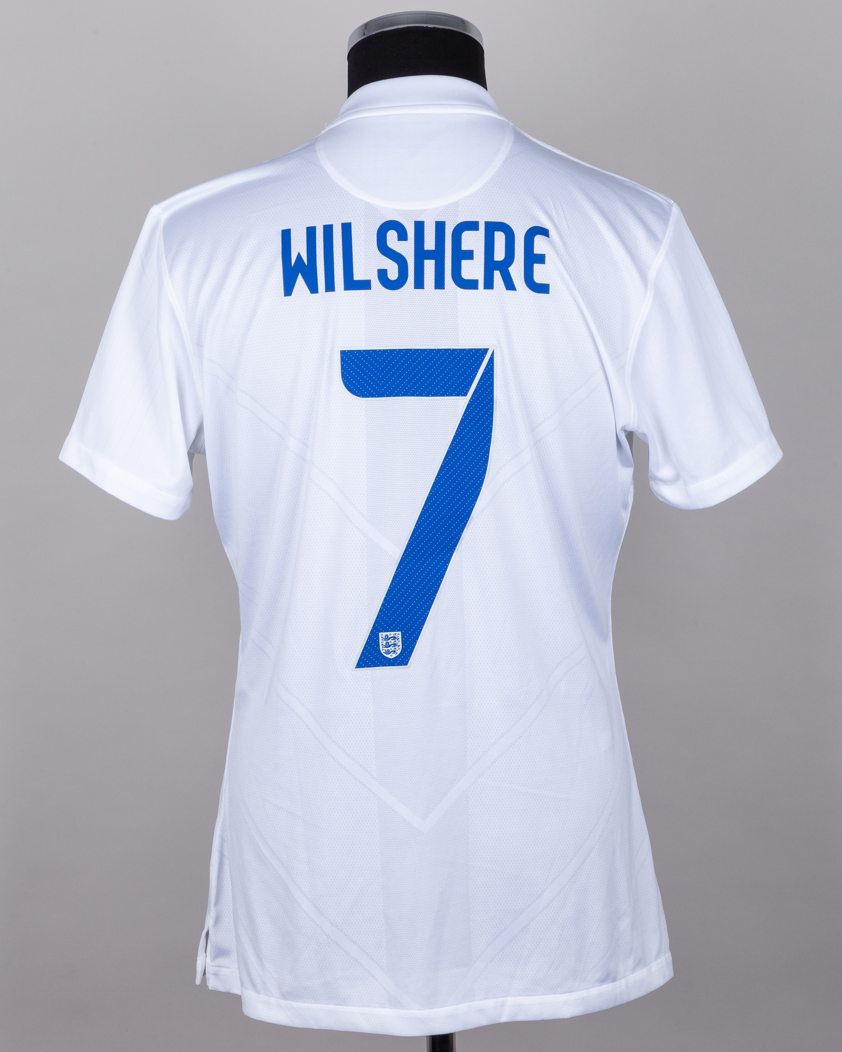 Jack Wilshere white No.7 England short-sleeved shirt, 2014-15, Nike, L, with v-neck collar and embroidered cloth badge, the reverse lettered WILSHERE