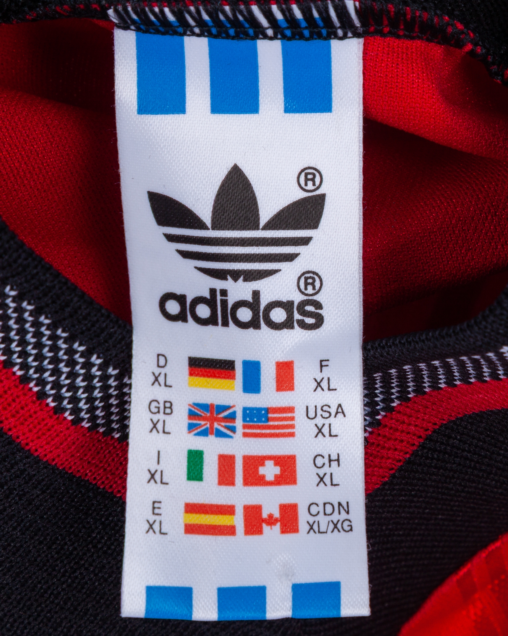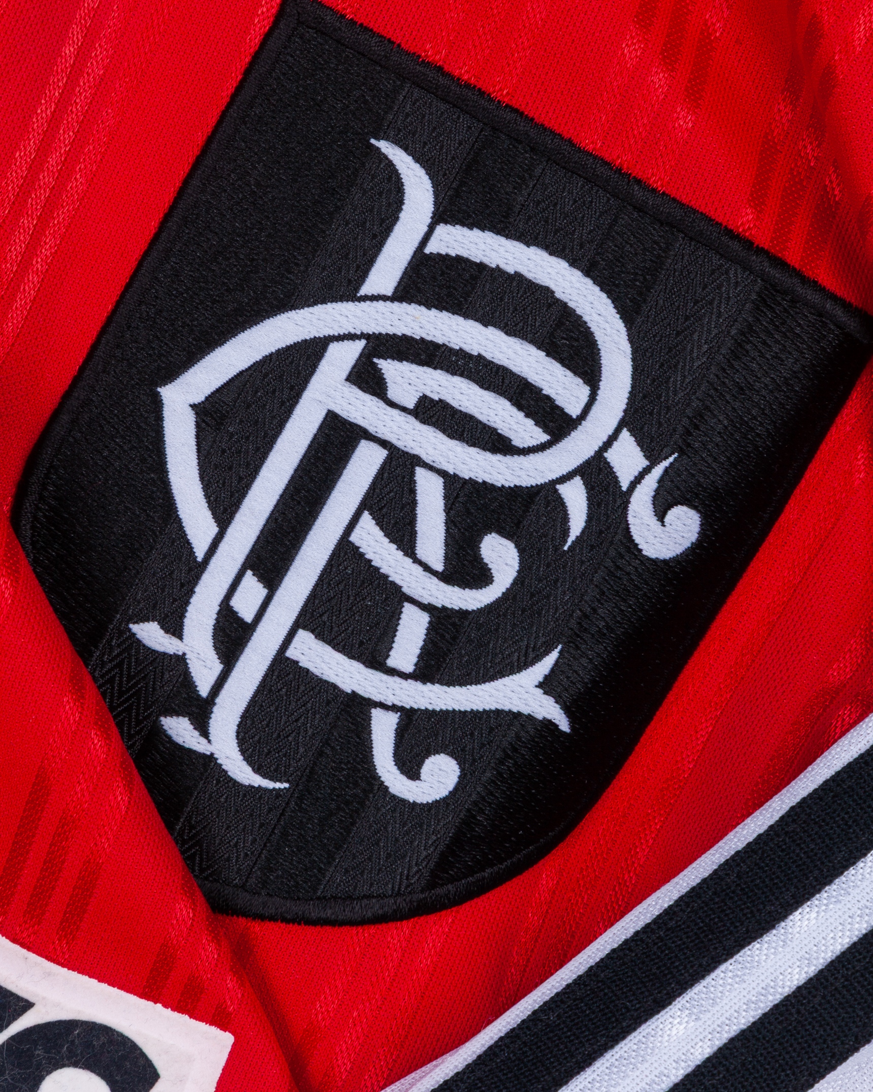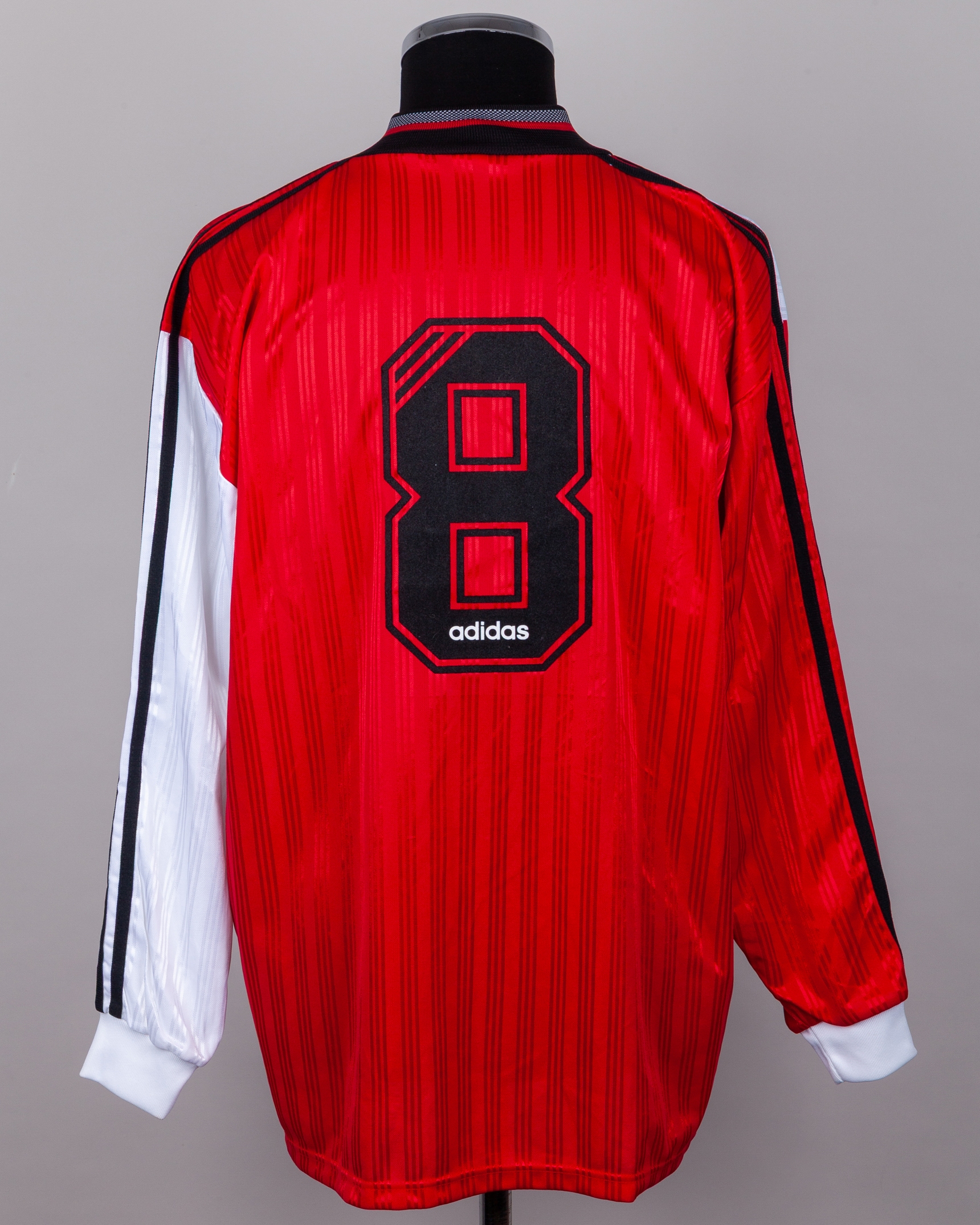 Paul Gascoigne red and white No.8 Rangers long-sleeved shirt, 1995-96, Adidas, XL, with v-neck collar and embroidered cloth badge inscribed RFC