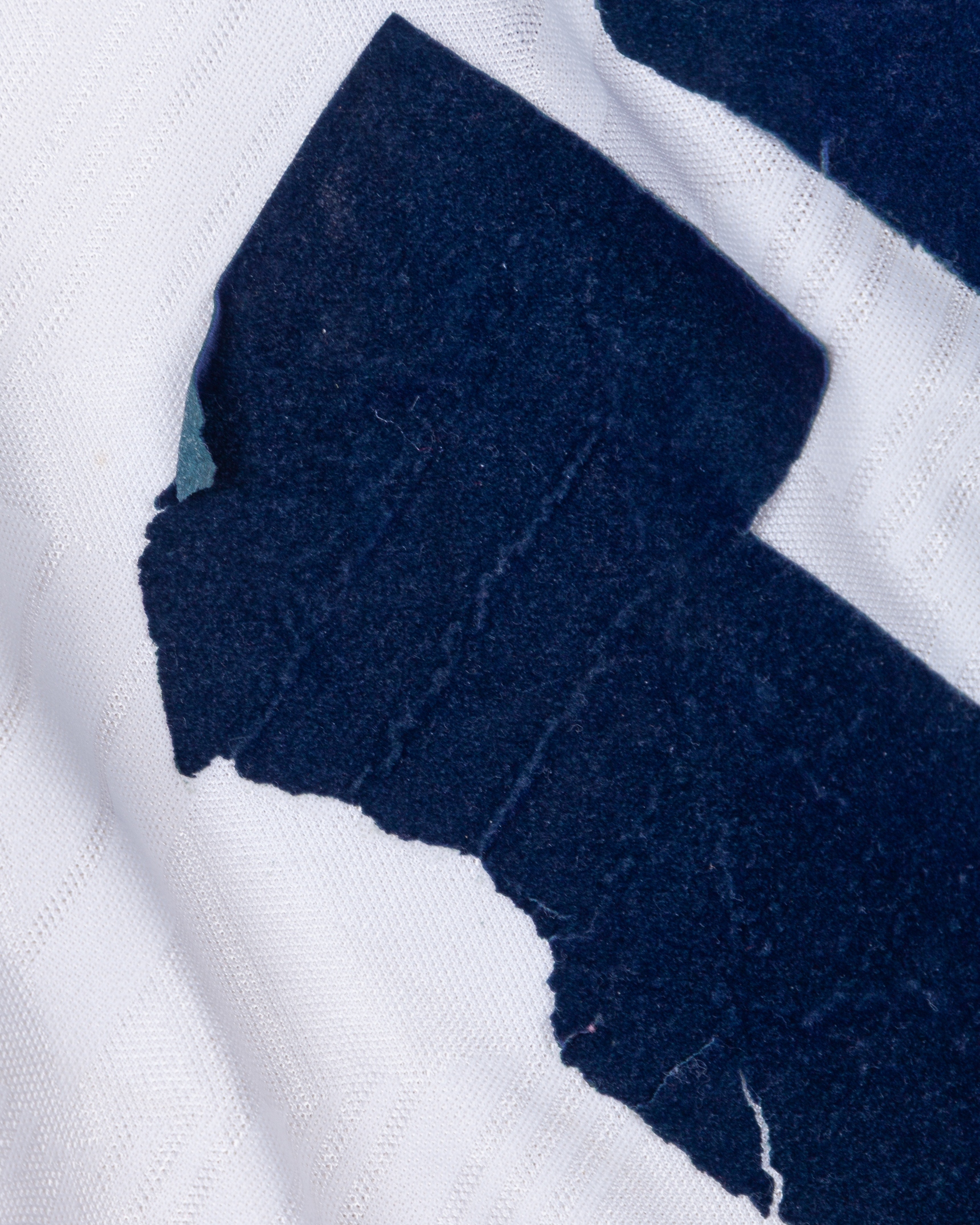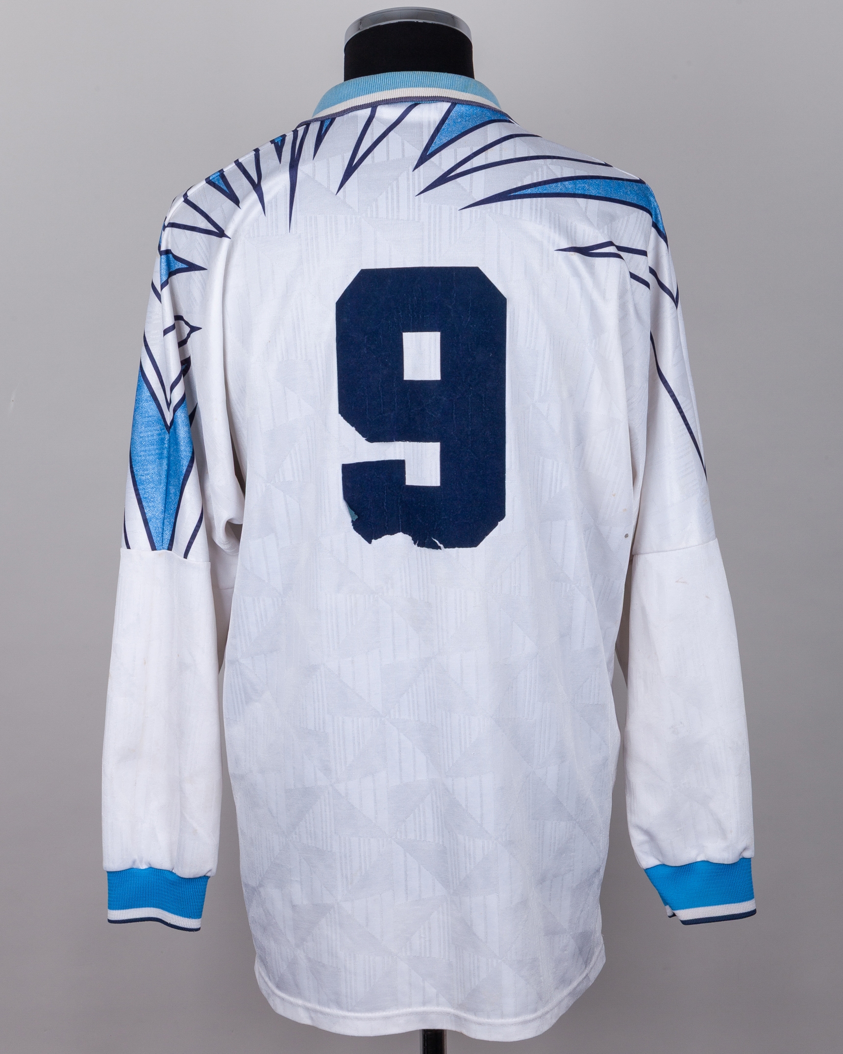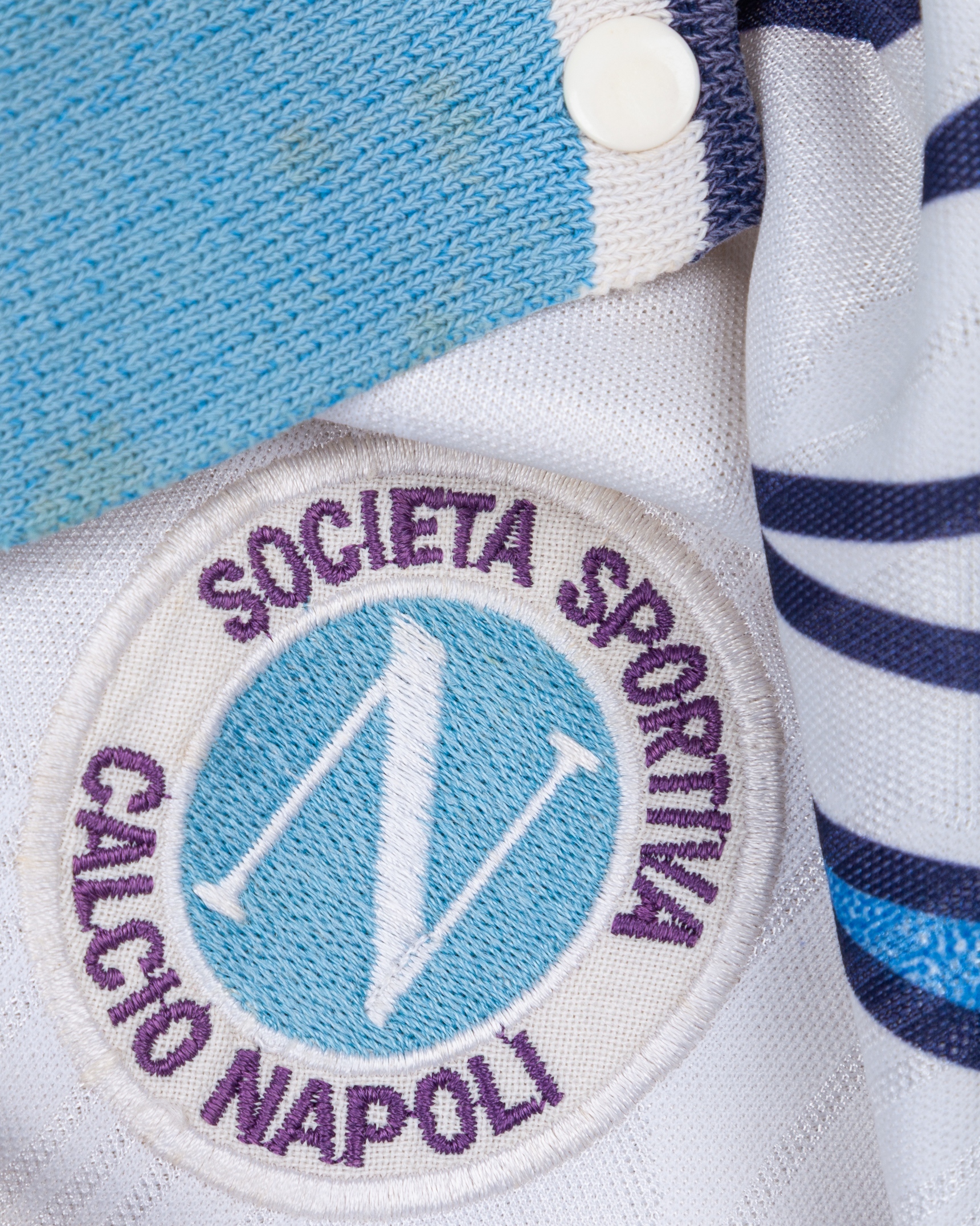 White and blue No.9 Napoli long-sleeved shirt, Umbro, L, with button-up collar and embroidered badge inscribed SOCIETA SPORTIVA CALCIO NAPOLI, with staining, discolouration, pulls, hole, number rubbed and loose