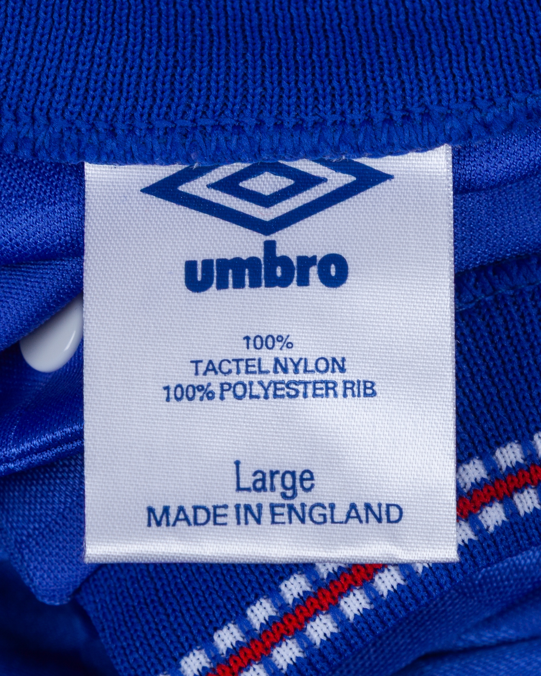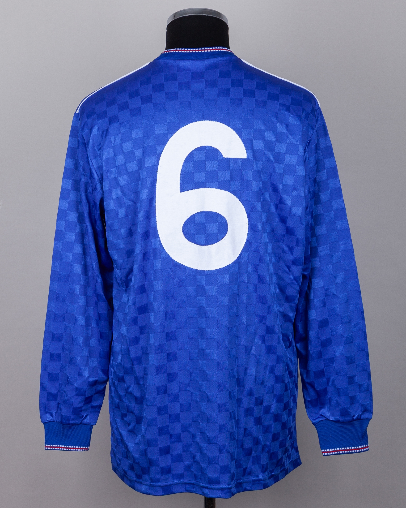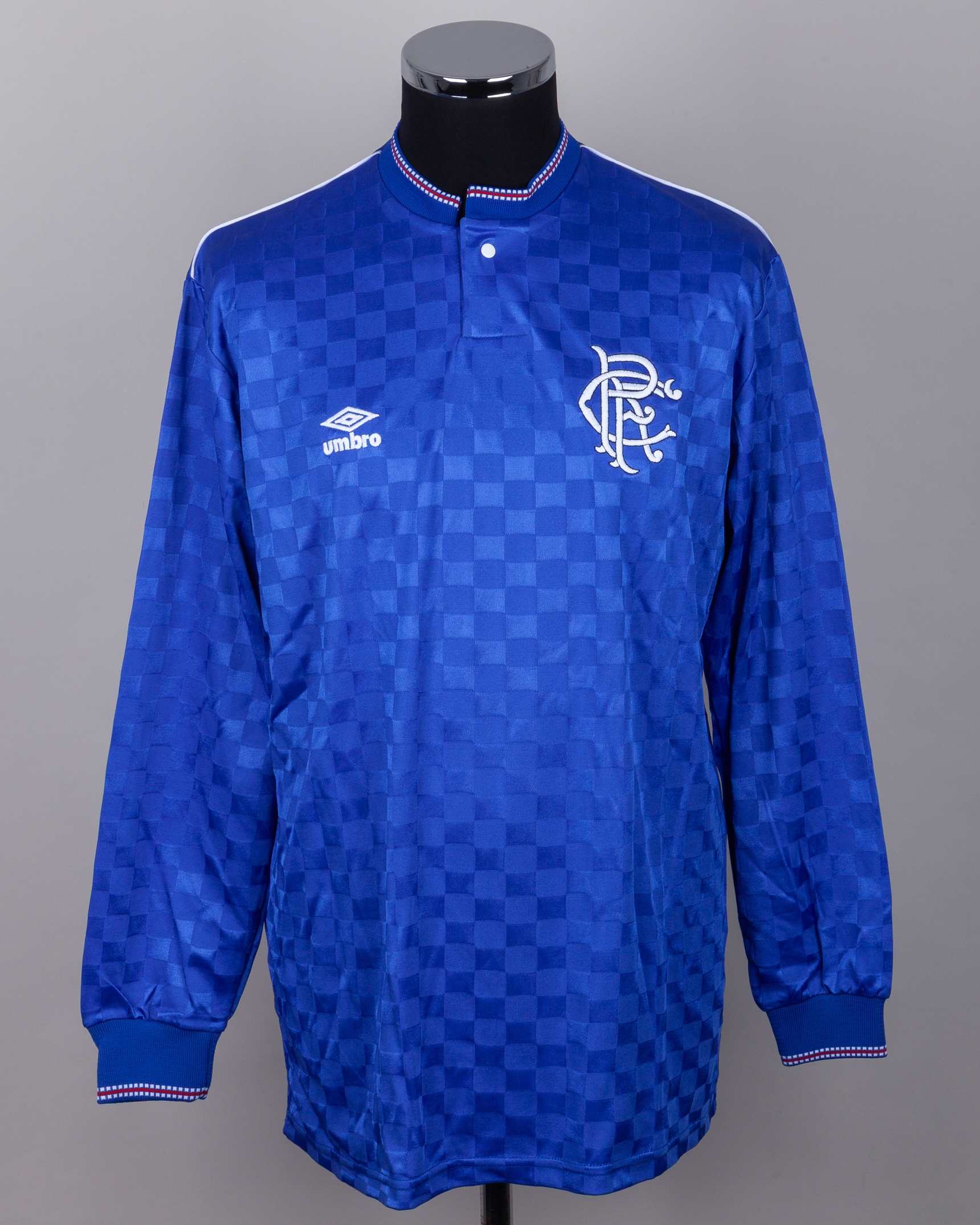 Blue No.6 Glasgow Rangers long-sleeved shirt, Umbro, Large, with button-up collar and embroidered badge