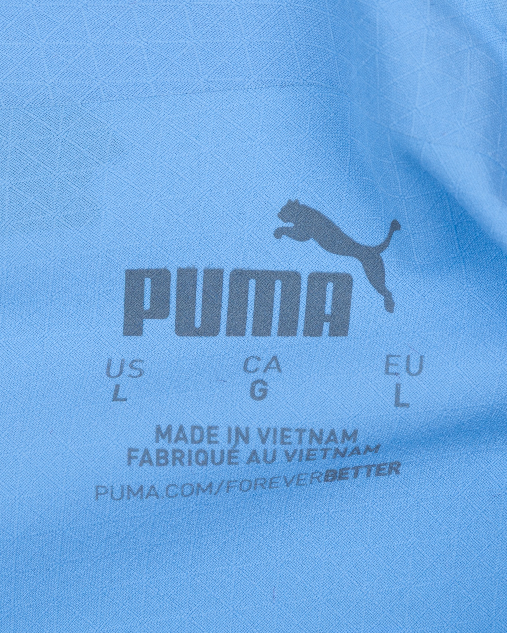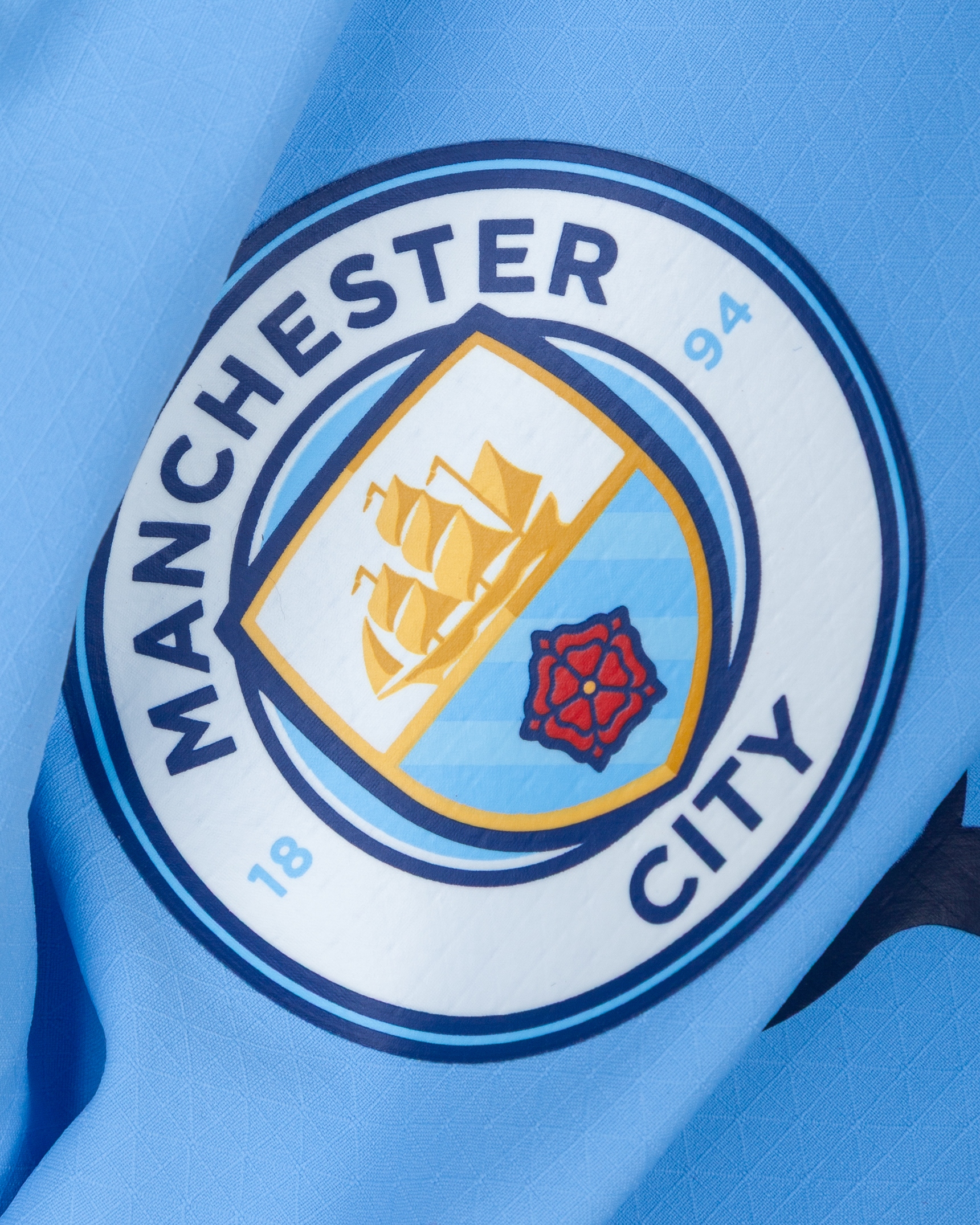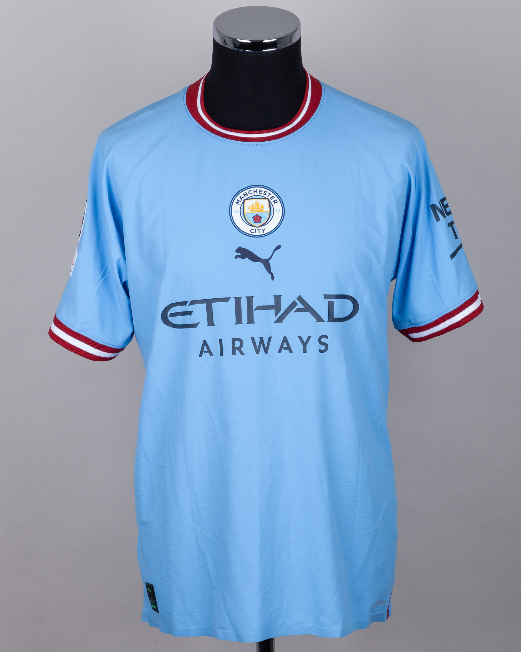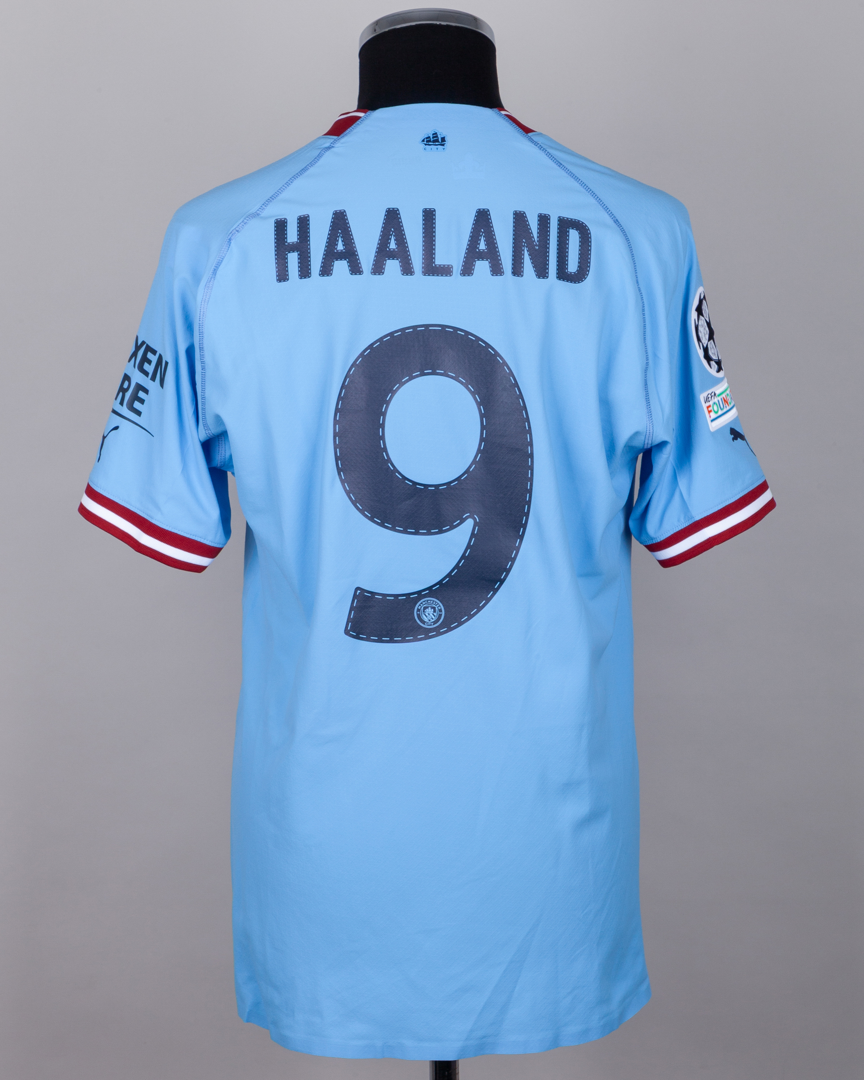 Erling Haaland sky-blue No.9 Manchester City short-sleeved shirt, 2022-23, Puma, L, with crew-neck collar and printed badge, the reverse lettered HAALAND, the right sleeve with Champions League and UEFA Foundation flashes