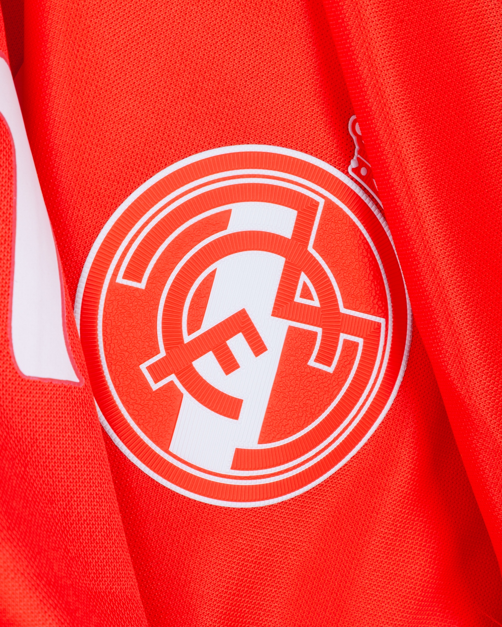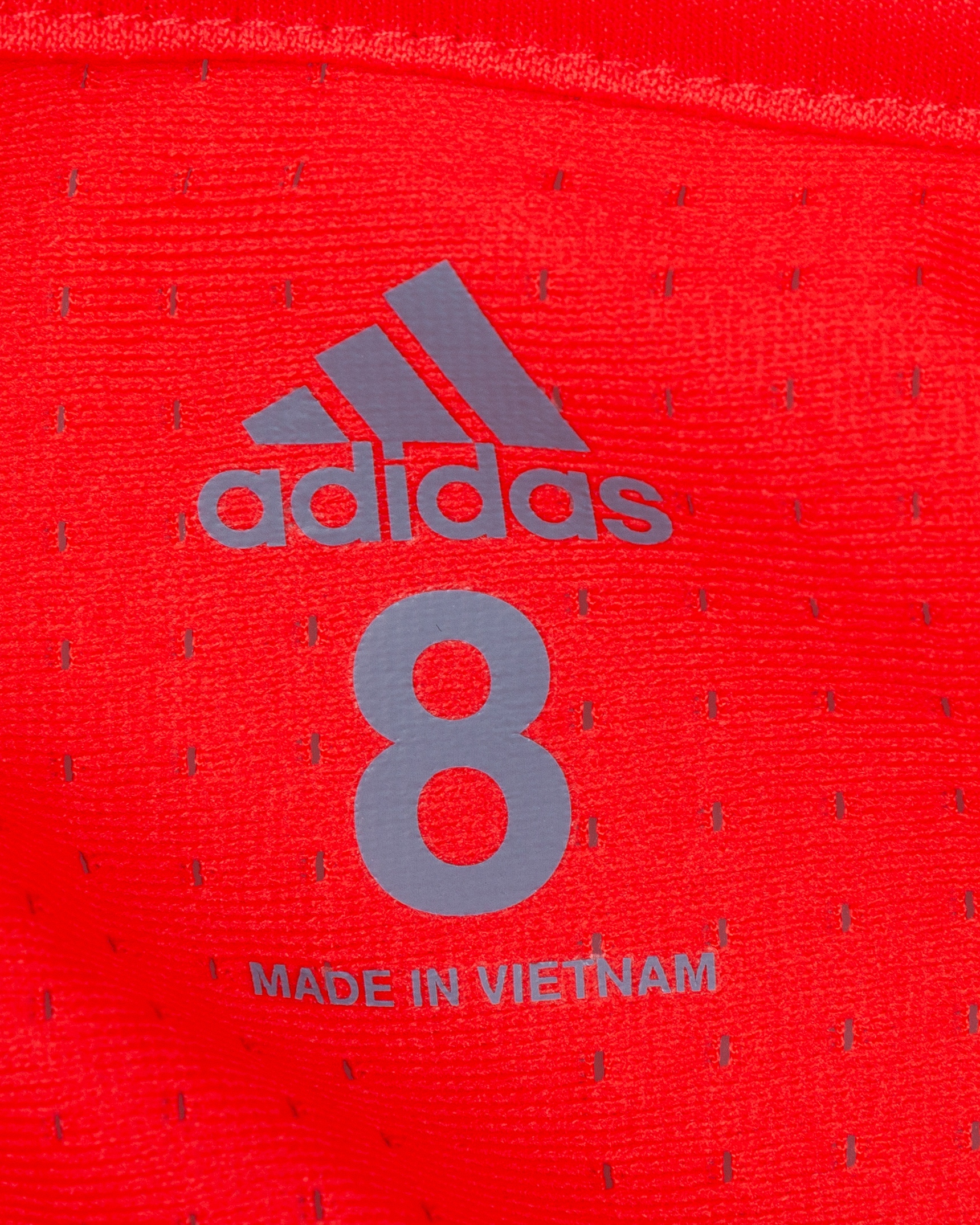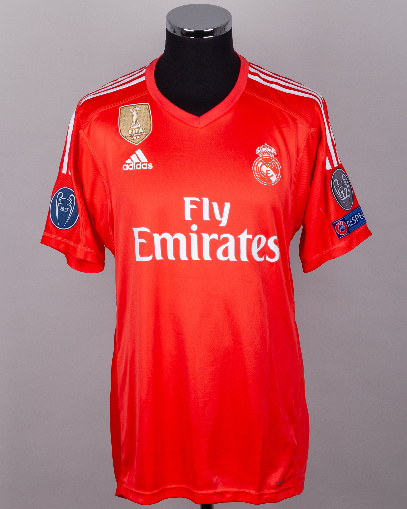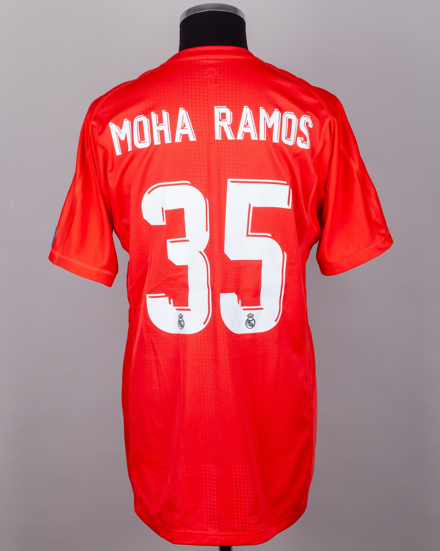 Moha Ramos orange No.35 Real Madrid goalkeeper shirt, 2017-18, Adidas, 8, with v-neck collar and printed badge, with FIFA World Champions 2016 flash, the reverse lettered MOHA RAMOS, the right sleeve with 2017 Champions League flash and the left sleeve with 12 Champions League flash and respect flash