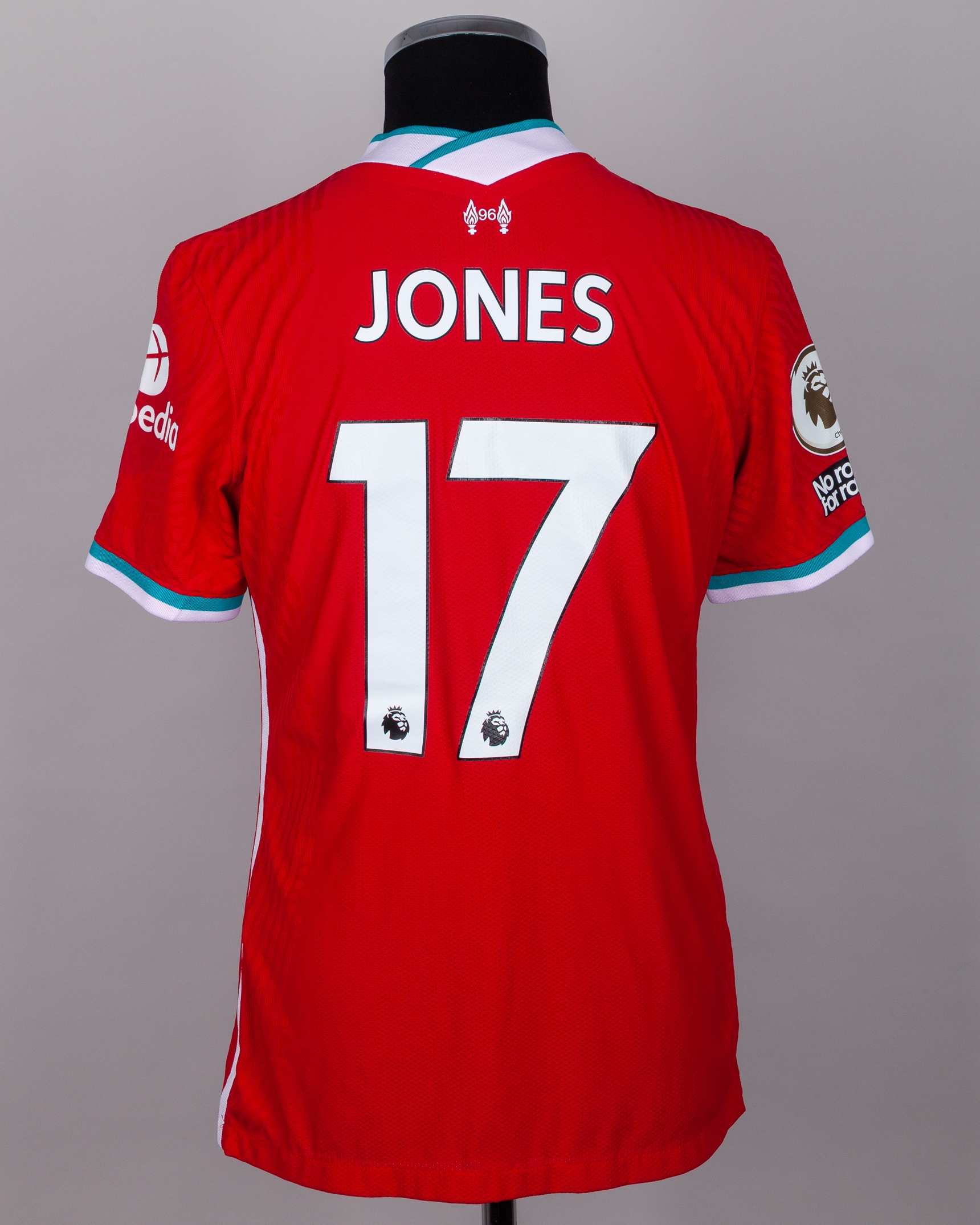 Curtis Jones red and white No.17 Liverpool v. Tottenham short-sleeved shirt, 2020-21
