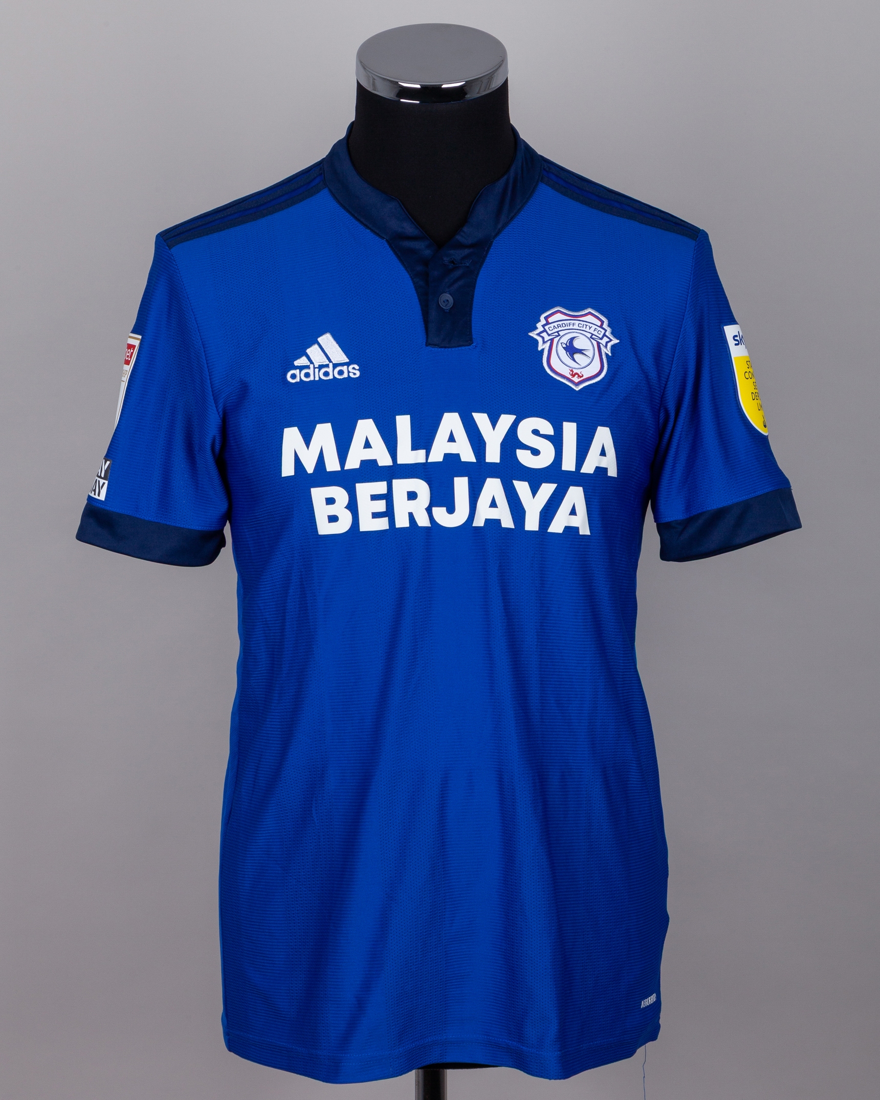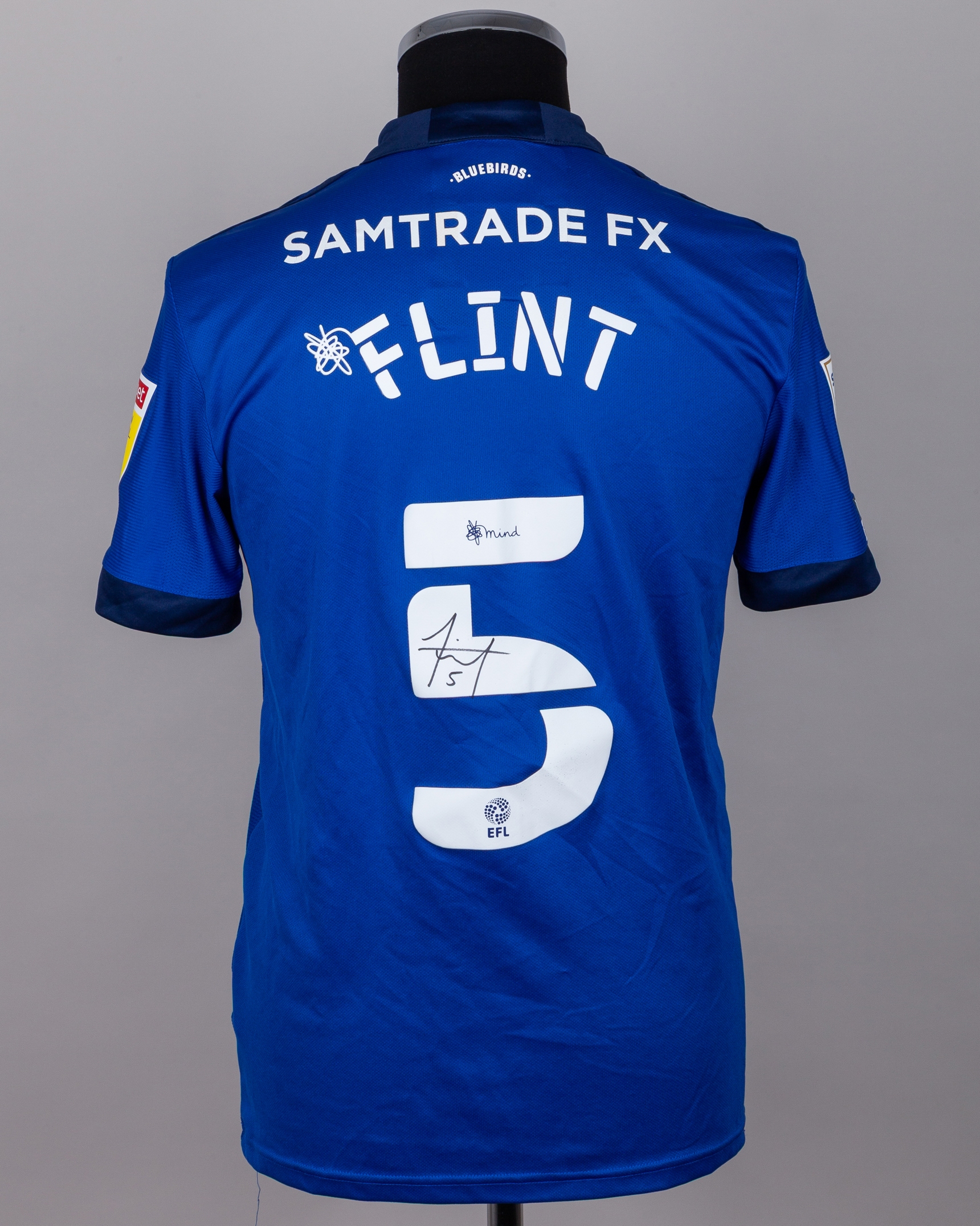 Aden Flint blue No.5 Cardiff City v. Millwall match worn short-sleeved shirt, 2021, Adidas, M, with button-up collar and embroidered cloth badge inscribed CARDIFF CITY FA, the reverse lettered FLINT, the number autographed by Flint, the sleeves with SKY Bet EFL Championship flashes