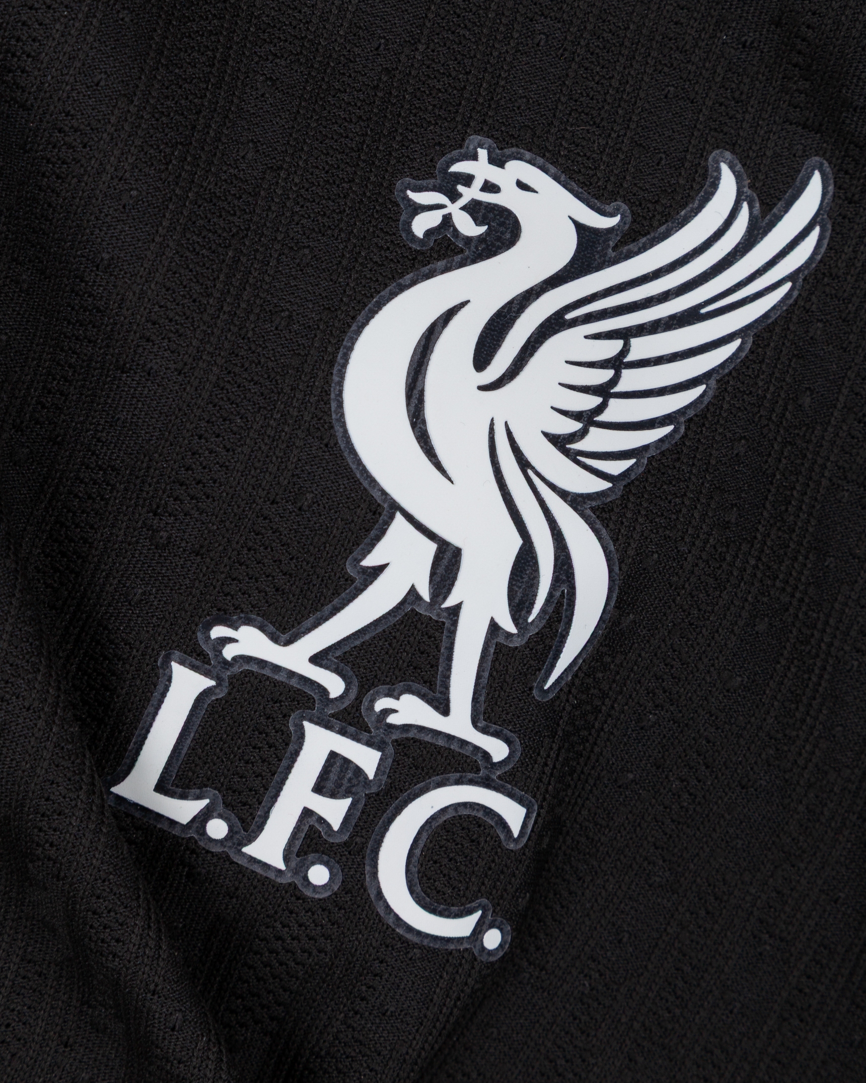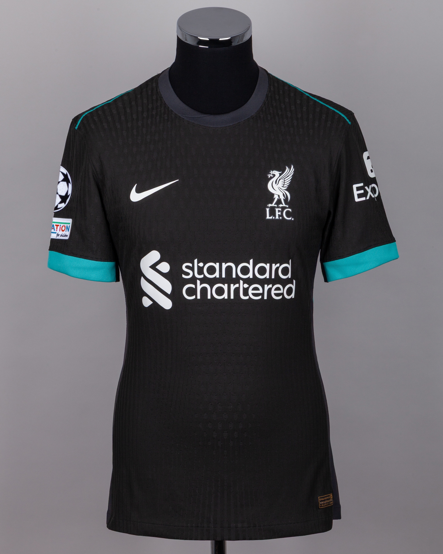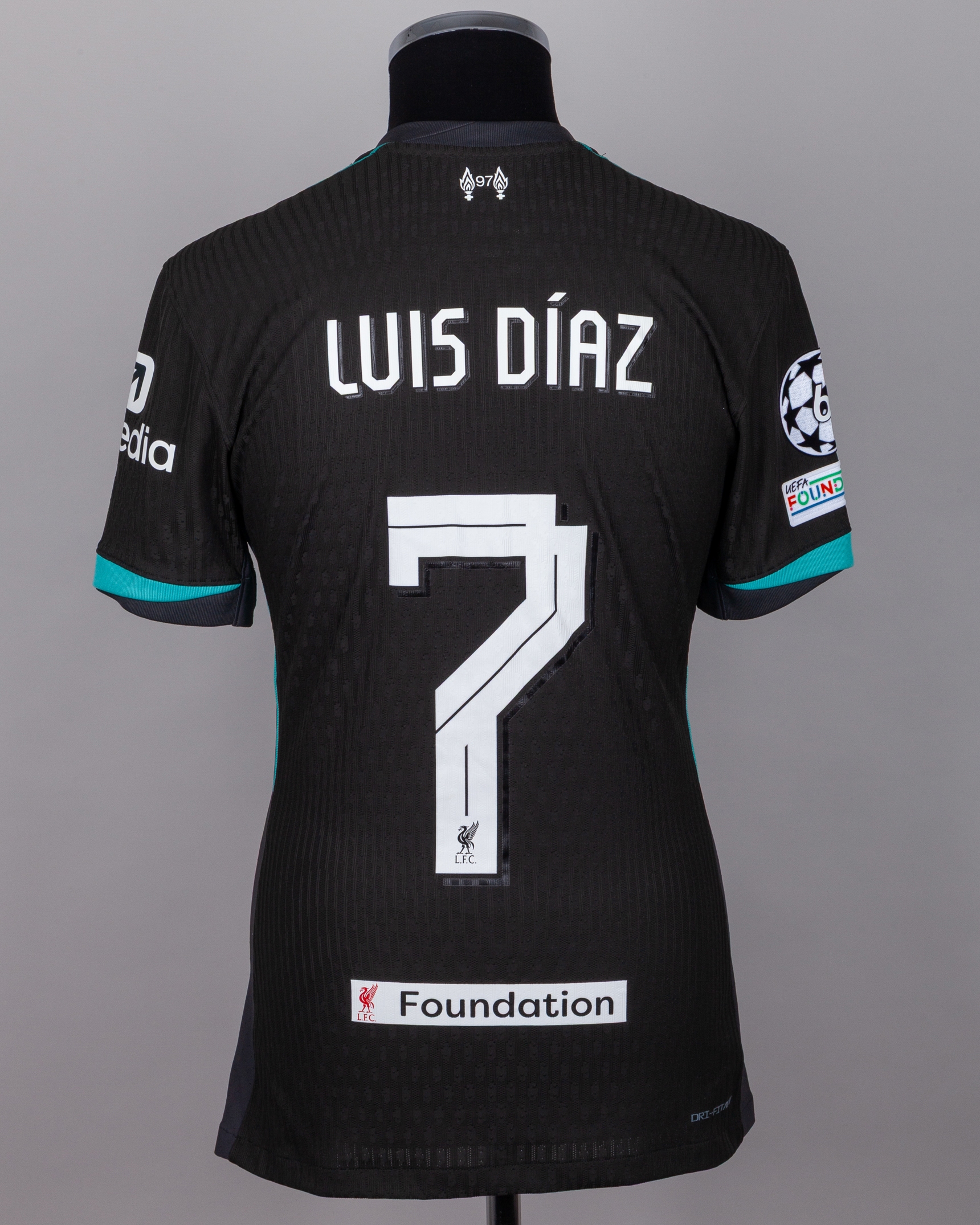 Luis Diaz black and green No.7 Liverpool v. AC Milan match issued short-sleeved shirt, 2024, Nike, M, with crew-neck collar and printed badge, the reverse lettered LUIS DIAZ, the right sleeve with Champions League flash