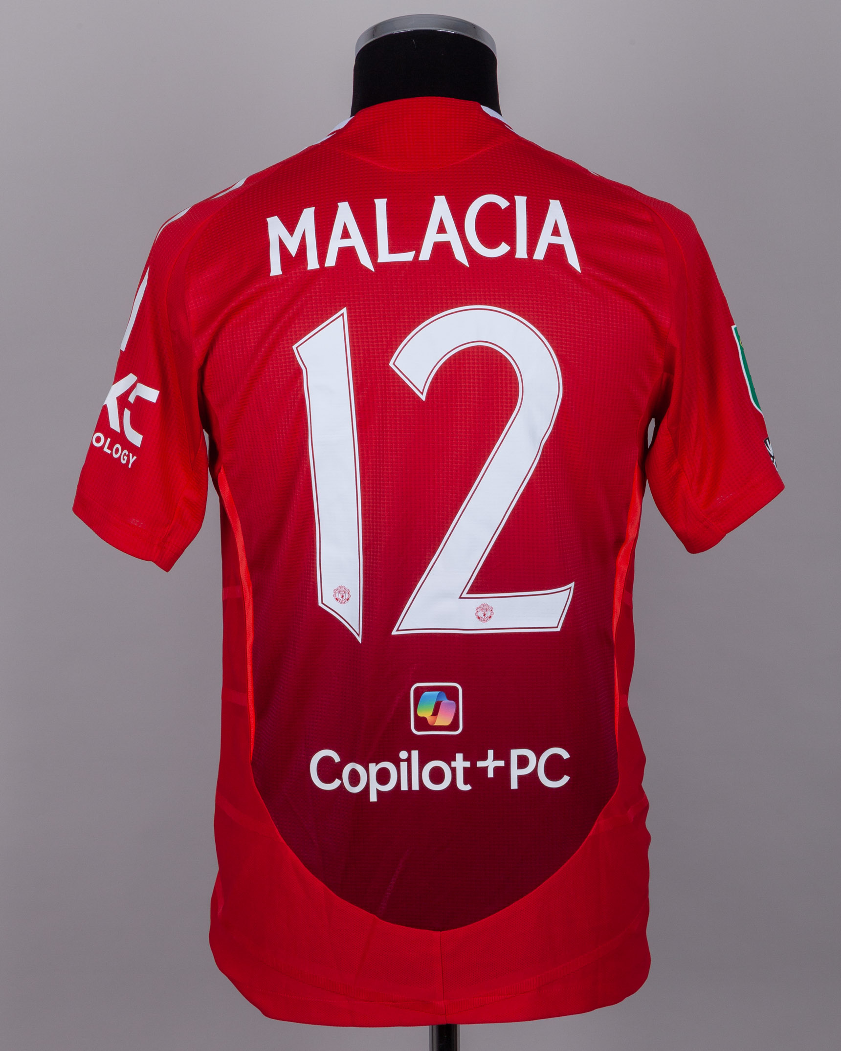 Tyrell Malacia red No.12 Manchester United v. Tottenham Hotspur short-sleeved shirt, 2024, Adidas, M, with crew-neck collar and printed badge, the reverse lettered MALACIA, the right sleeve with Carabao Cup flash
