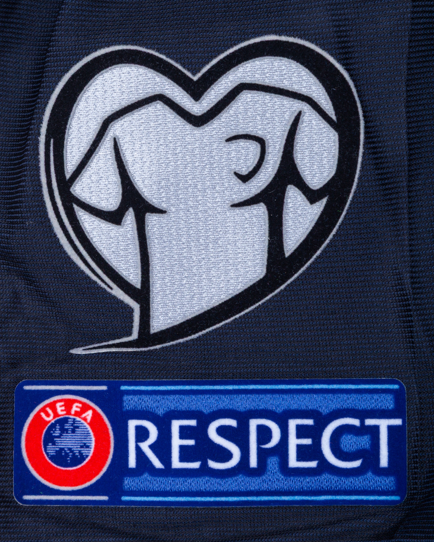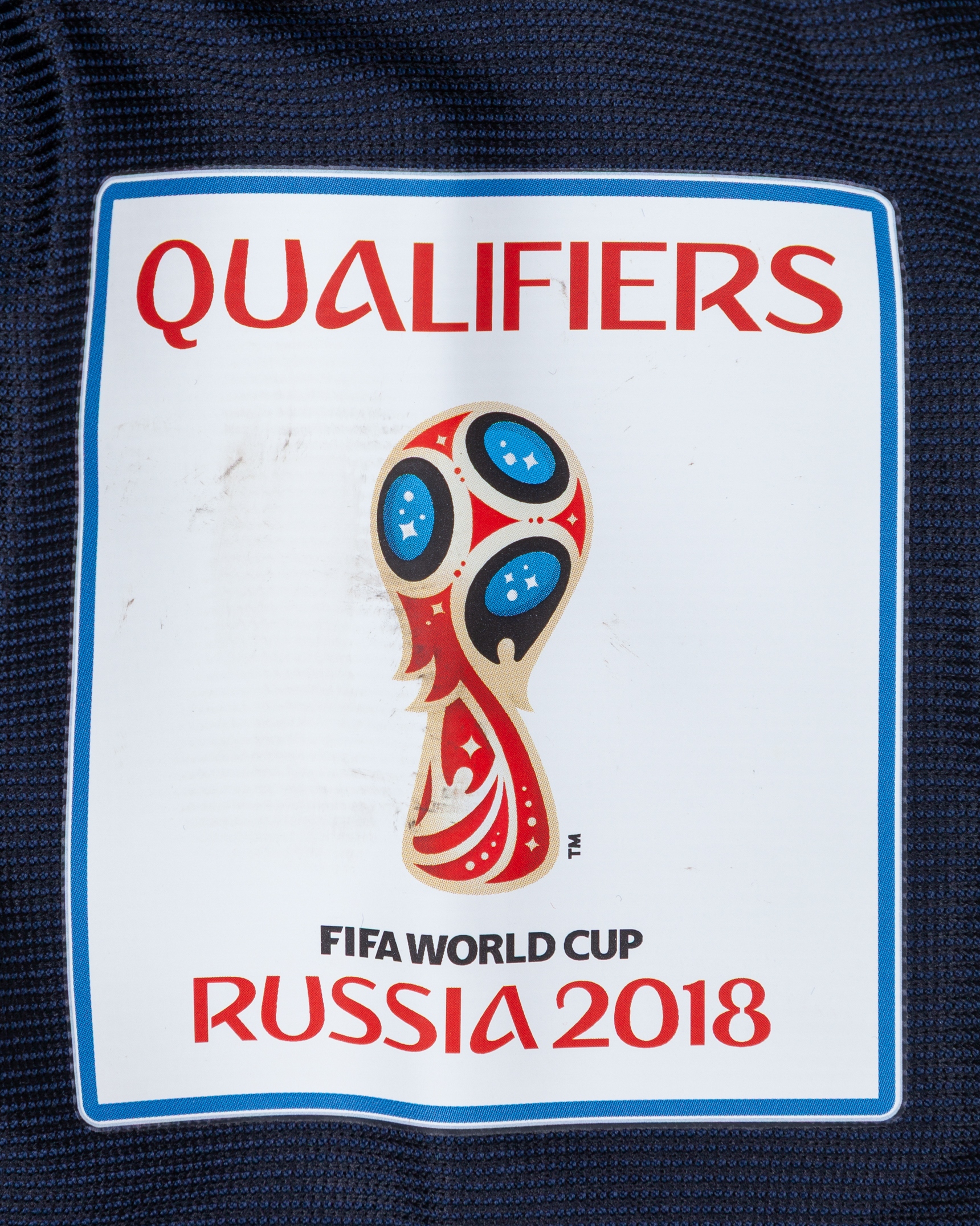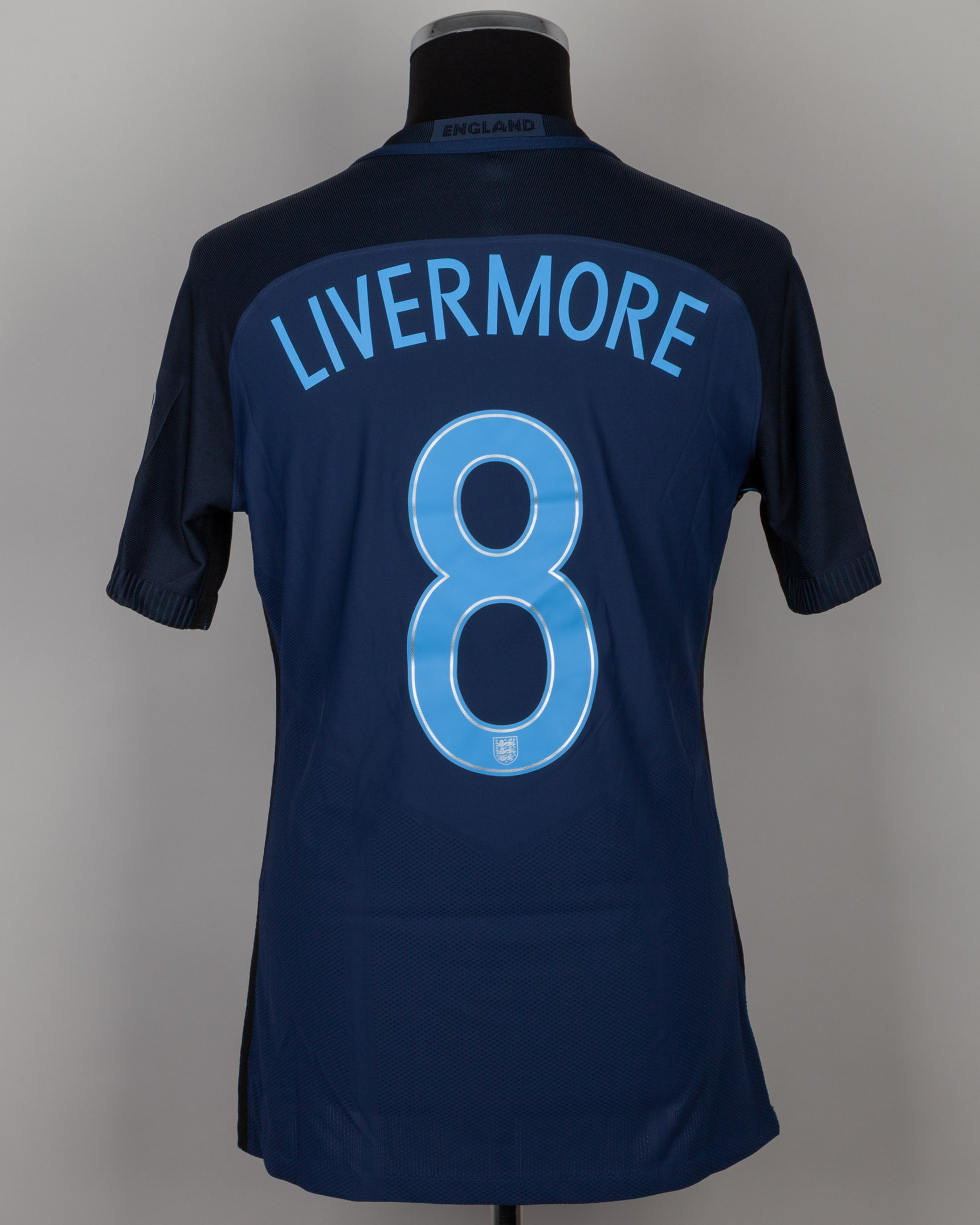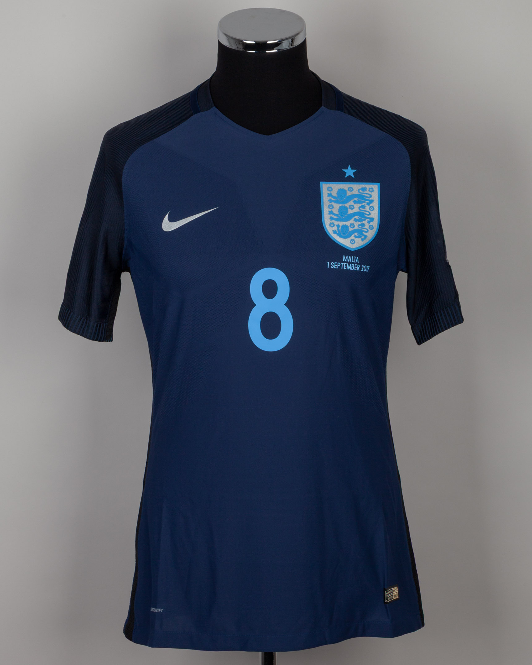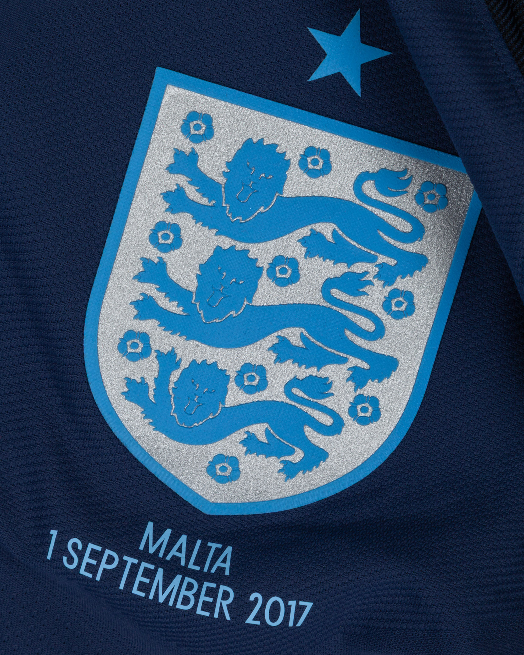 Jake Livermore navy No.8 England v. Malta short-sleeved shirt, 2017, Nike, L, with v-neck collar and printed badge, with MALTA 1 SEPTEMBER 2017 decal, the reverse lettered LIVERMORE, the right sleeve with 2018 World Cup qualifier flash and the left sleeve with respect flash