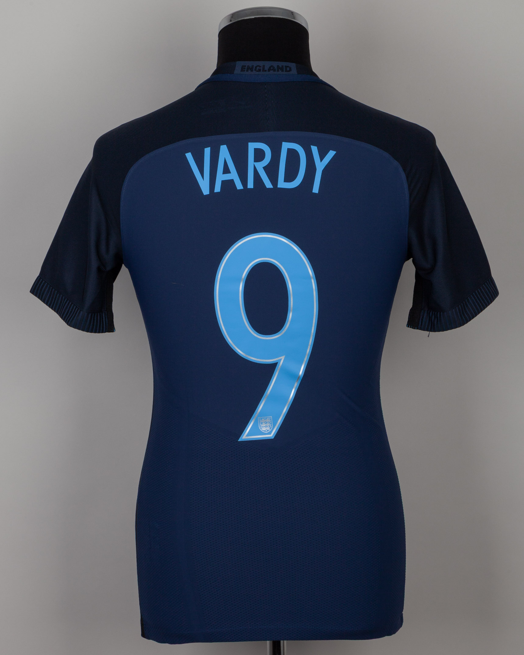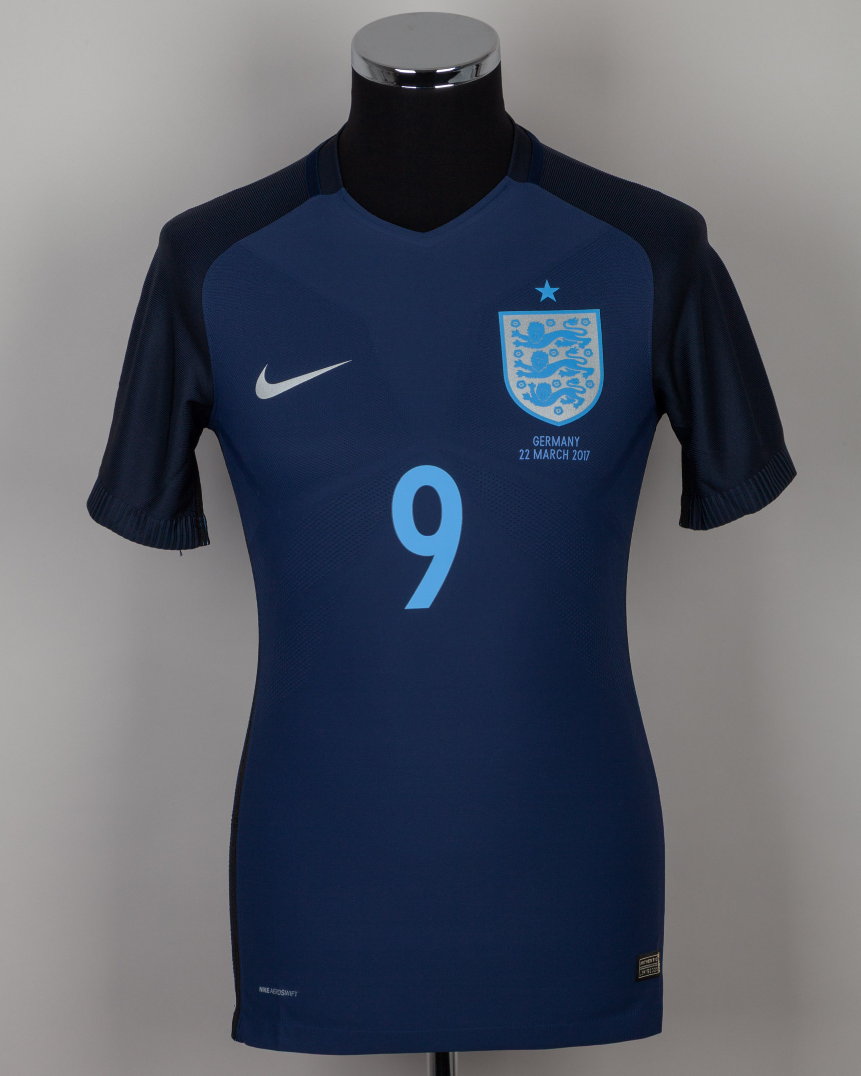 Jamie Vardy navy No.9 England v. Germany short-sleeved shirt, 2017, Nike, S, with v-neck collar and printed badge, with GERMANY 22 MARCH 2017 decal, the reverse lettered VARDY