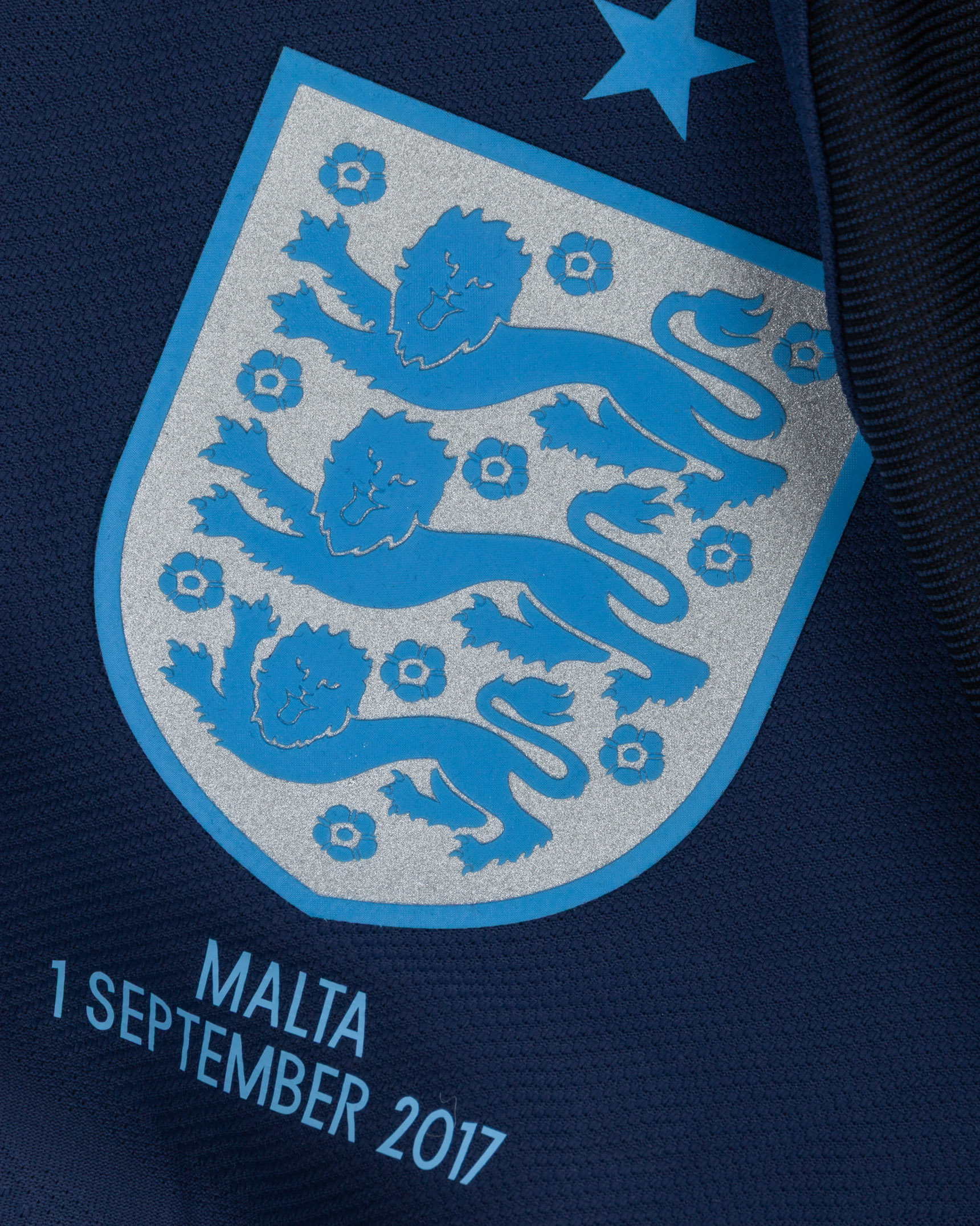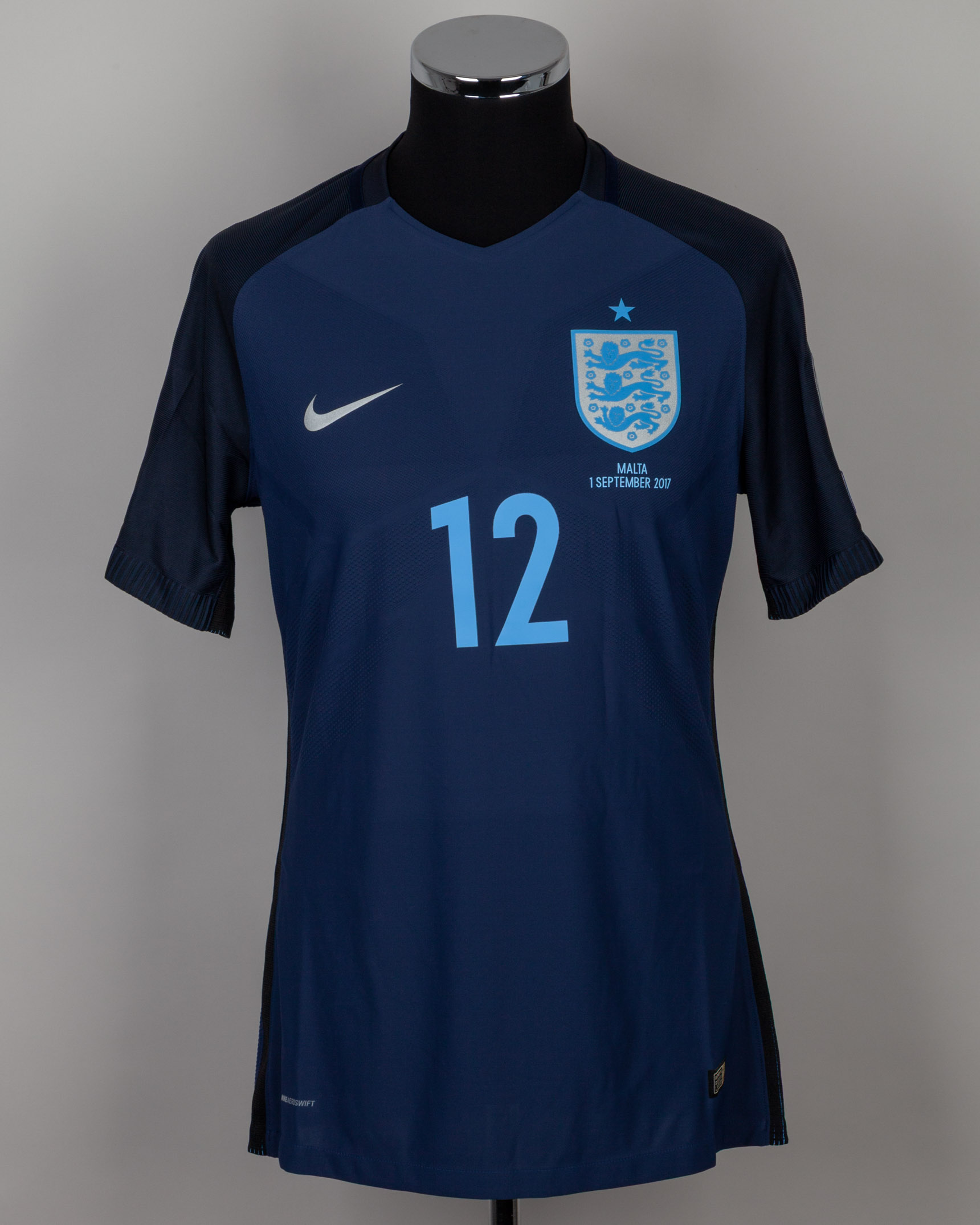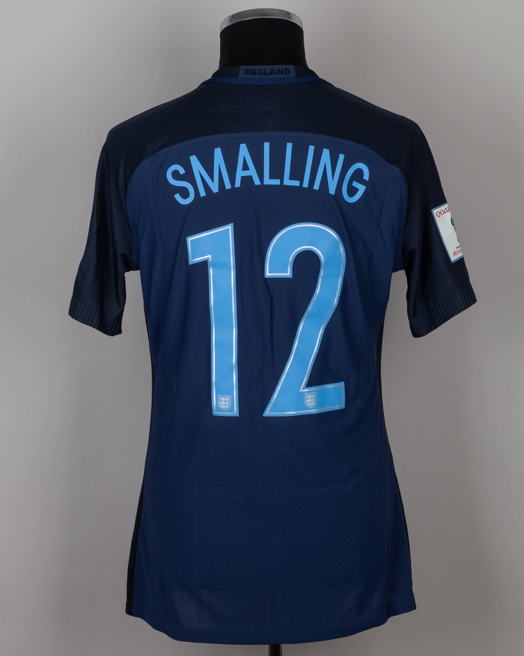 Chris Smalling navy No.12 England v. Malta short-sleeved shirt, 2017, Nike, L, with v-neck collar and printed badge, with MALTA 1 SEPTEMBER 2017 decal, the reverse lettered SMALLING, the right sleeve with qualifiers FIFA World Cup Russia 2018 flash and the left with respect flash