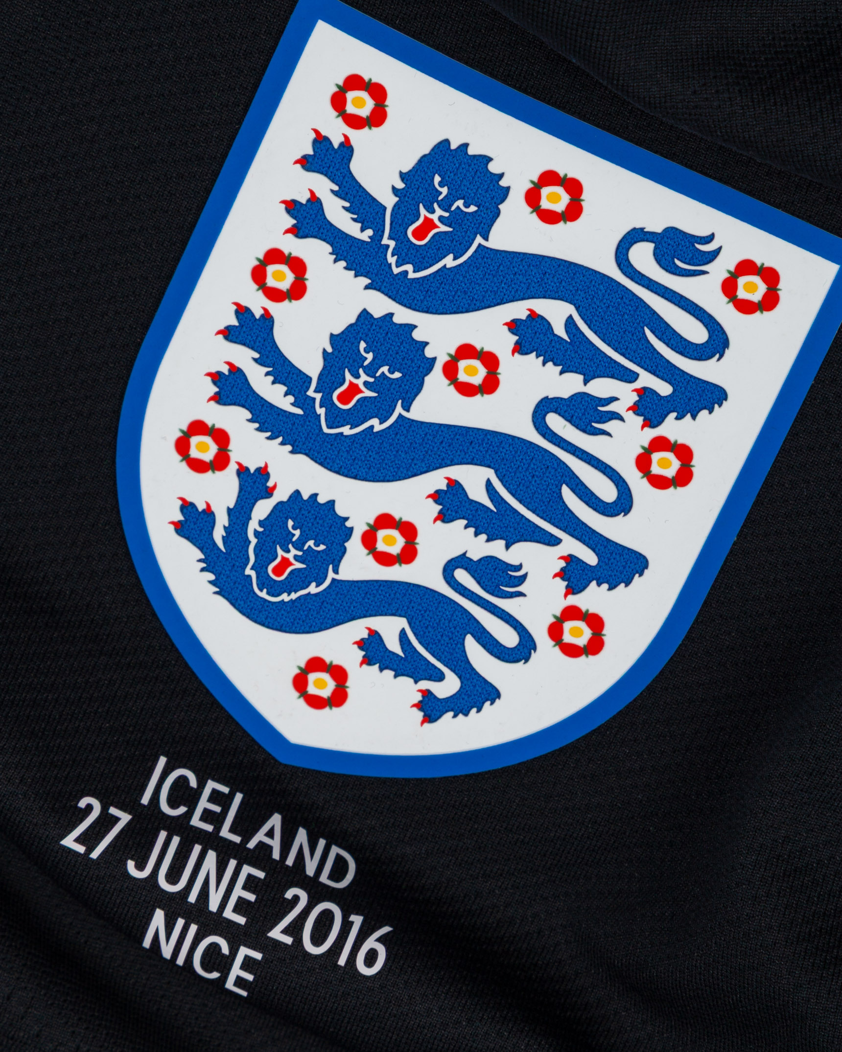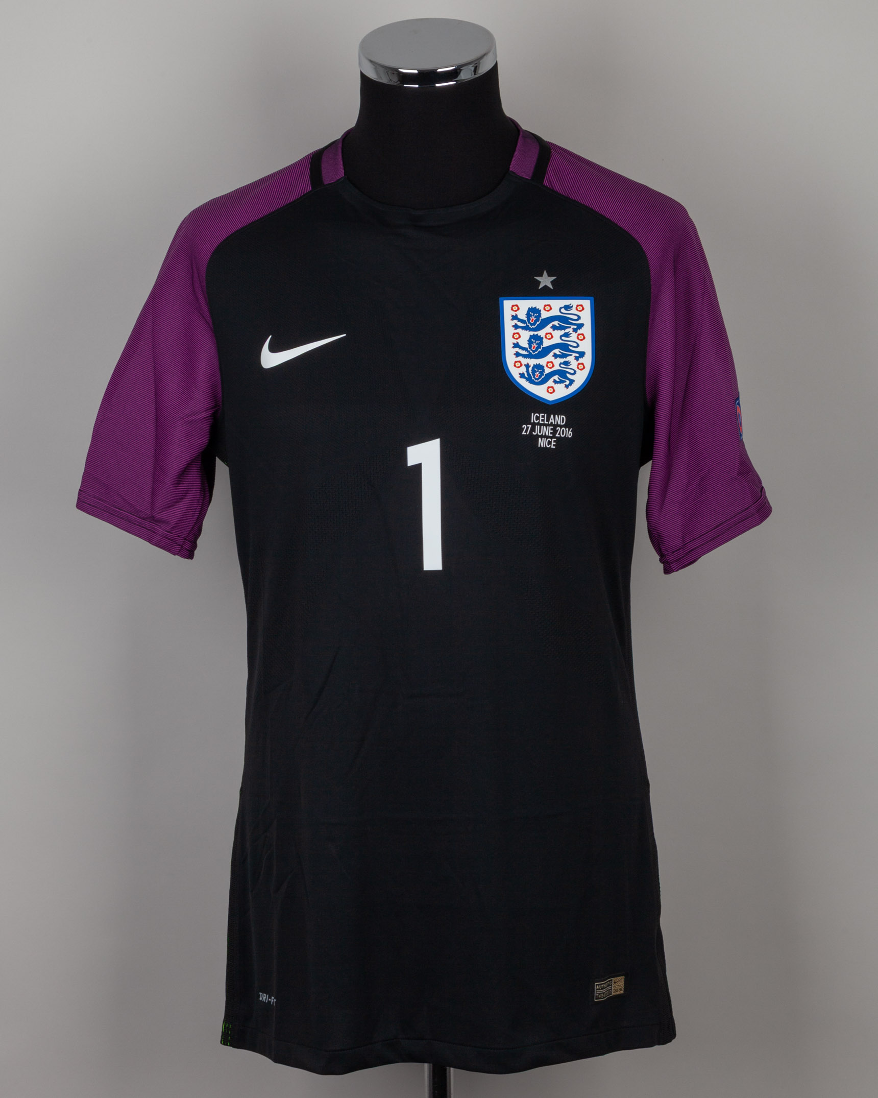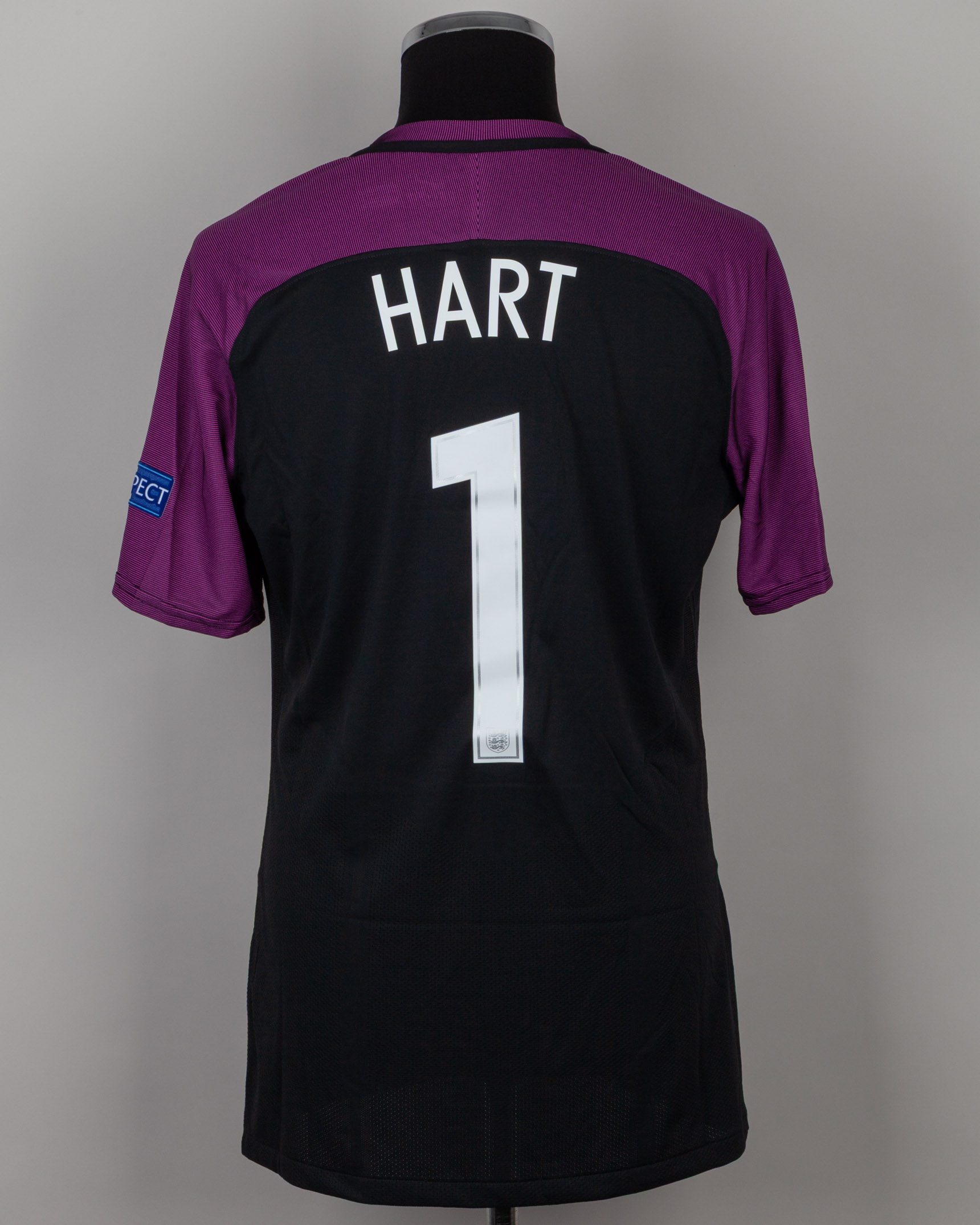 Joe Hart black and purple No.1 England v. Iceland short-sleeved shirt, 2016, Nike, L, with crew-neck collar and printed badge, with ICELAND 27 JUNE 2016 NICE decal, the reverse lettered HART, the right sleeve with Euro Championship 2016 flash and the left sleeve with respect flash