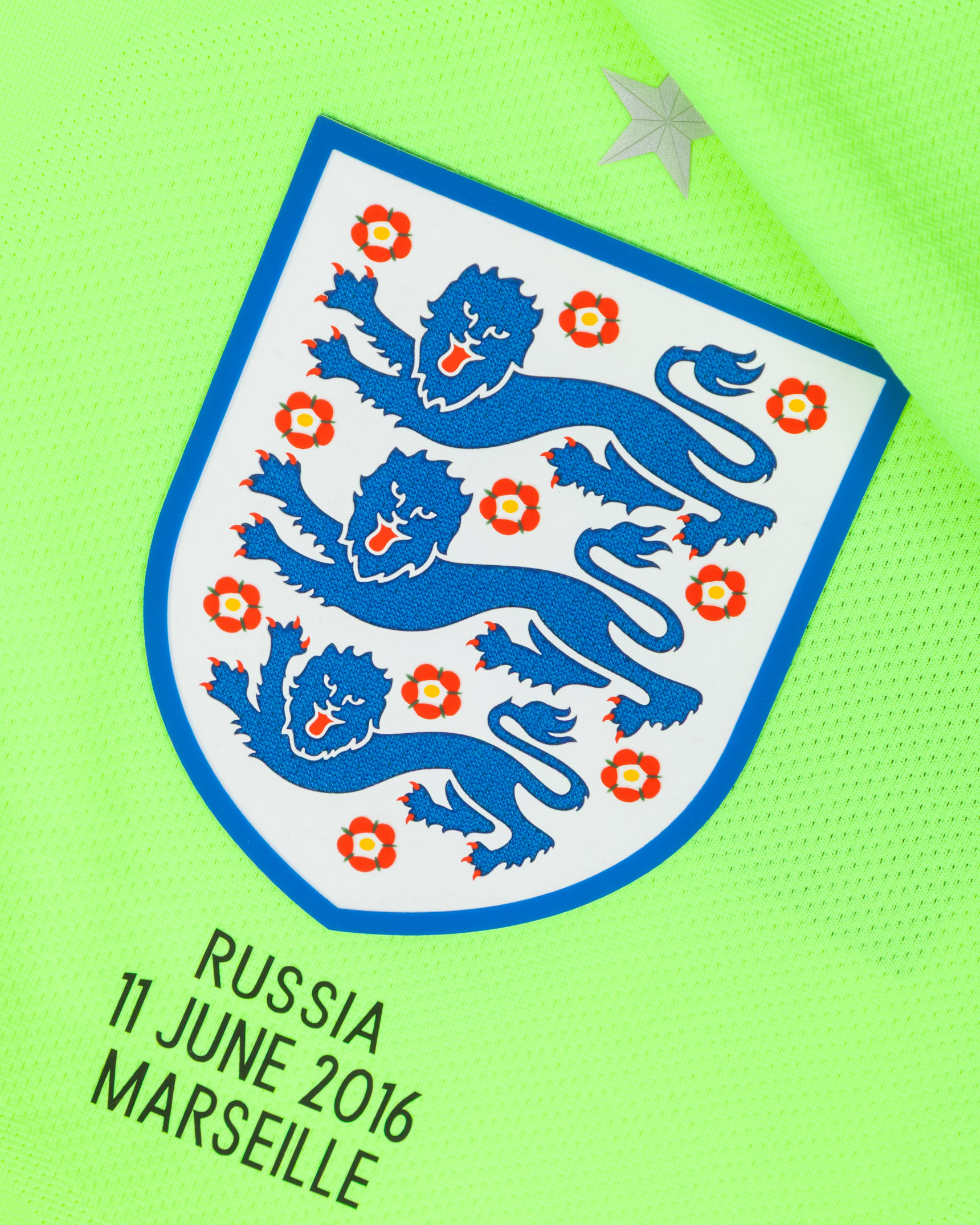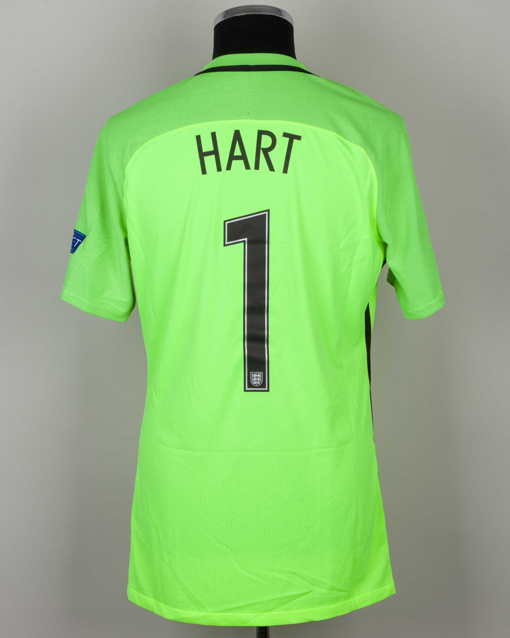 Joe Hart yellow and black No.1 England v. Russia short-sleeved shirt, 2016, Nike, L, with crew-neck collar and printed badge, with RUSSIA 11 JUNE 2016 MARSEILLE decal, the reverse lettered HART, the right sleeve with Euro Championship 2016 flash and the left sleeve with respect flash