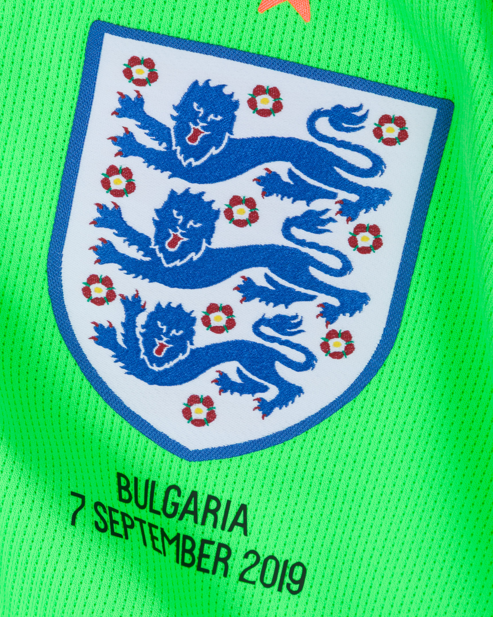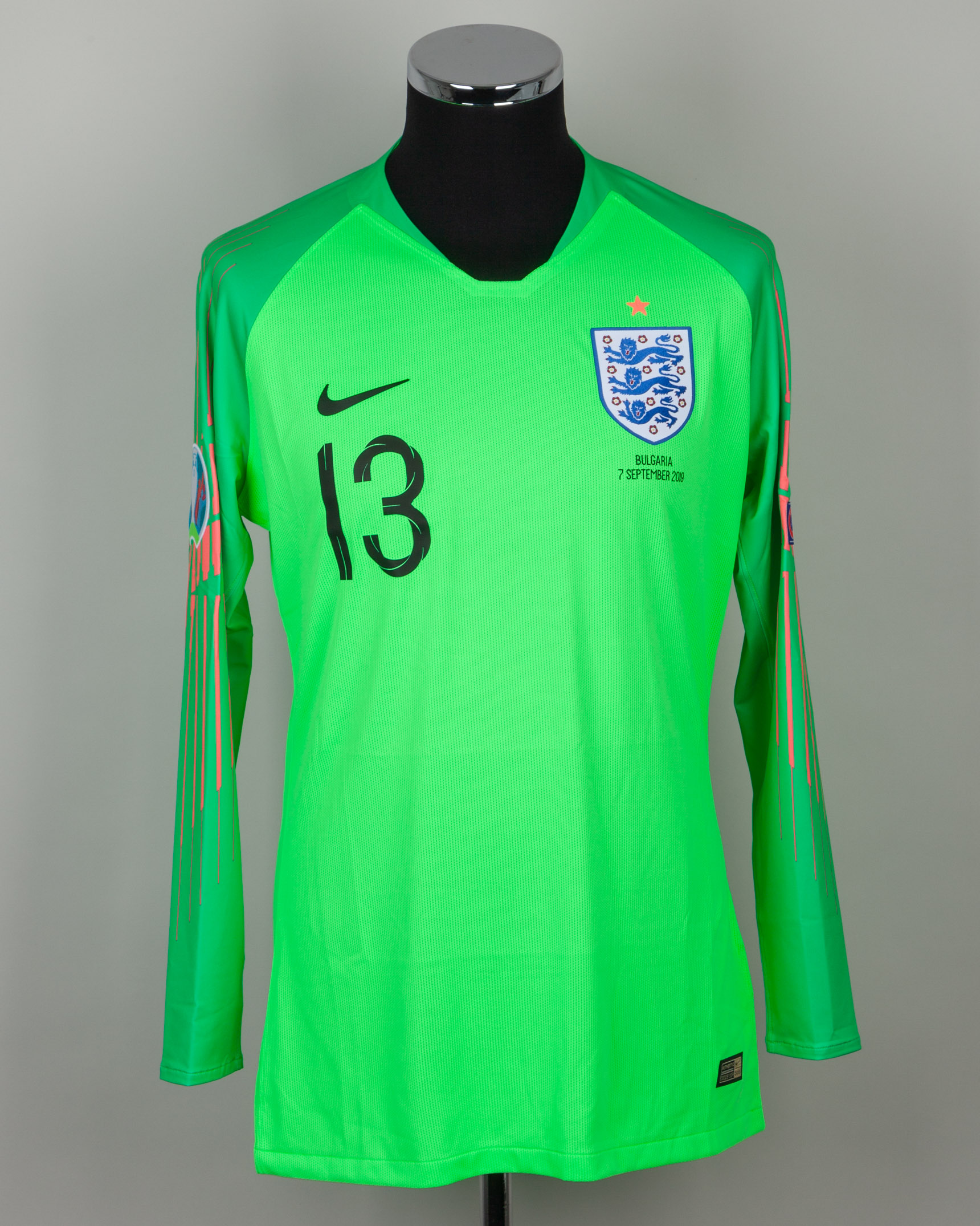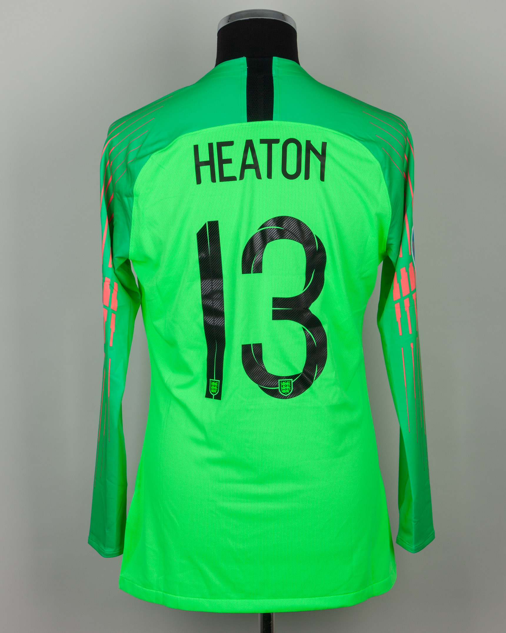 Tom Heaton green and pink No.13 England v. Kosovo keeper shirt, 2019, Nike, L, with v-neck collar and printed badge, with BULGARIA 7 SEPTEMBER 2019 decal, the reverse lettered HEATON, the right sleeve with Euro 2020 flash and the left sleeve with respect flash