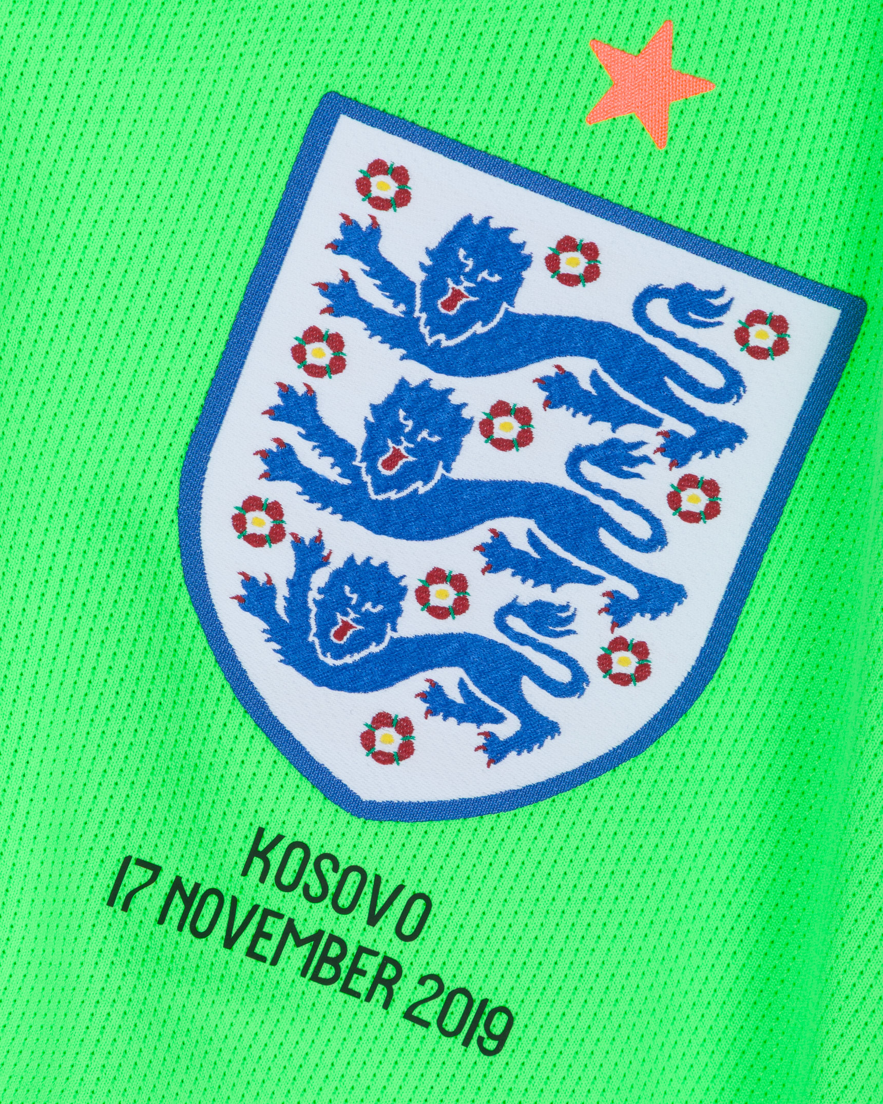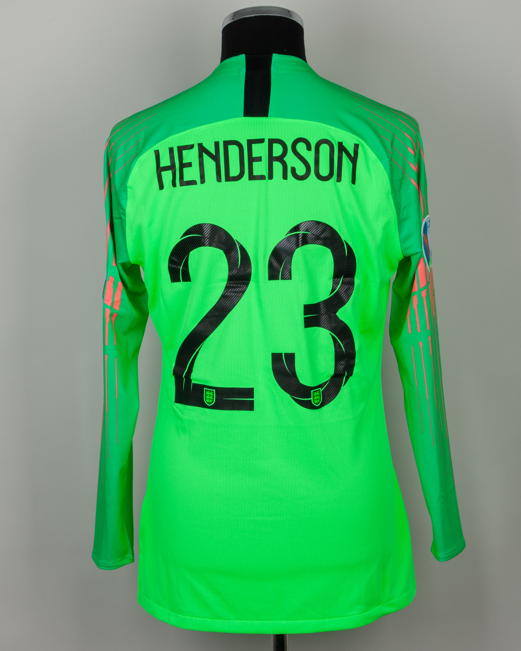 Dean Henderson green and pink No.23 England v. Kosovo long-sleeved shirt, 2019, Nike, L, with v-neck collar and printed badge, with KOSOVO 17 NOVEMBER 2019 decal, the reverse lettered HENDERSON, the right sleeve with Euro 2020 flash and the left sleeve with respect flash
