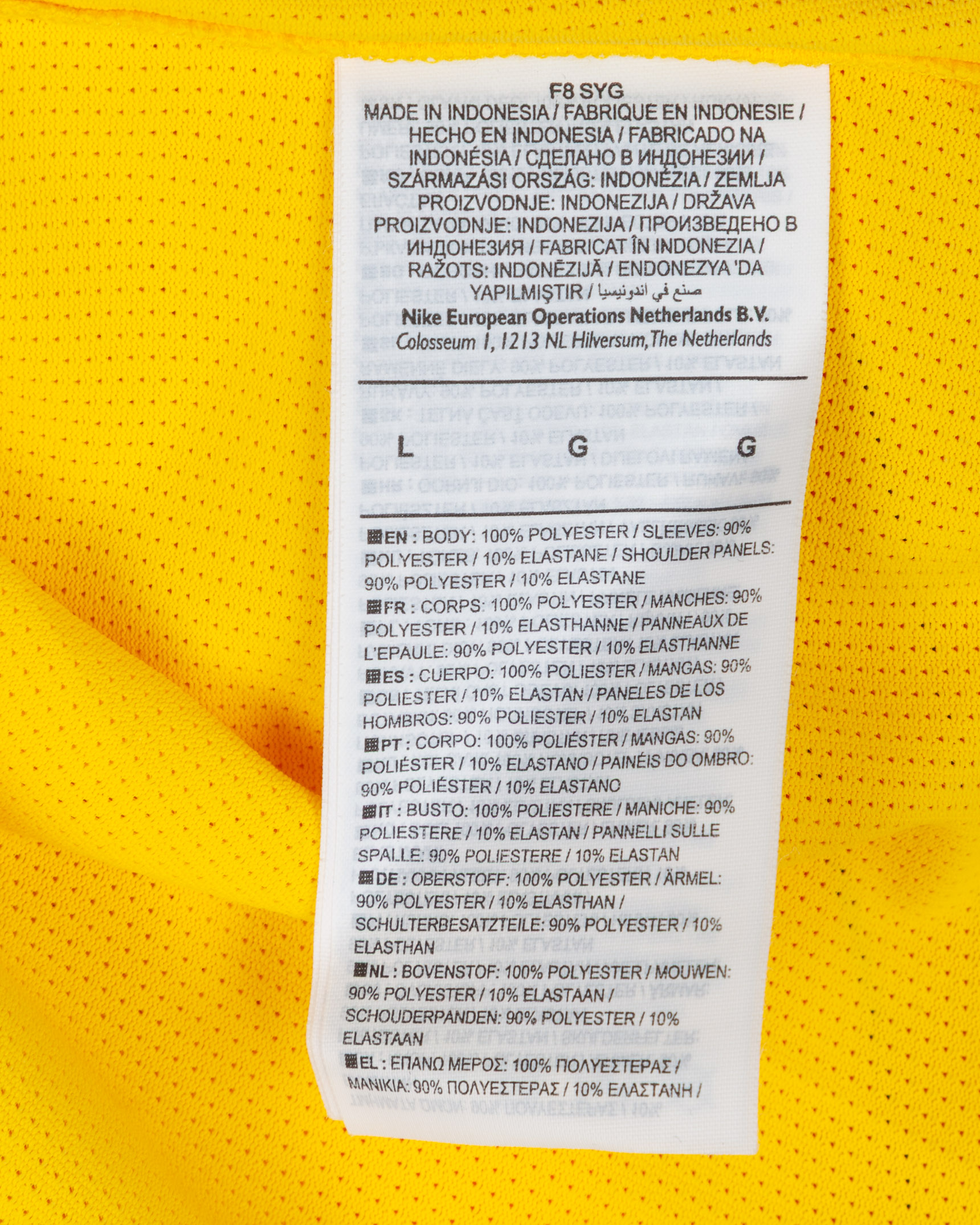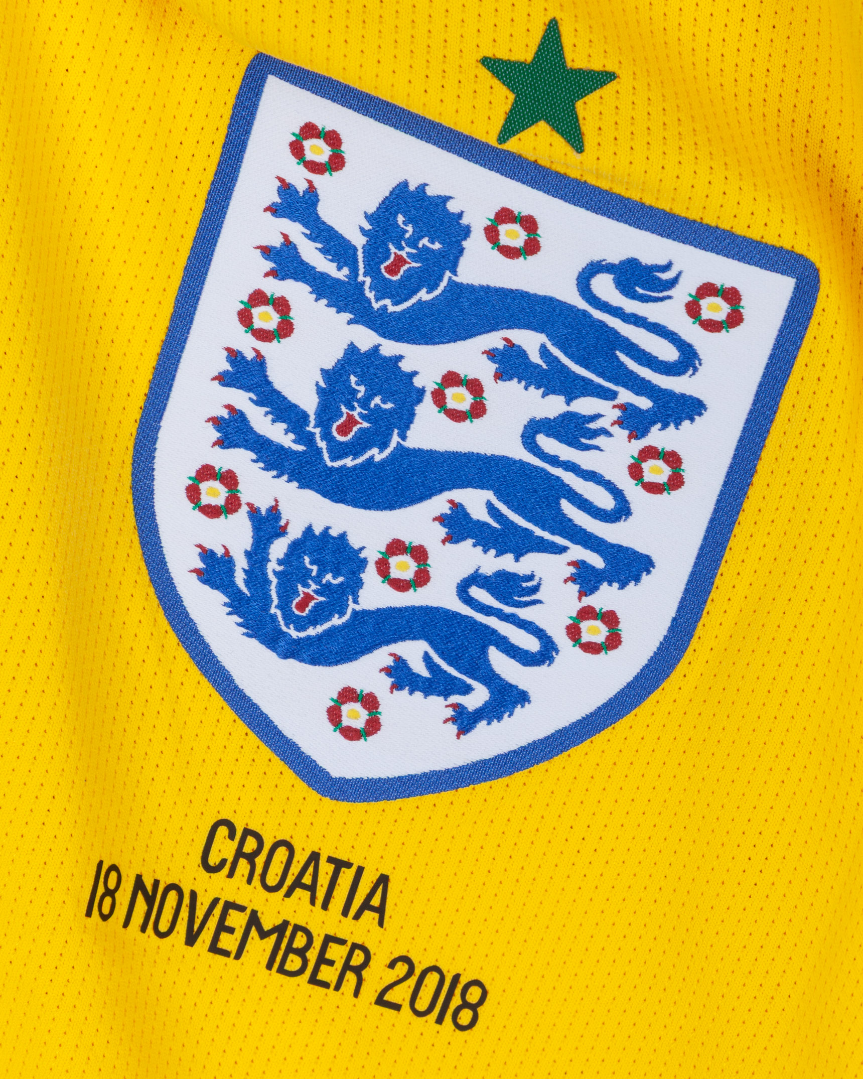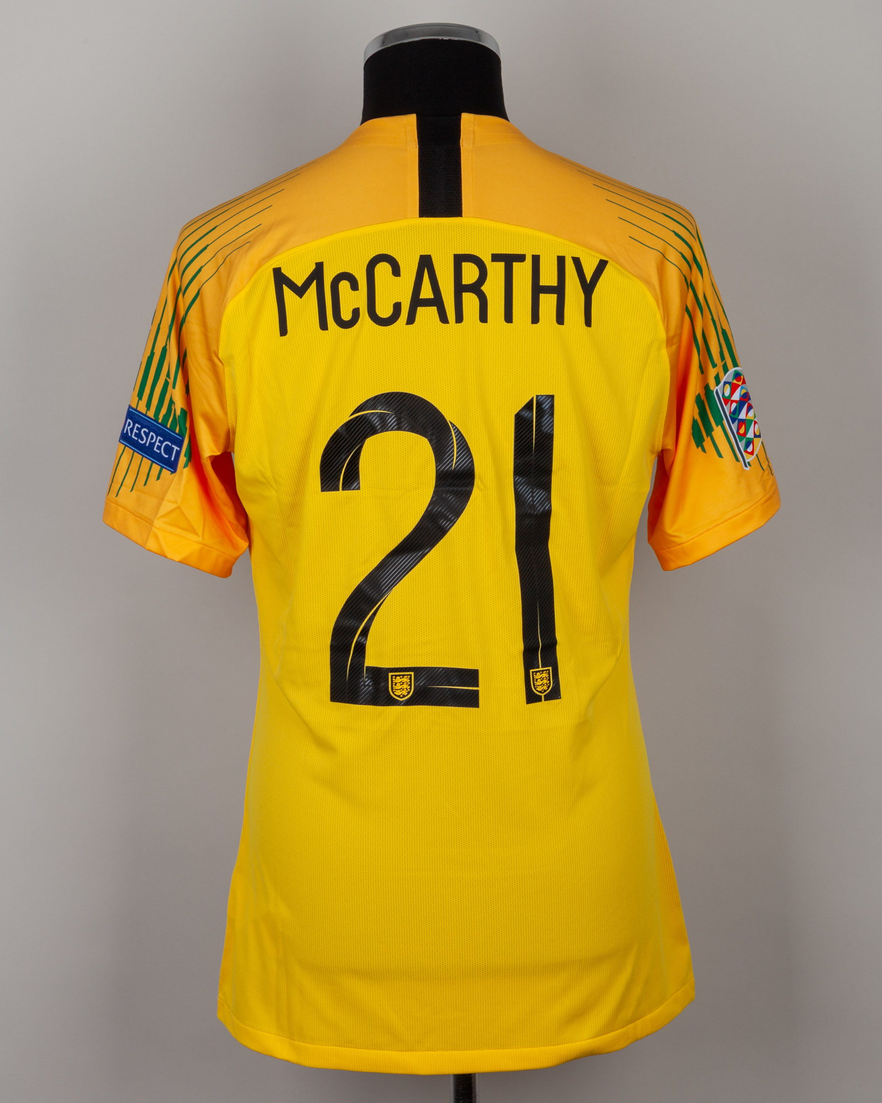 Alex McCarthy yellow and green No.21 England v. Croatia short-sleeved shirt, 2018, Nike, L, with v-neck collar and printed badge, with CROATIA 18 NOVEMBER 2018 decal, the reverse lettered McCARTHY, the right sleeve with Nations League flash and the left sleeve with respect flash