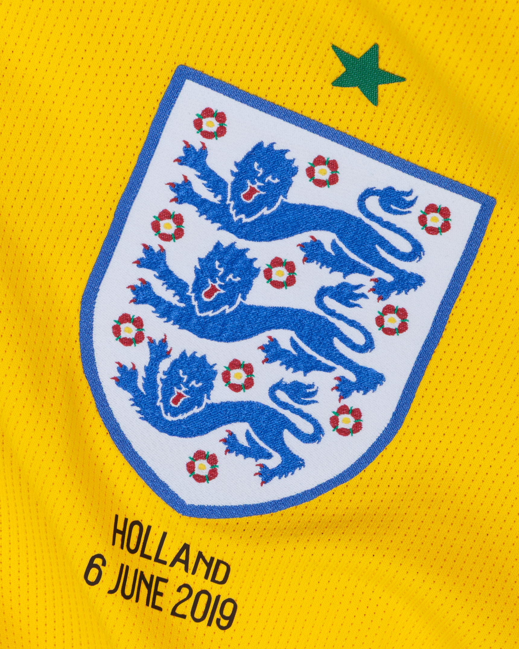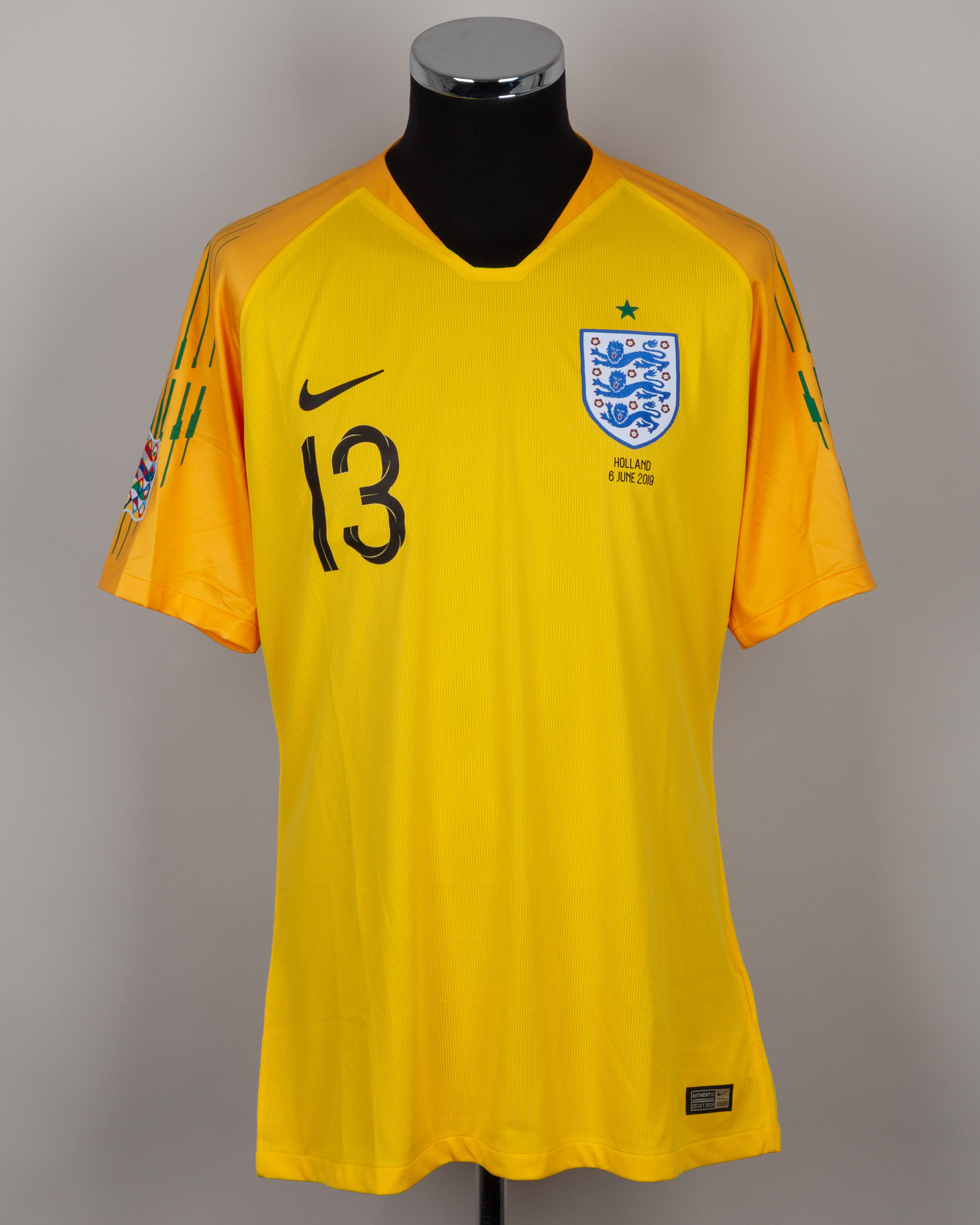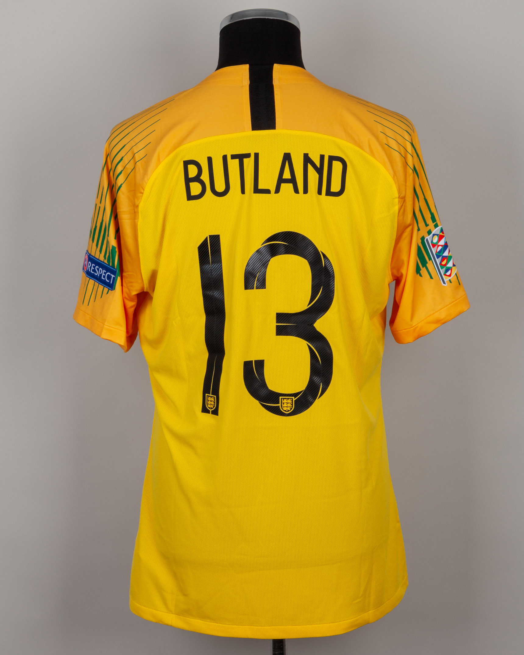 Jack Butland yellow and green No.13 England v. Holland short-sleeved shirt, 2019, Nike, XL, with v-neck collar and printed badge, with HOLLAND 6 JUNE 2019 decal, the reverse lettered BUTLAND, the right sleeve with Nations League flash and the left sleeve with respect flash